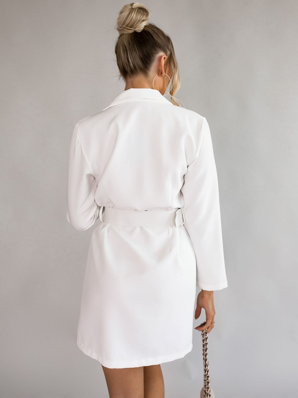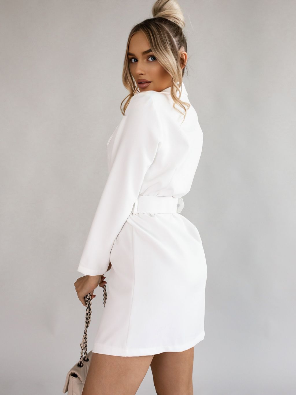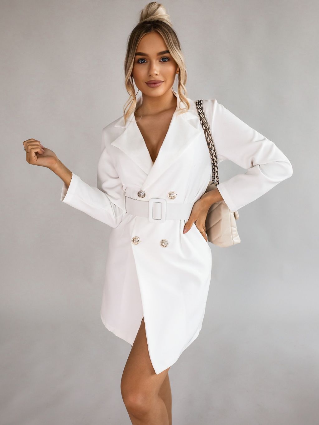 Bílé delší sako/šaty LARRY s páskem a ozdobnými knoflíky