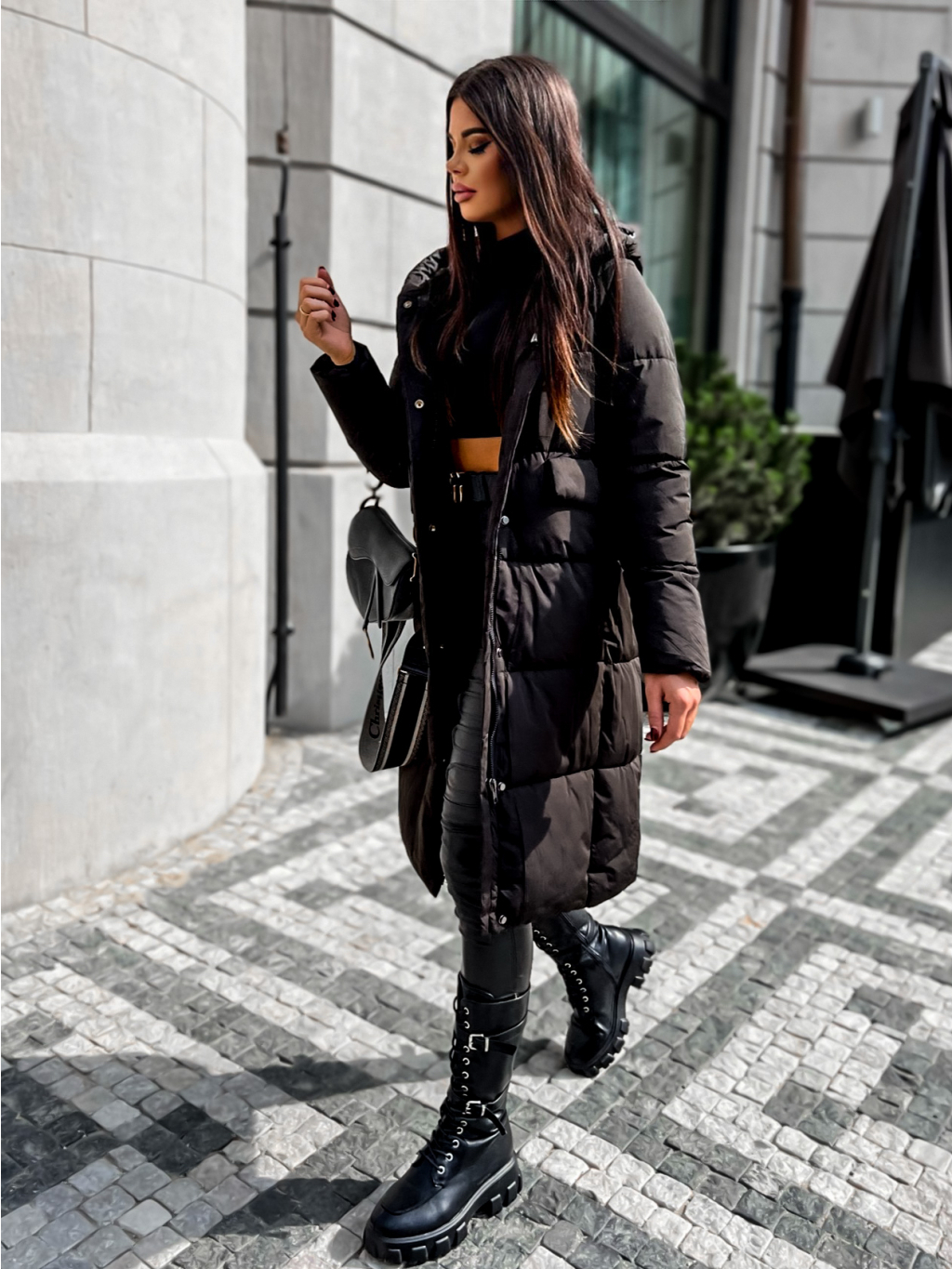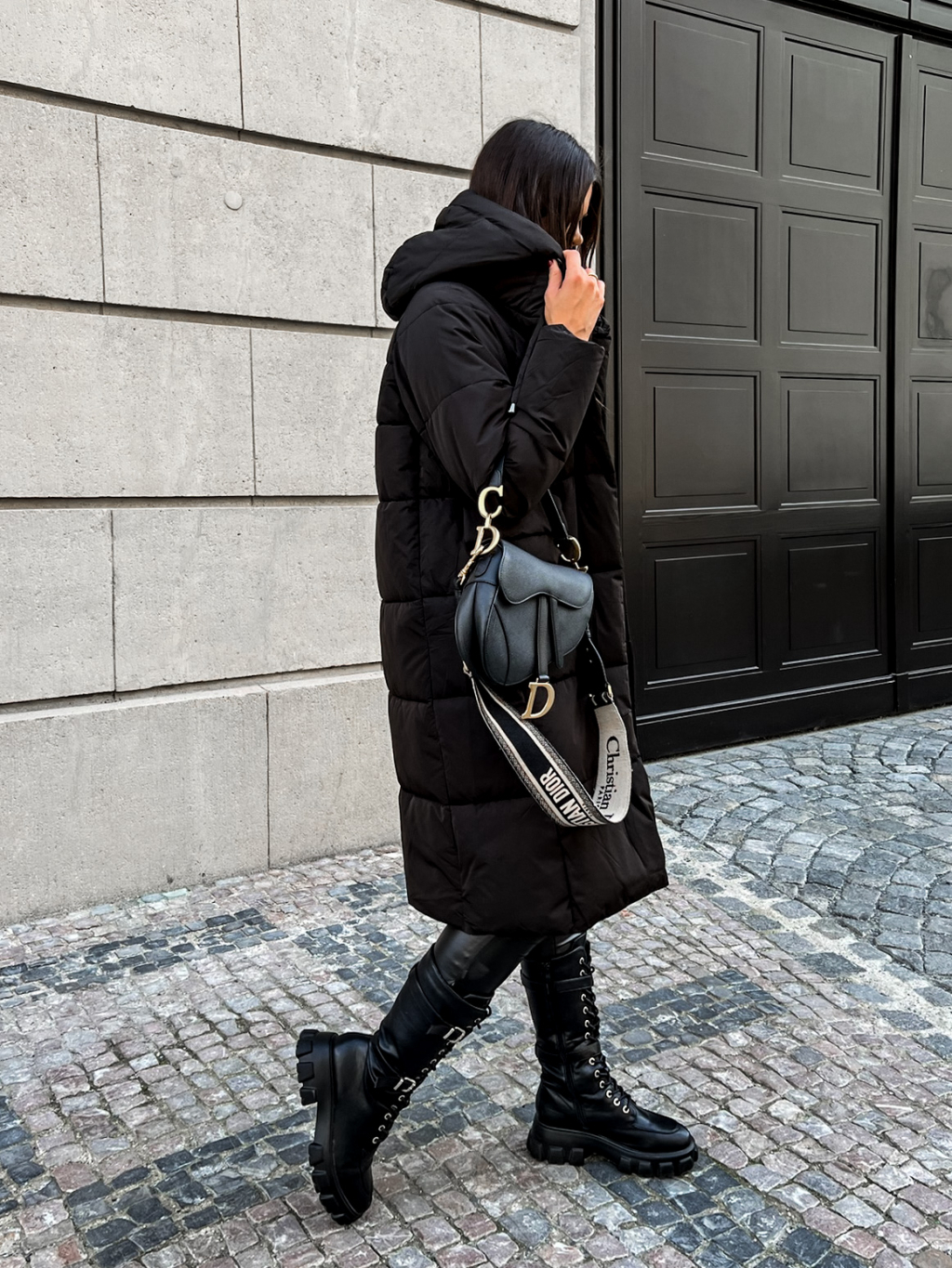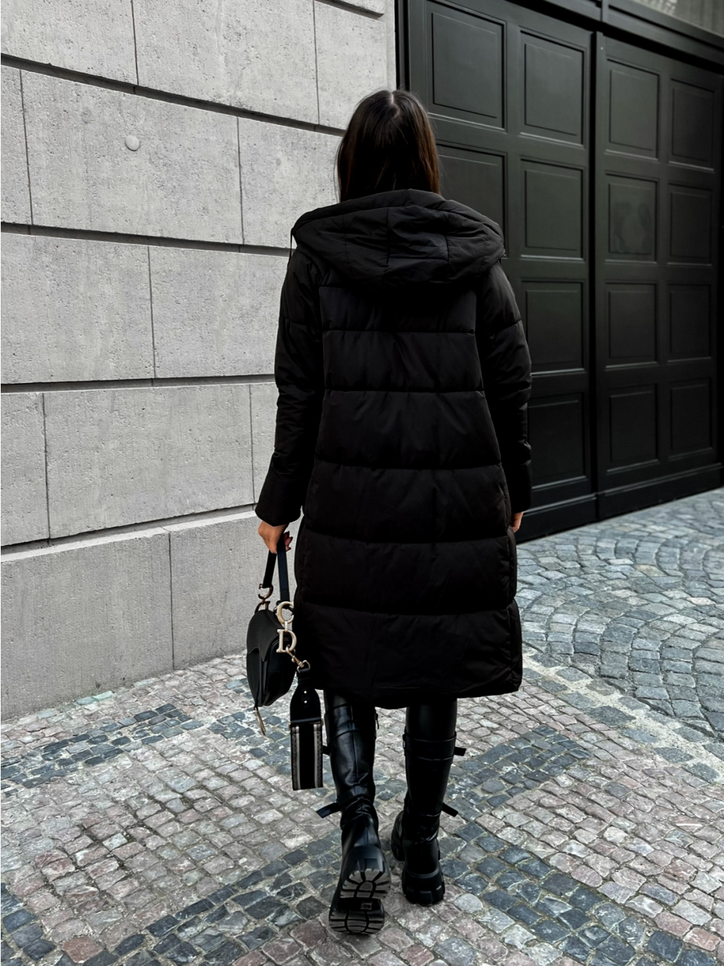 Černá dlouhá bunda SAPIN s kapucí a kapsami