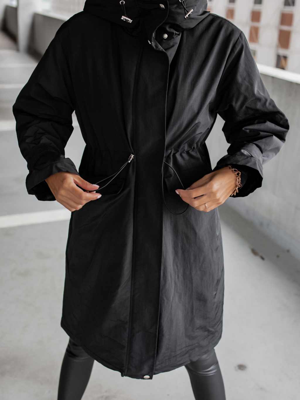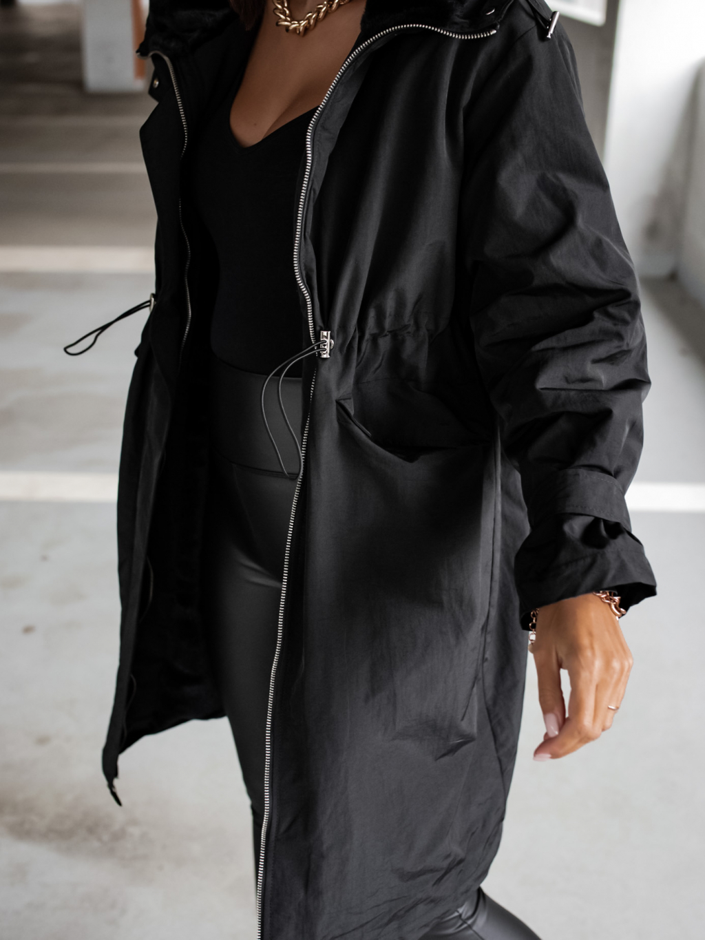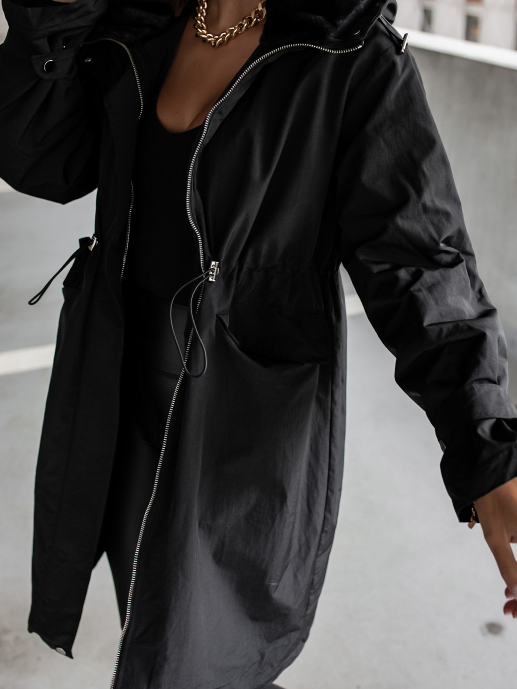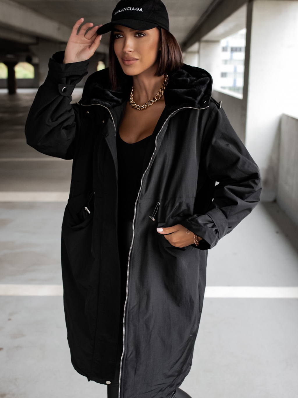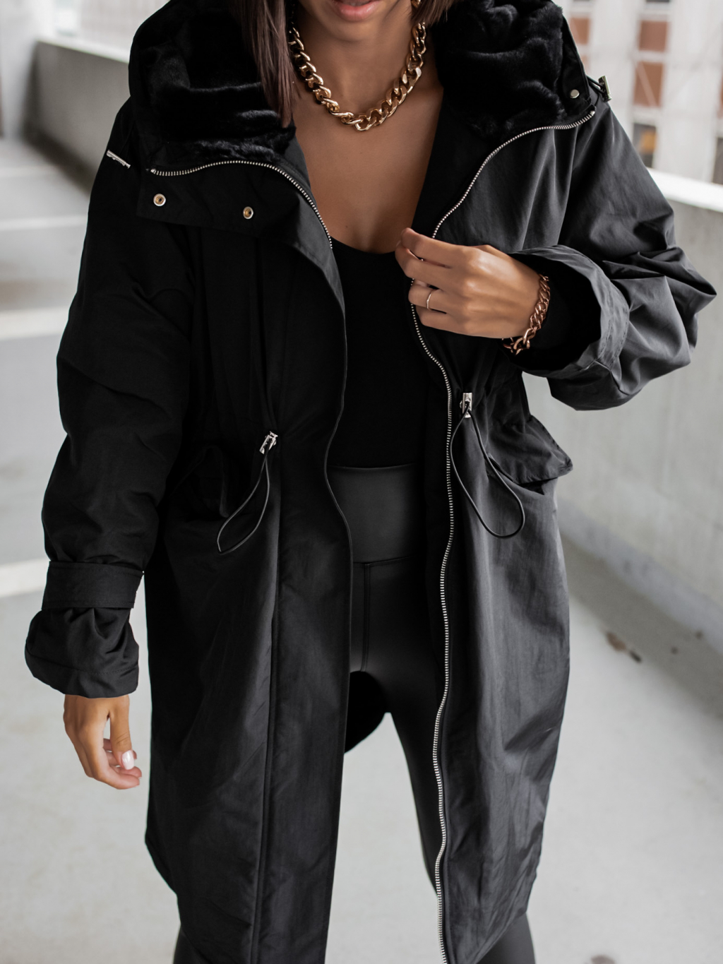 Uvnitř bundy je plyš (vhodnější je kombinovat s tmavším outfitem kvůli chloupkům z plyše). Nesporná výhoda je, že plyš krásně hřeje.