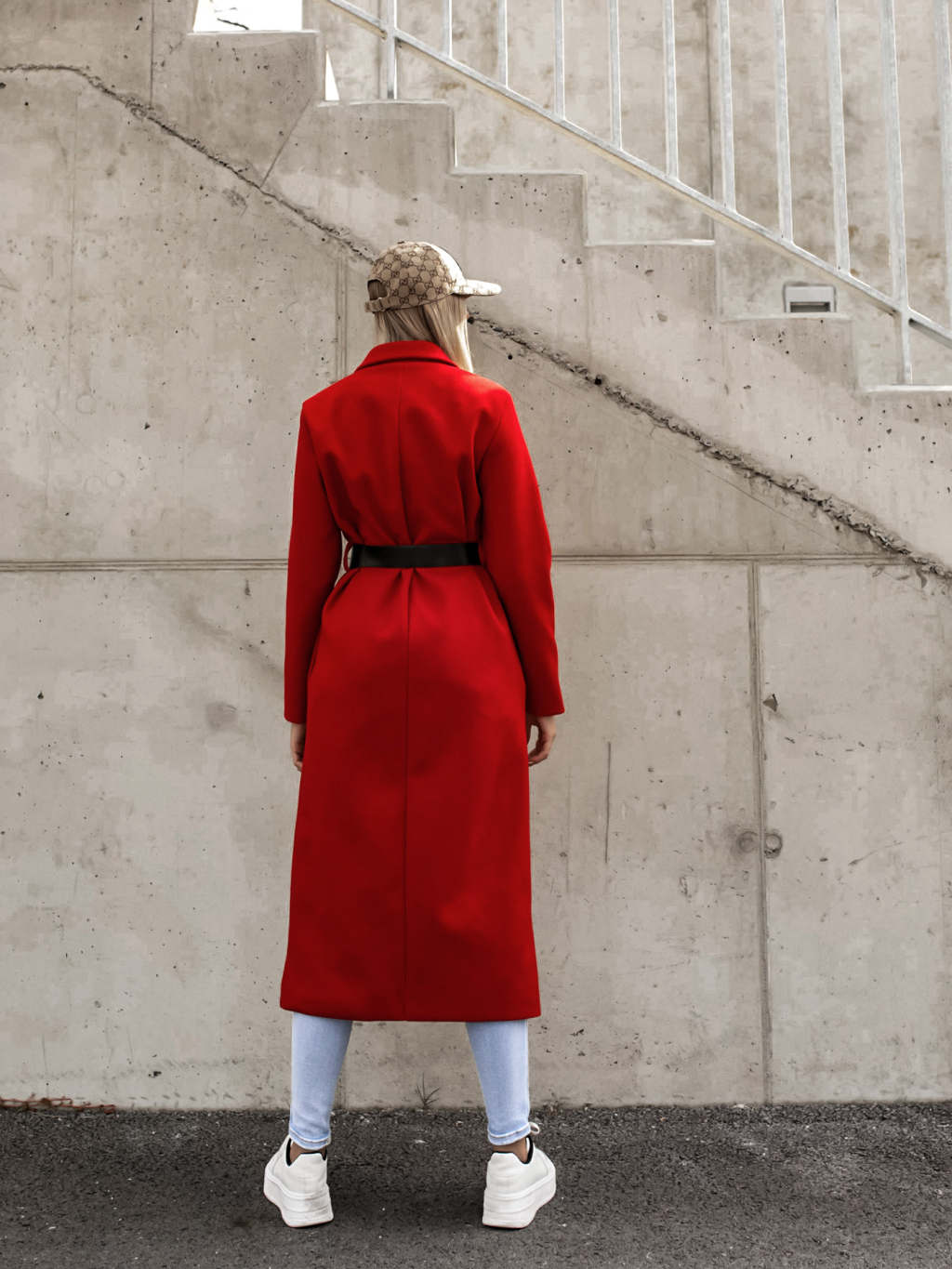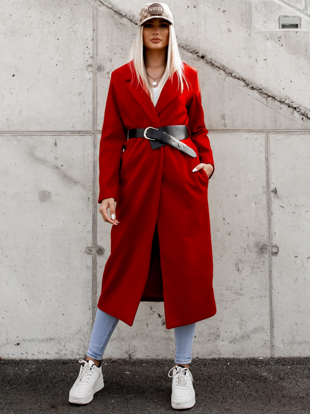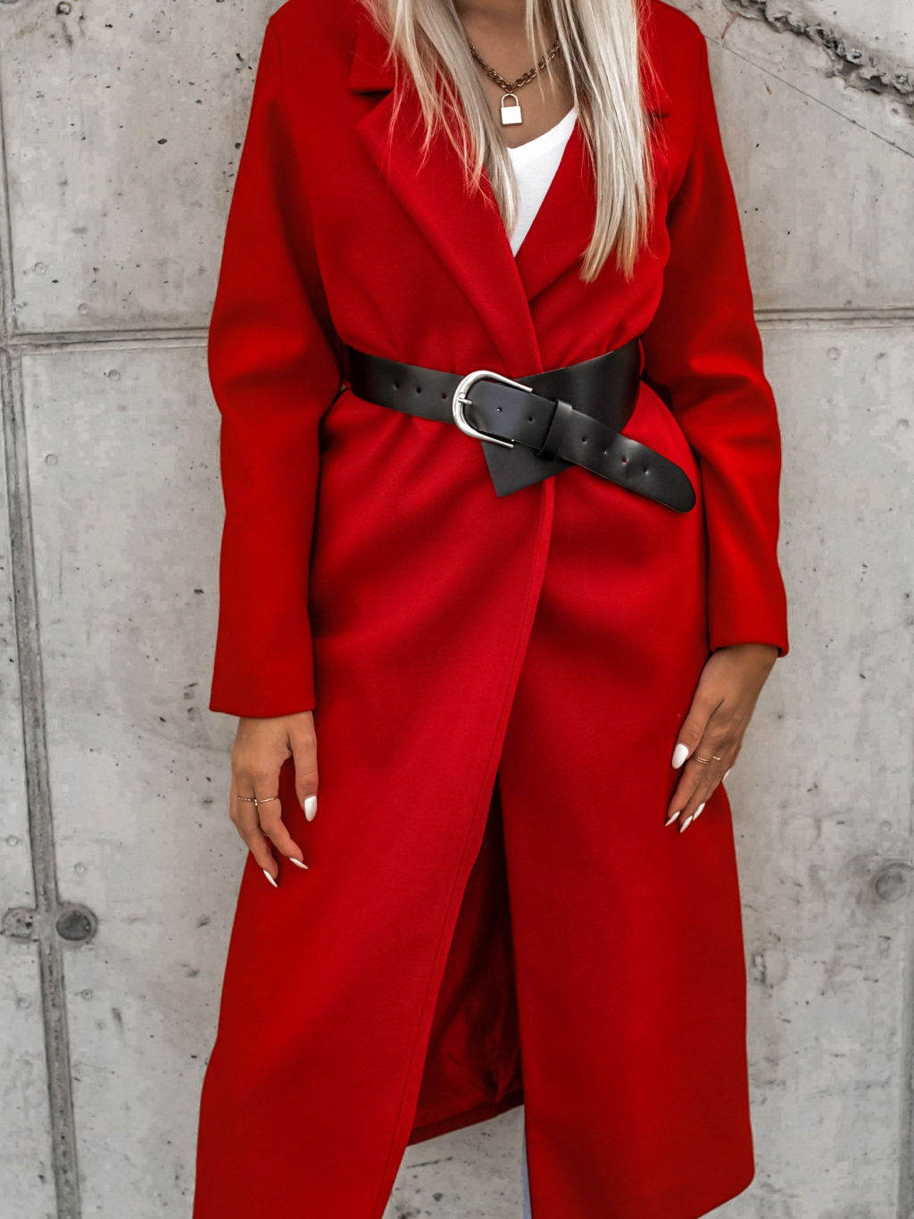 Červený delší kabát FEAT s asymetrickým páskem