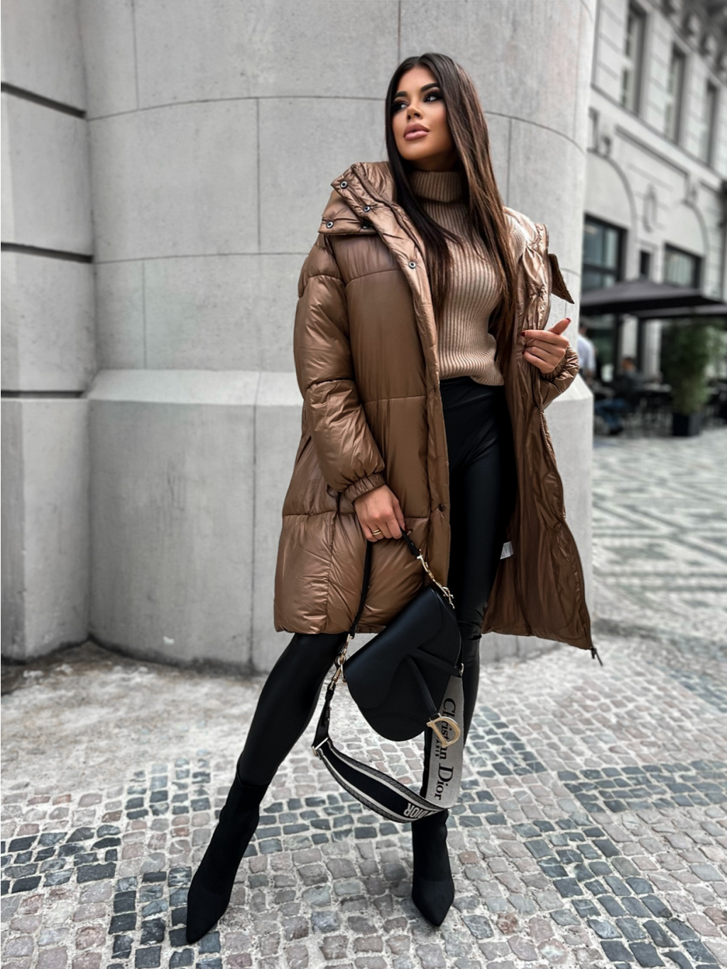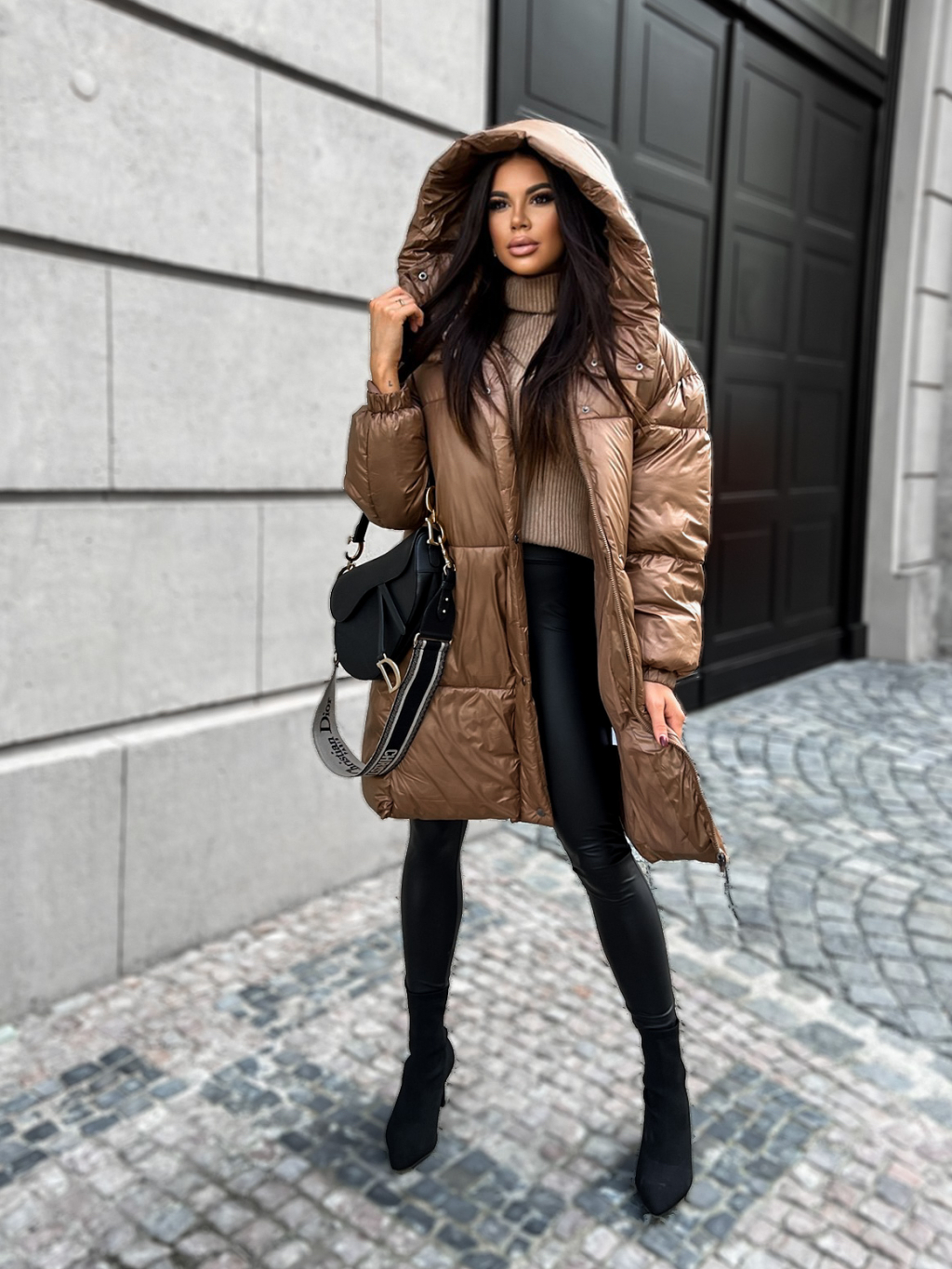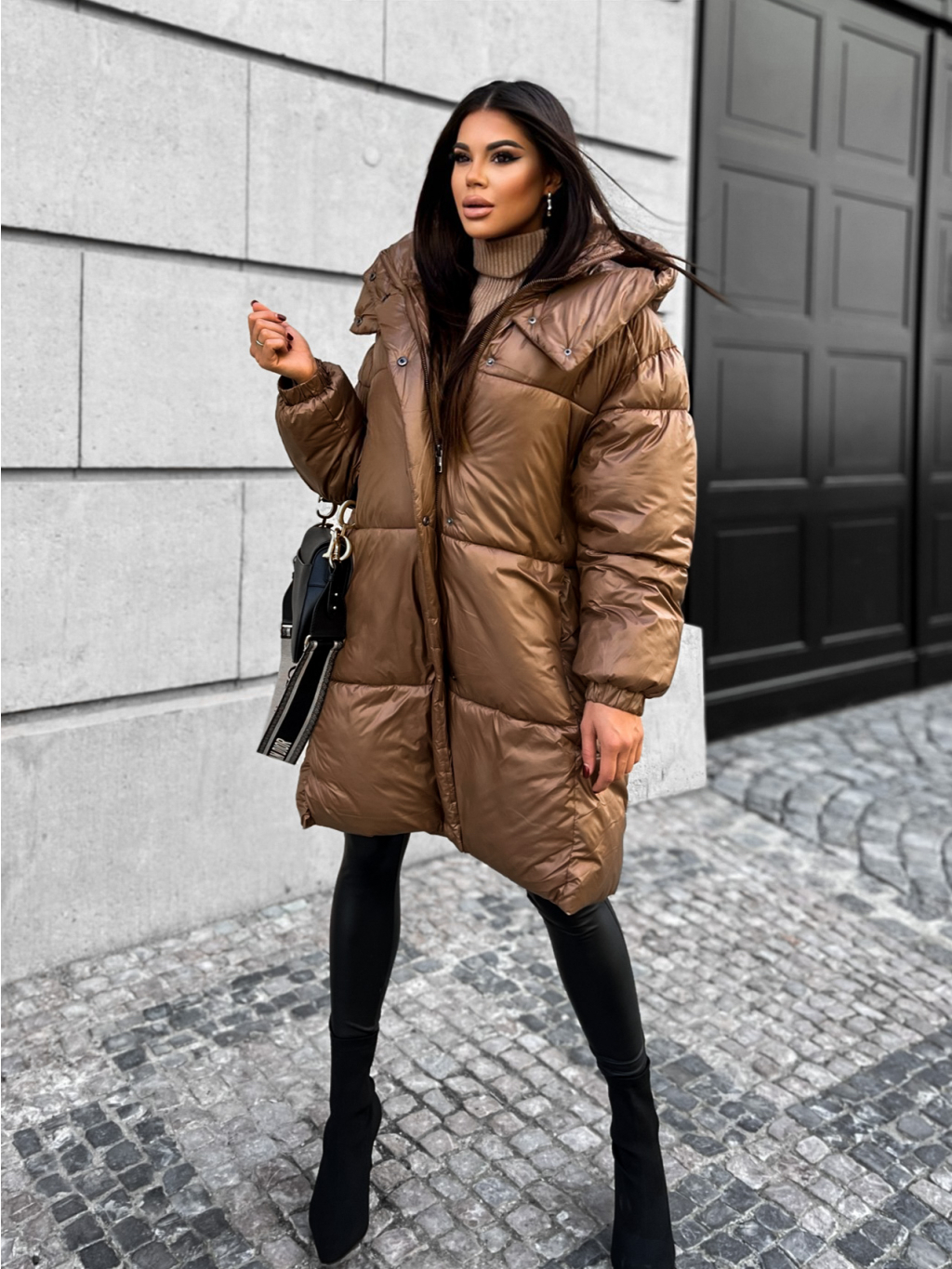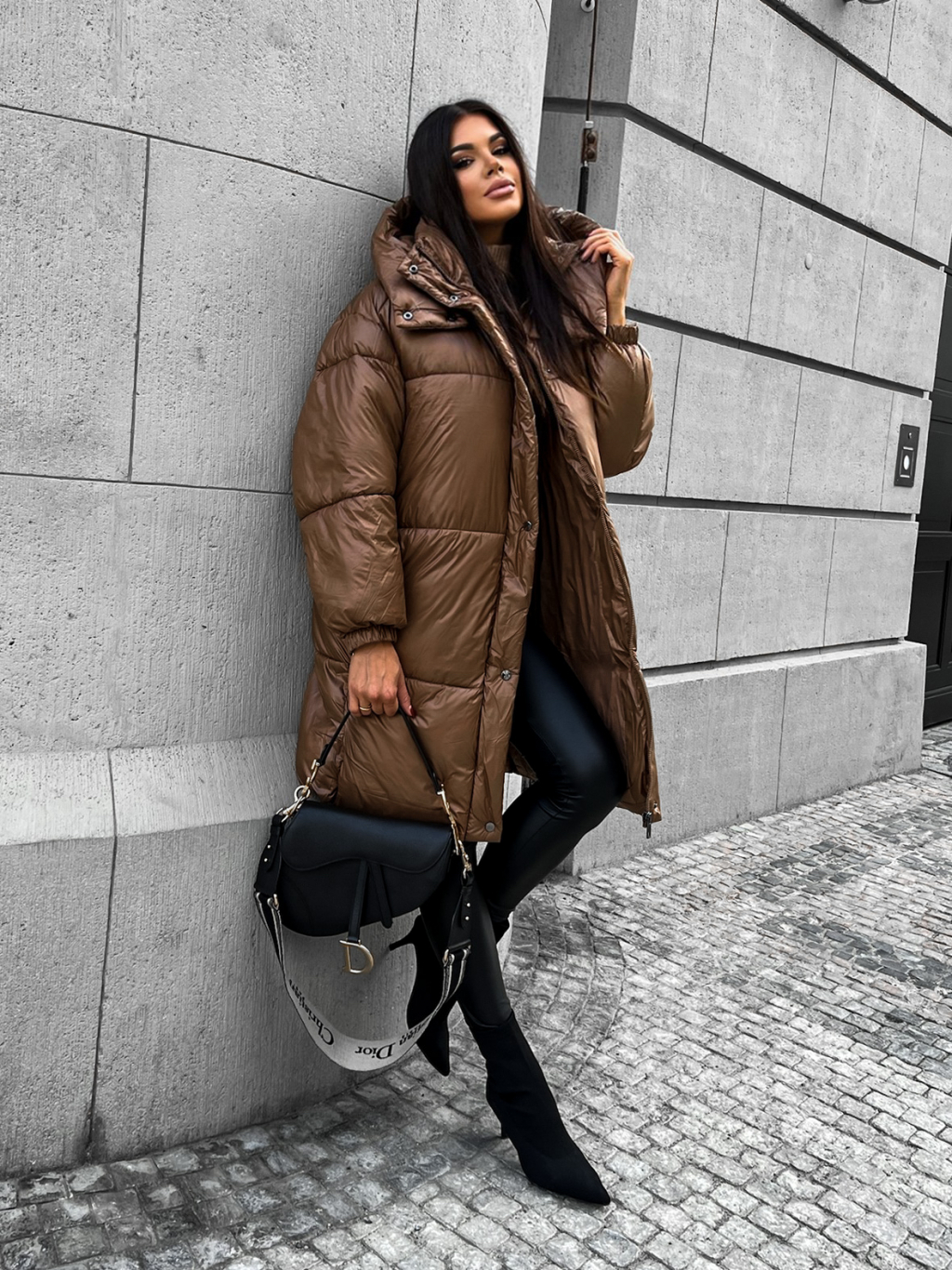 Hnědá dlouhá prošívaná bunda PARANA s kapucí