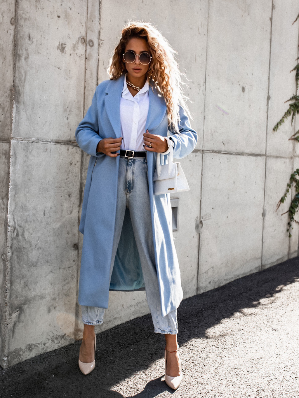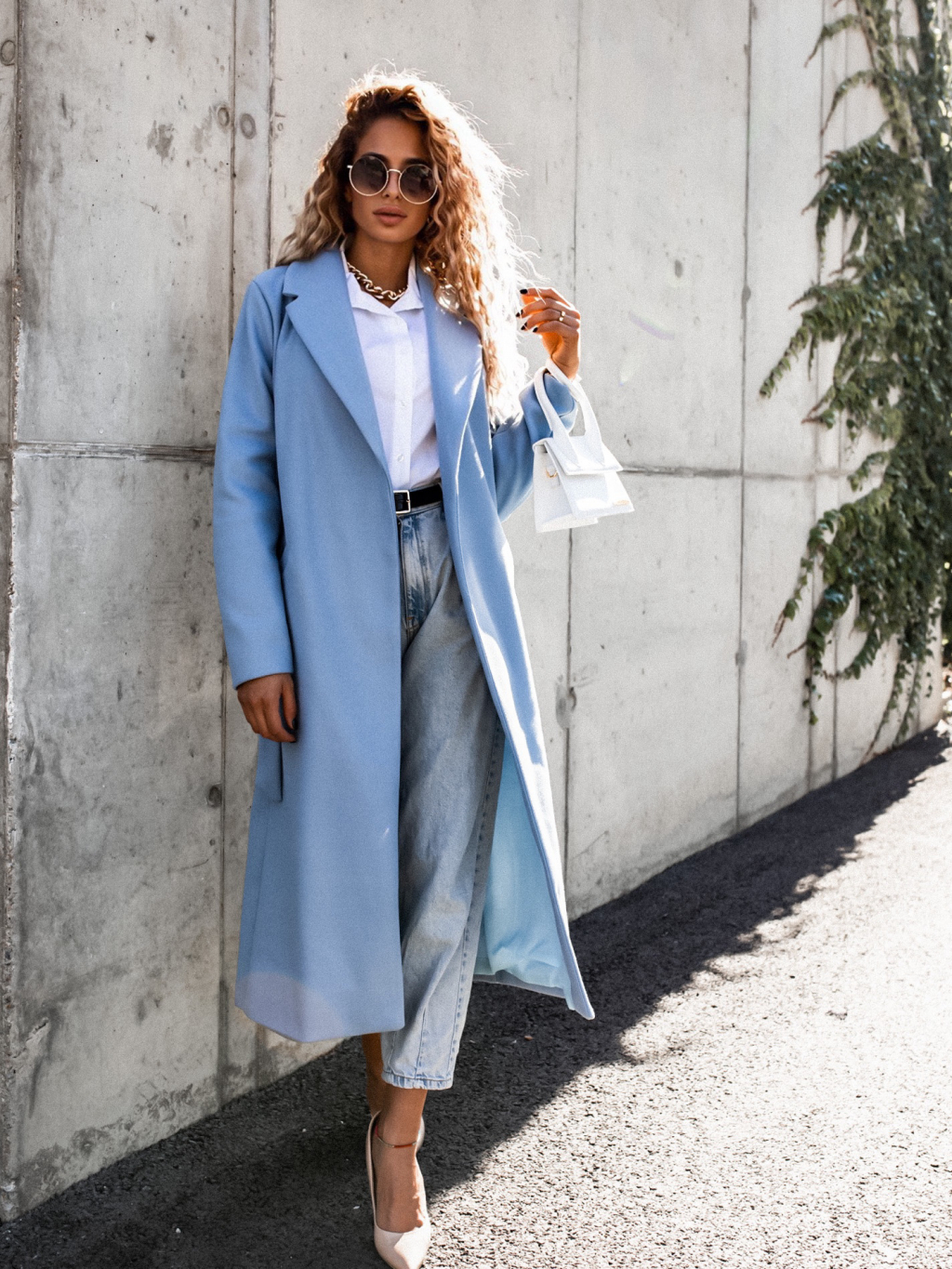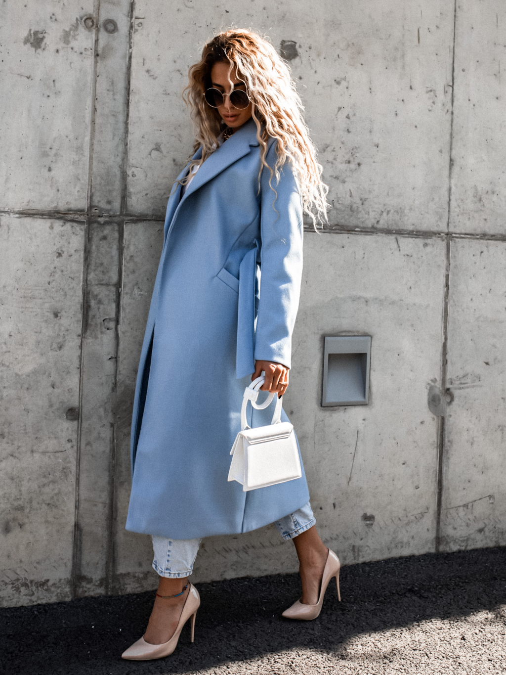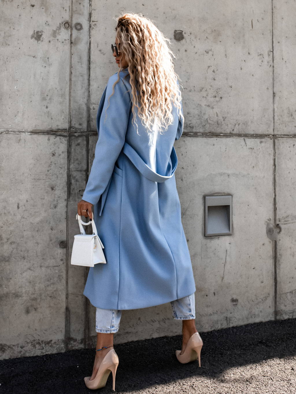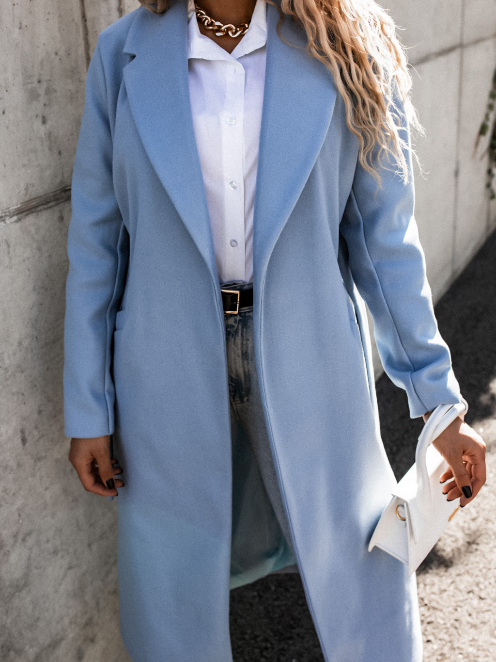 Světle modrý delší kabát EVADE s vázáním v pase