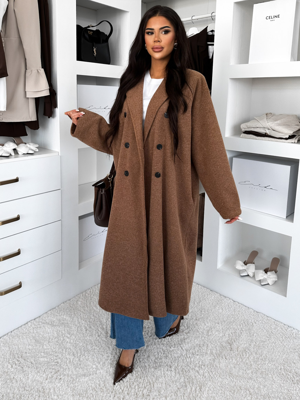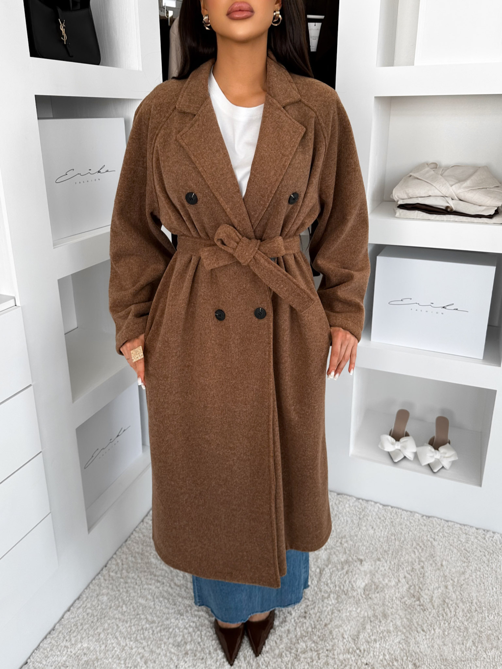 Hnědý dlouhý elegantní kabát KERRYL s knoflíky