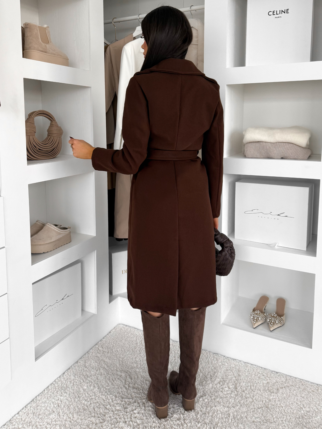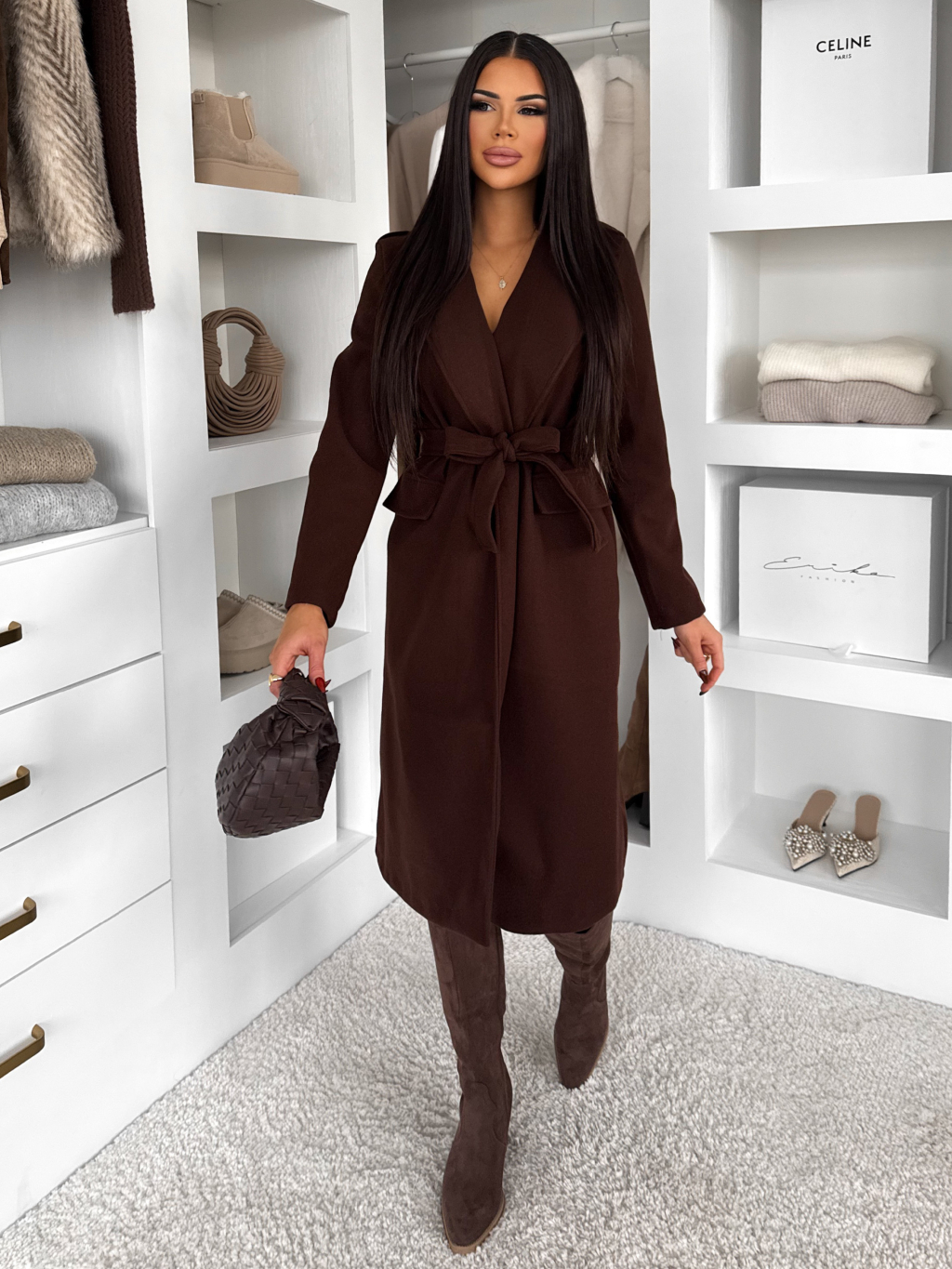 Hnědý dlouhý flaušový elegantní kabát LOPANI s páskem