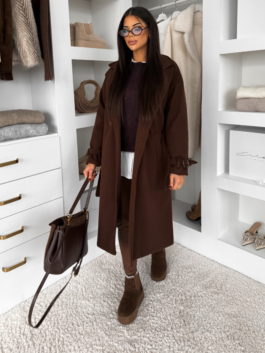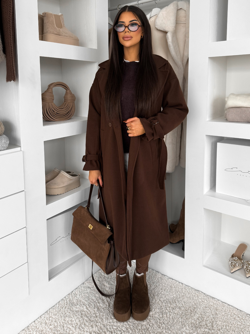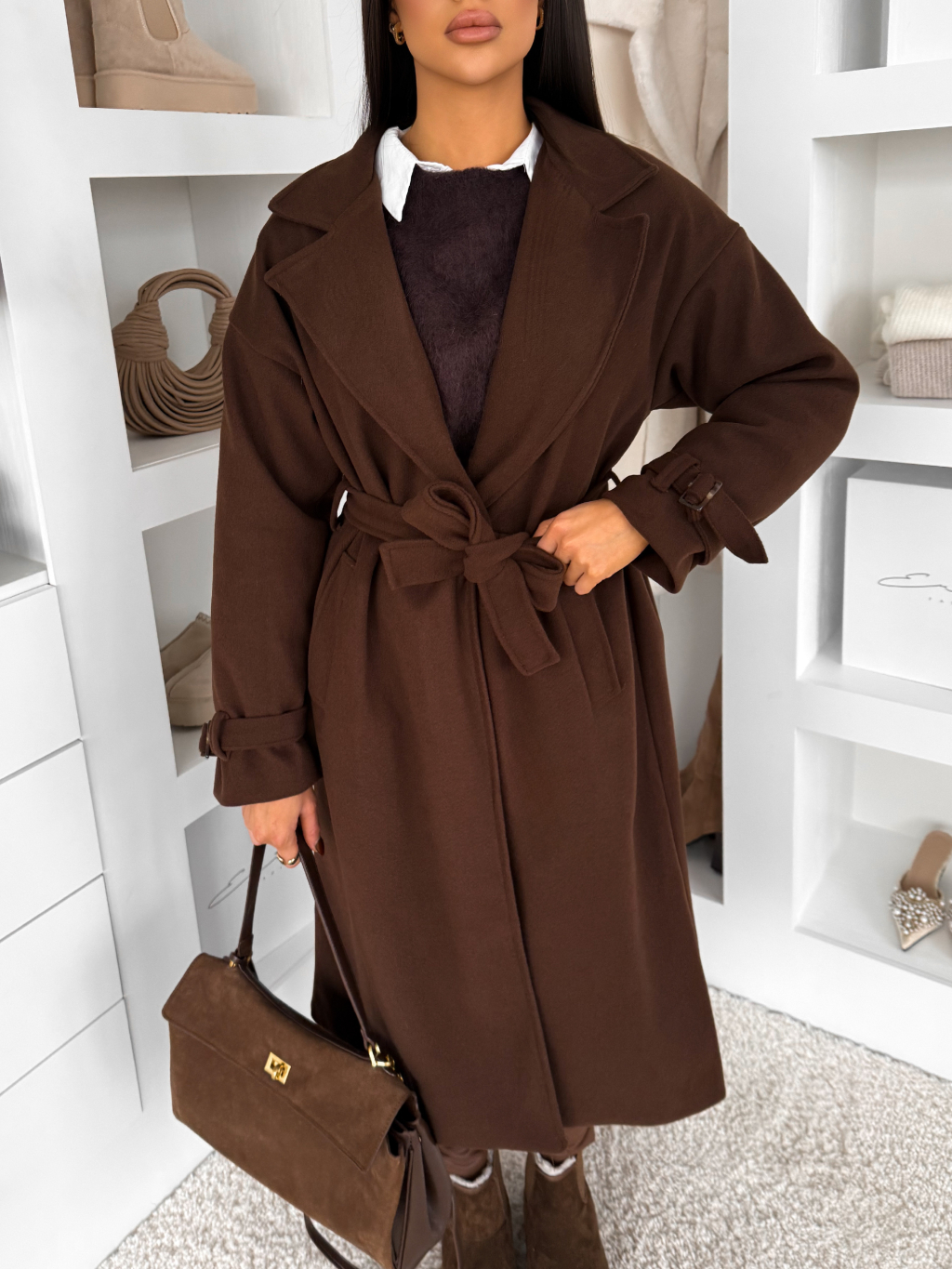 Hnědý dlouhý kabát POLIMAQ s páskem