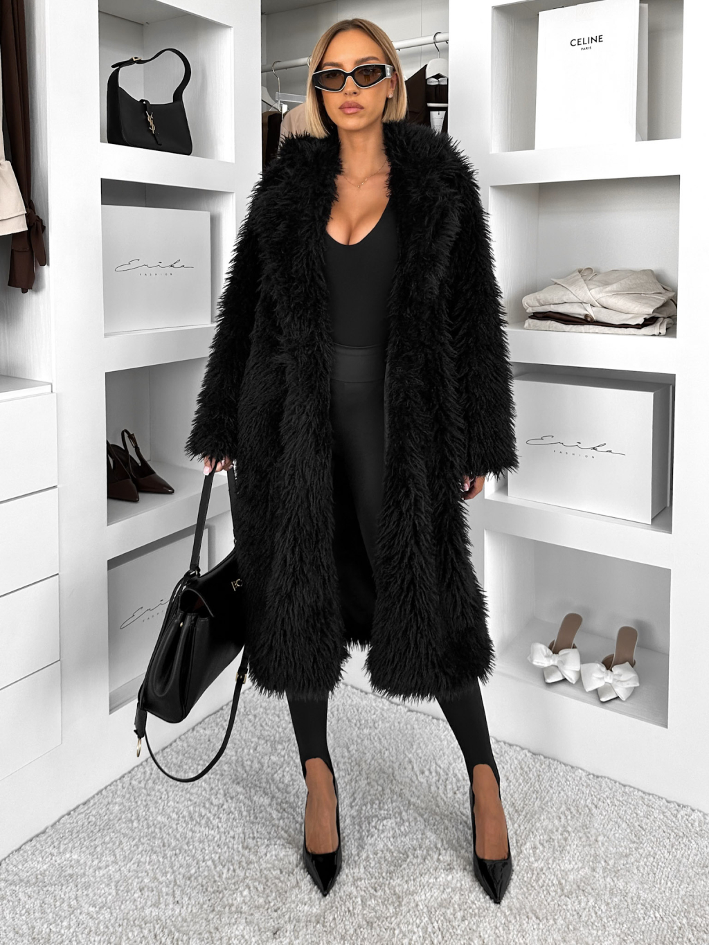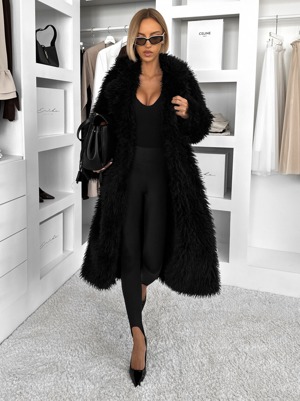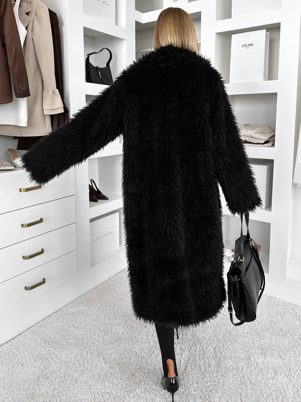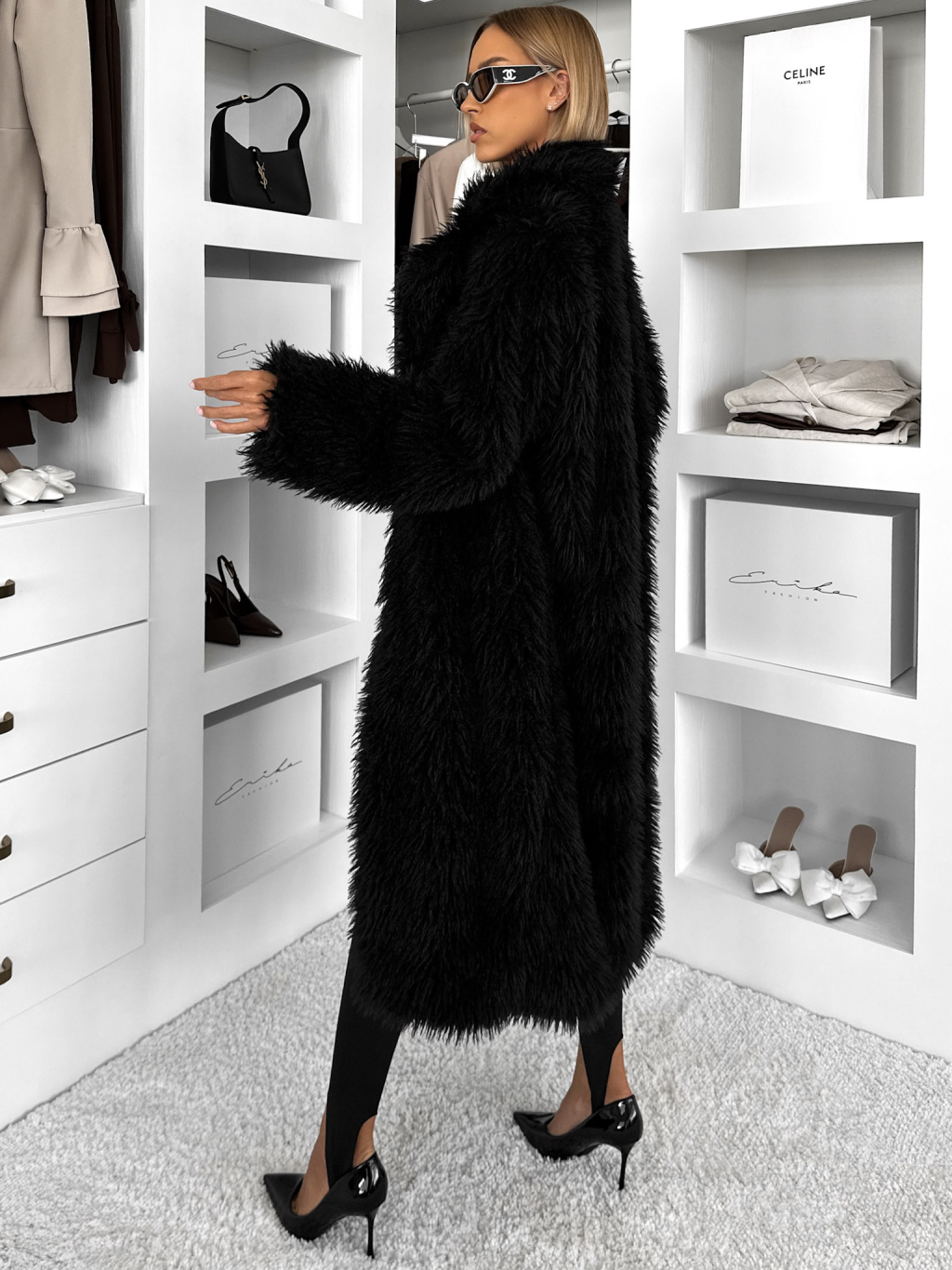 Černý faux fur dlouhý kožešinový kabát HOAIN
