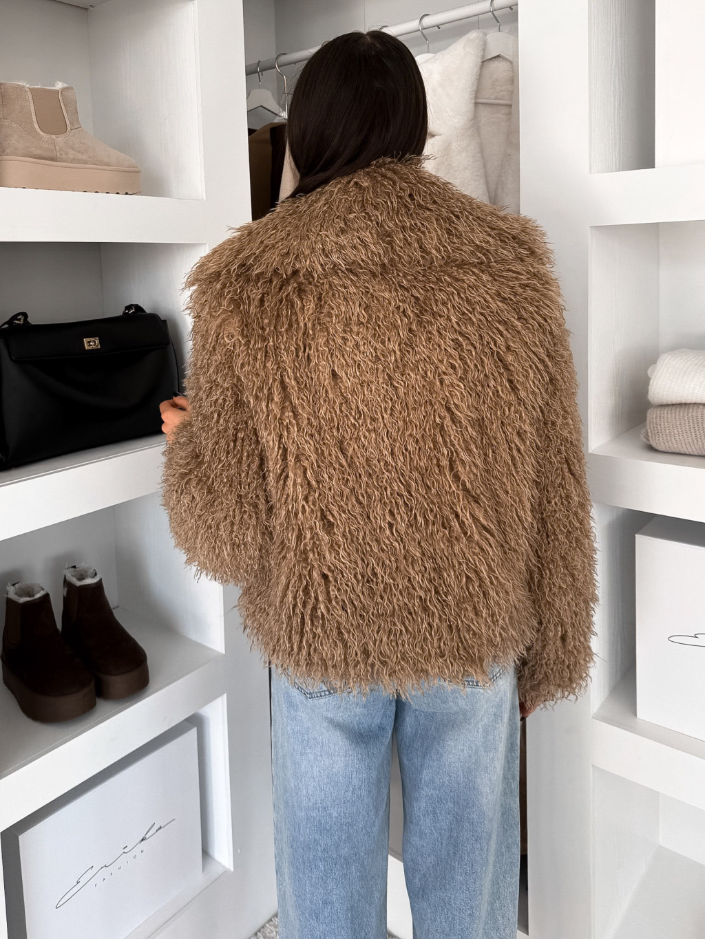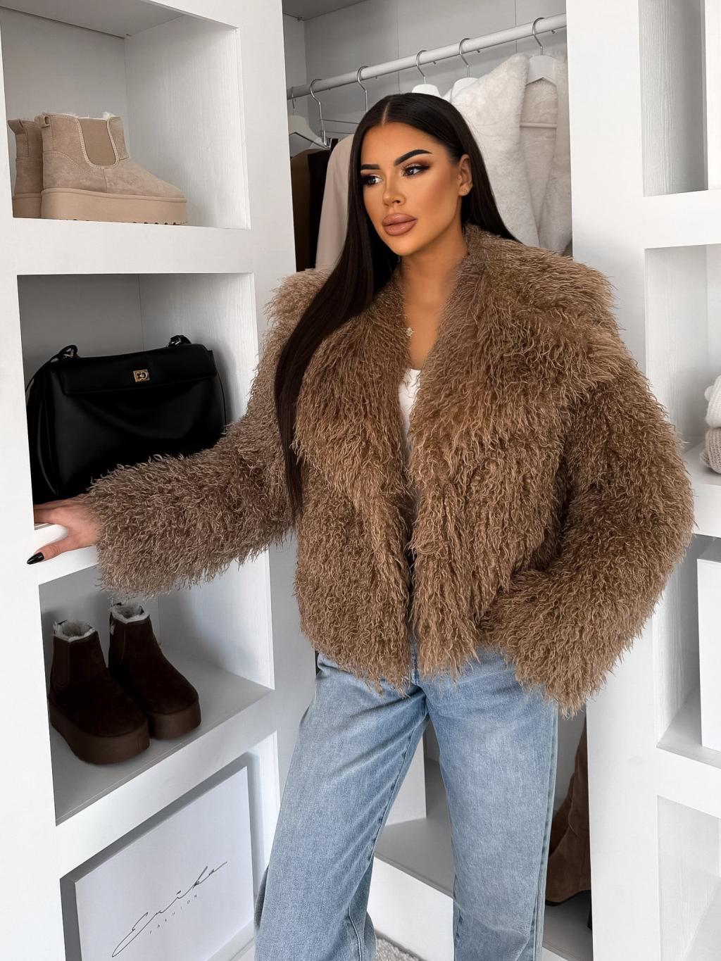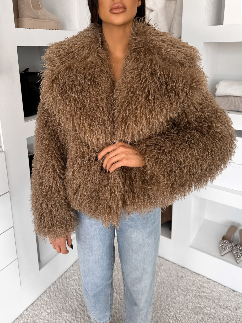 Hnědý kožešinový vlnitý faux fur kabátek FURLA