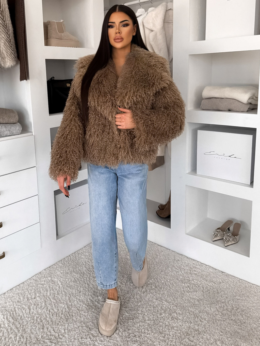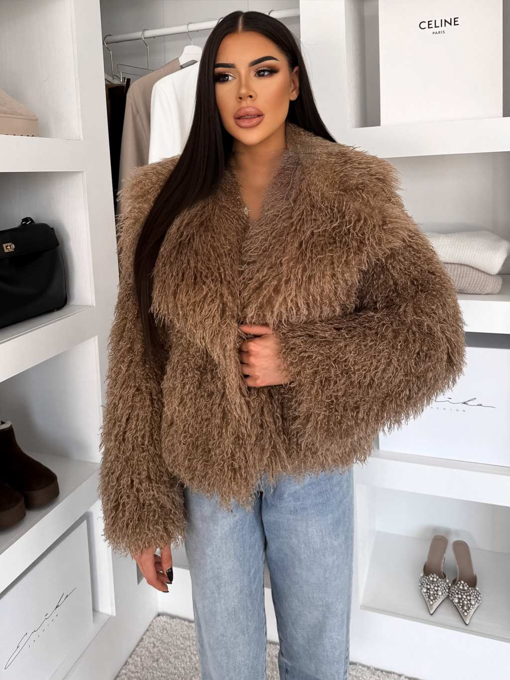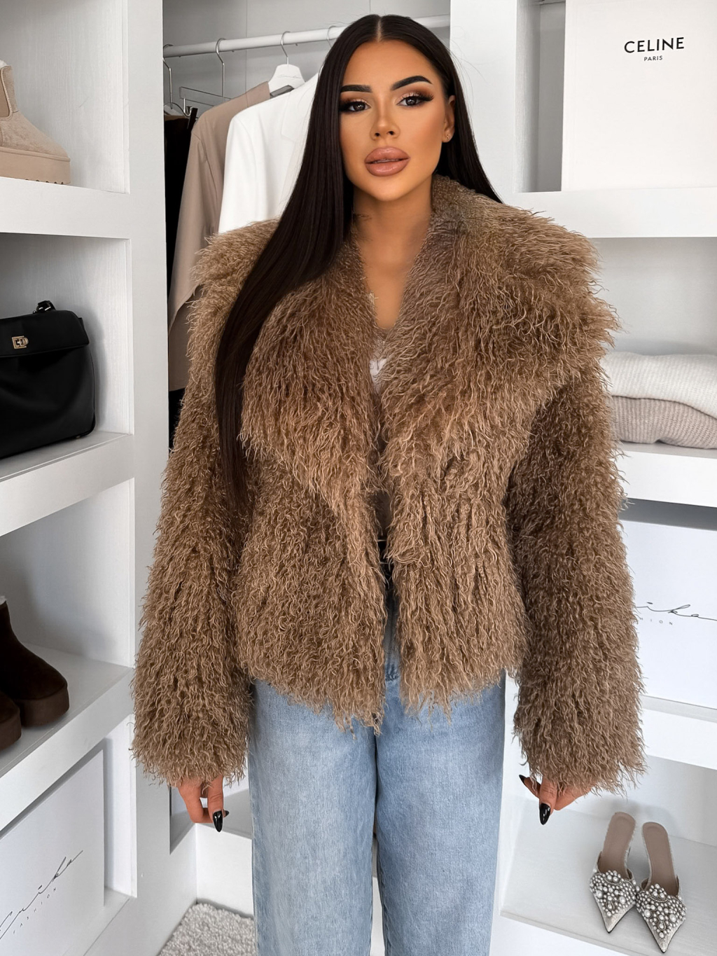 Hnědý kožešinový vlnitý faux fur kabátek FURLA