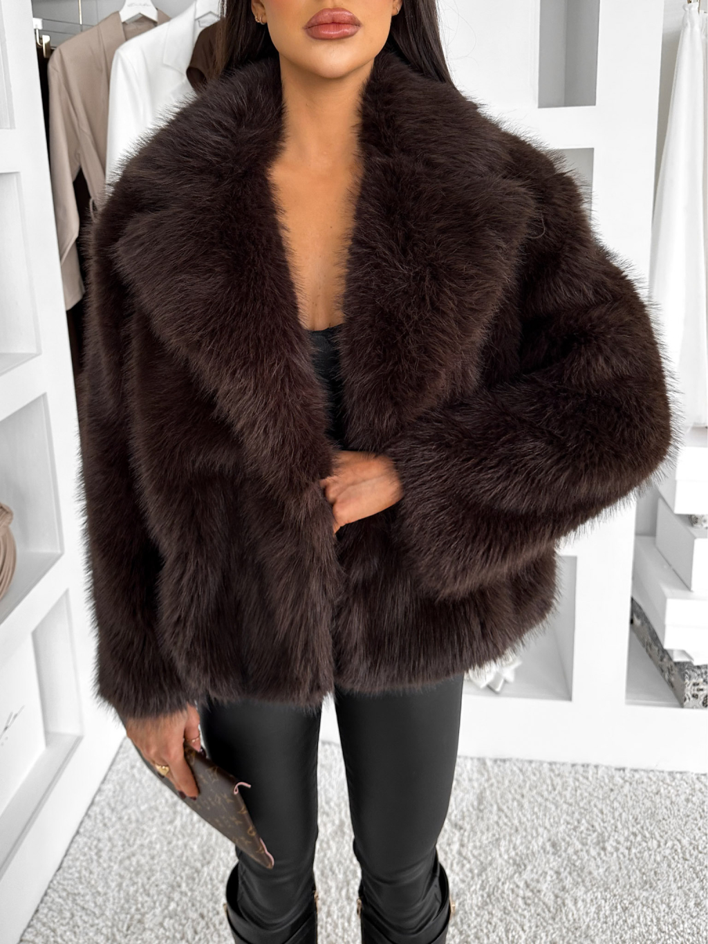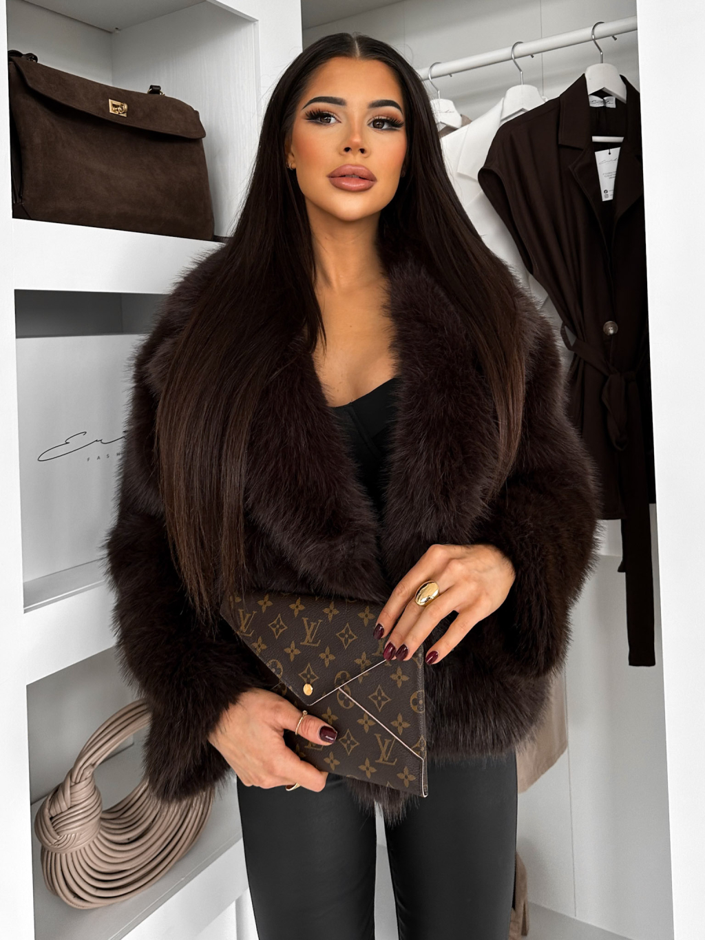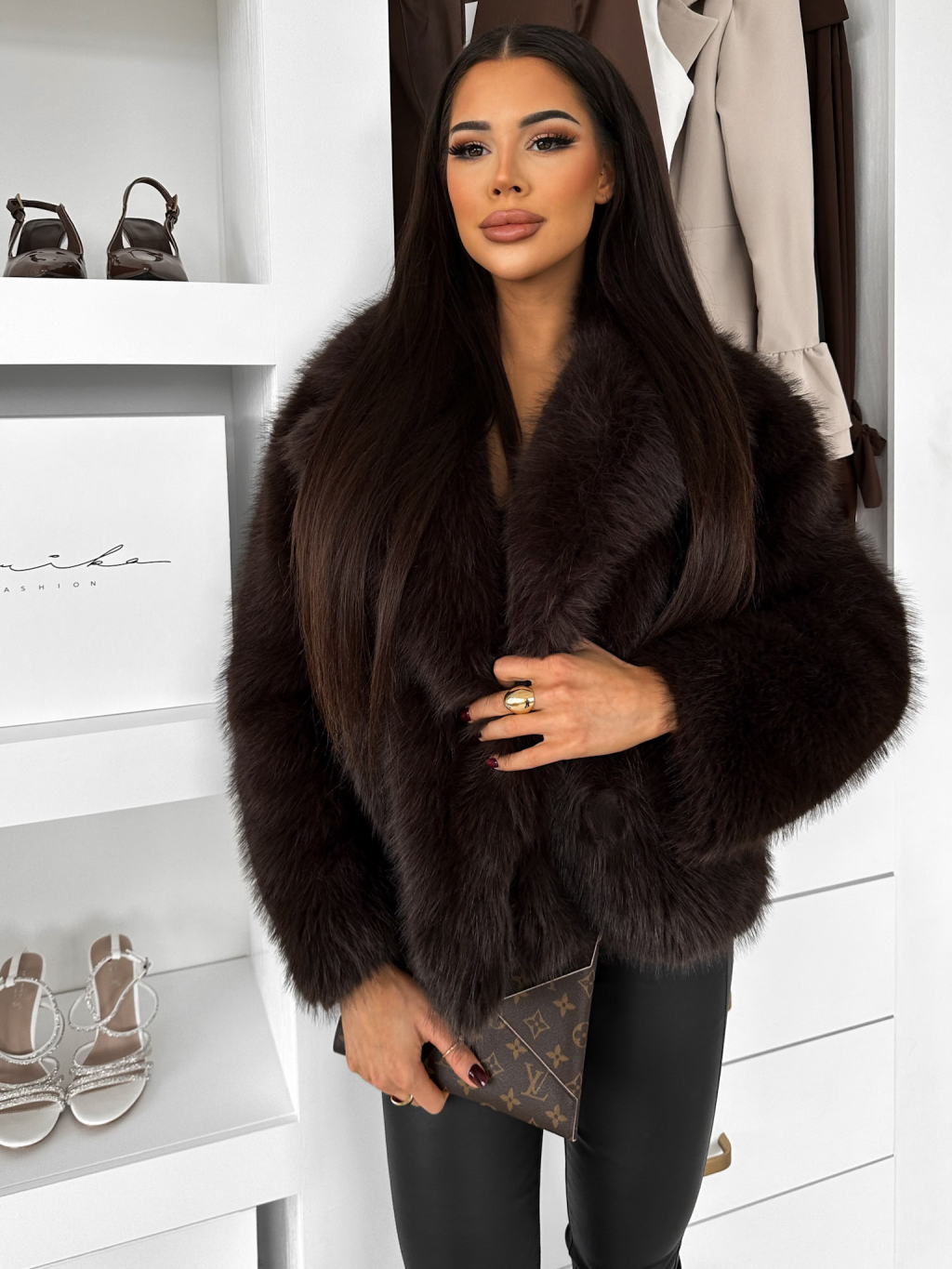 Tmavě hnědý faux fur huňatý kožešinový kabátek MORVEN