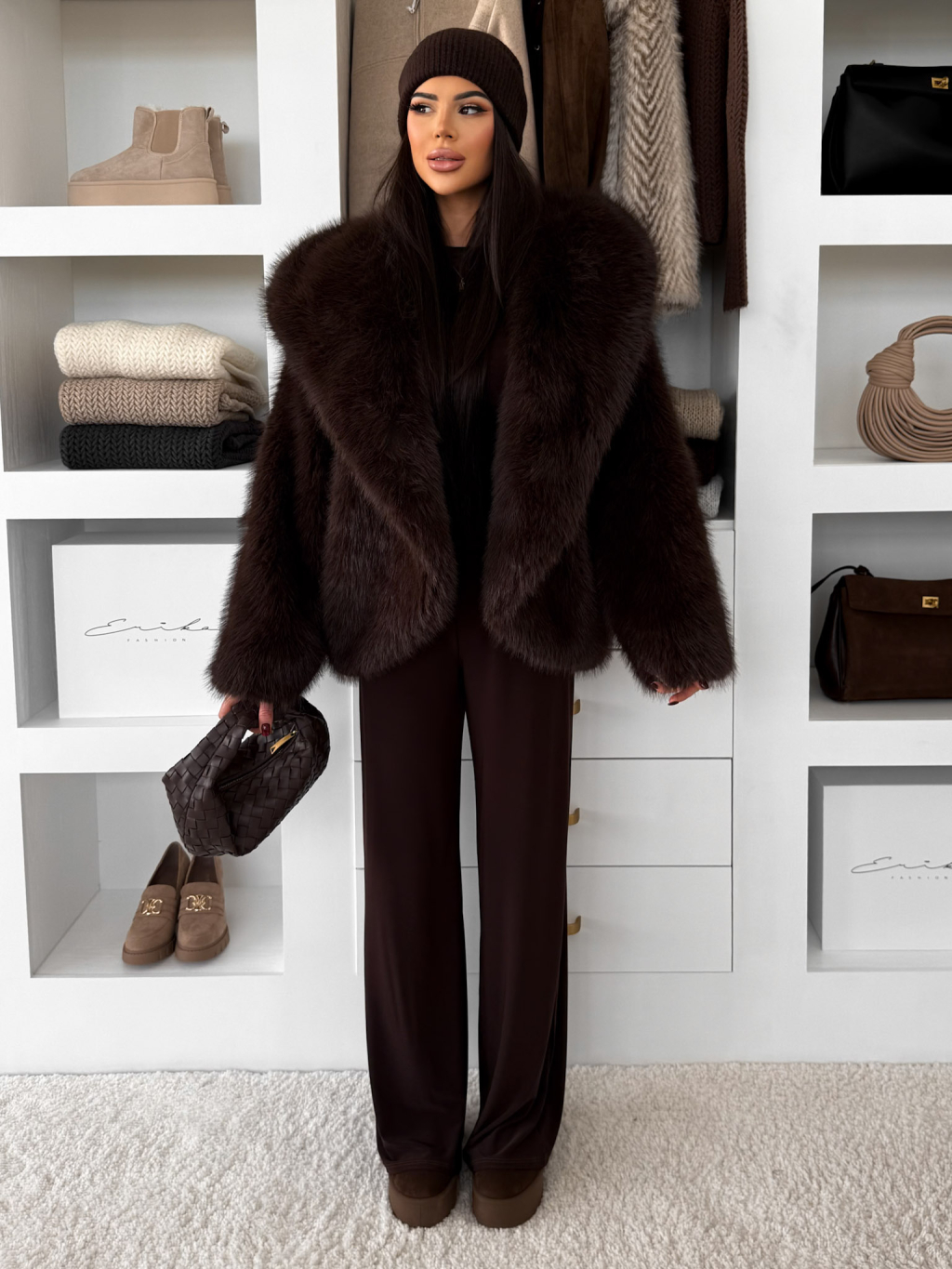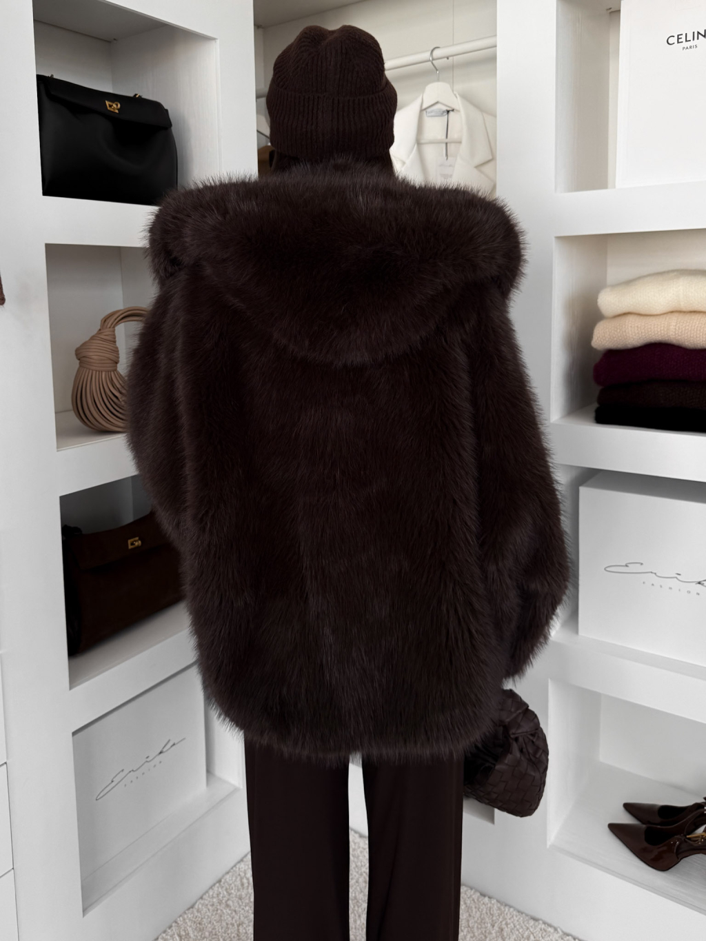 Tmavě hnědý faux fur kožešinový kabátek NOLIERO s kapucí
