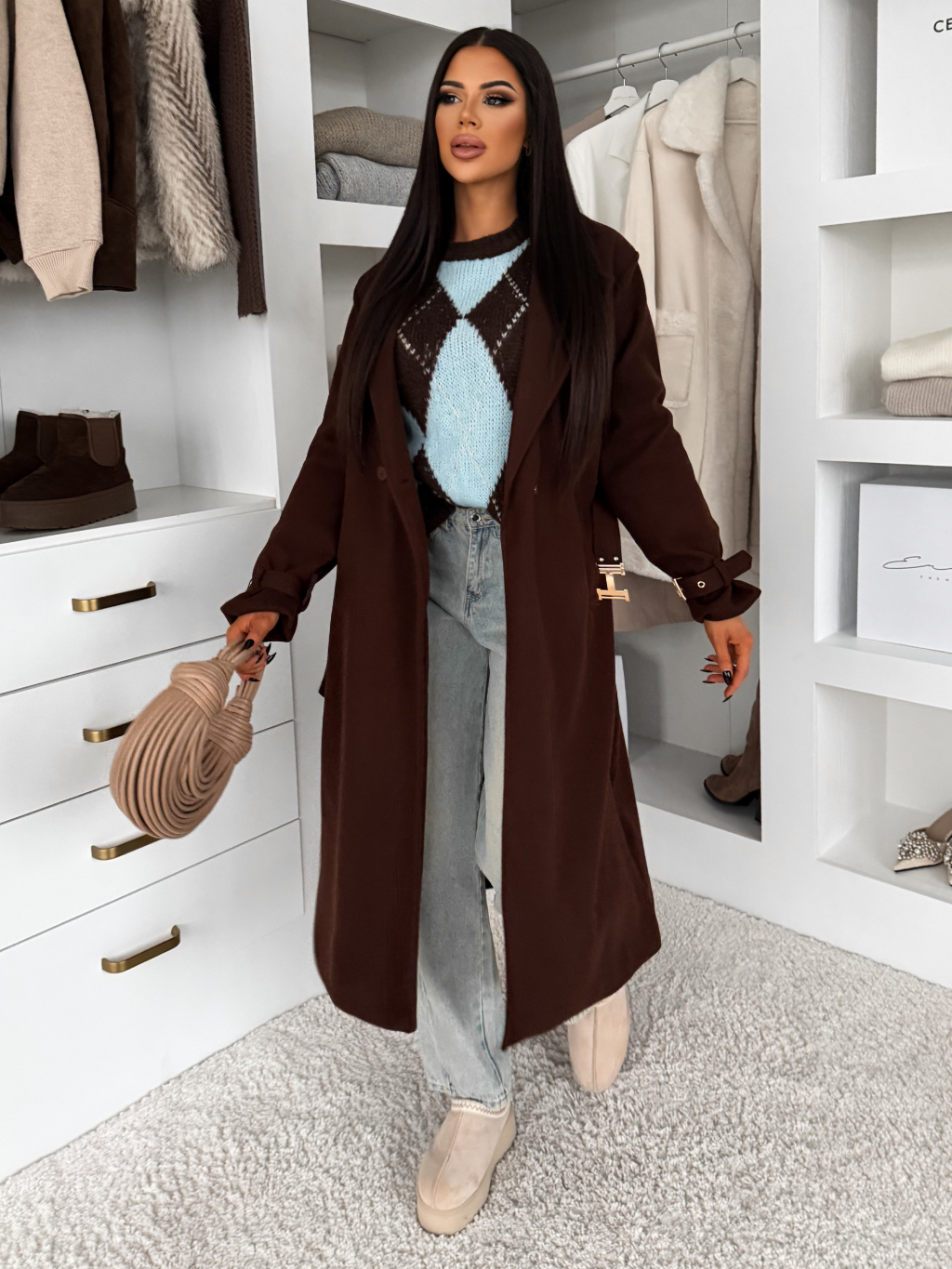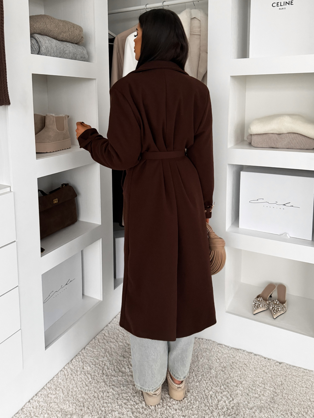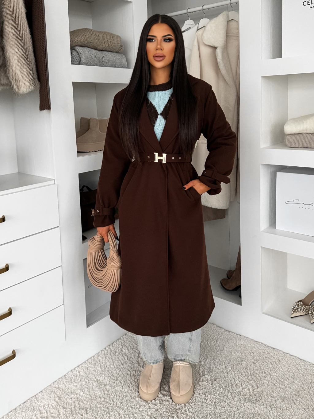 Hnědý elegantní dlouhý kabát CERADY s opaskem