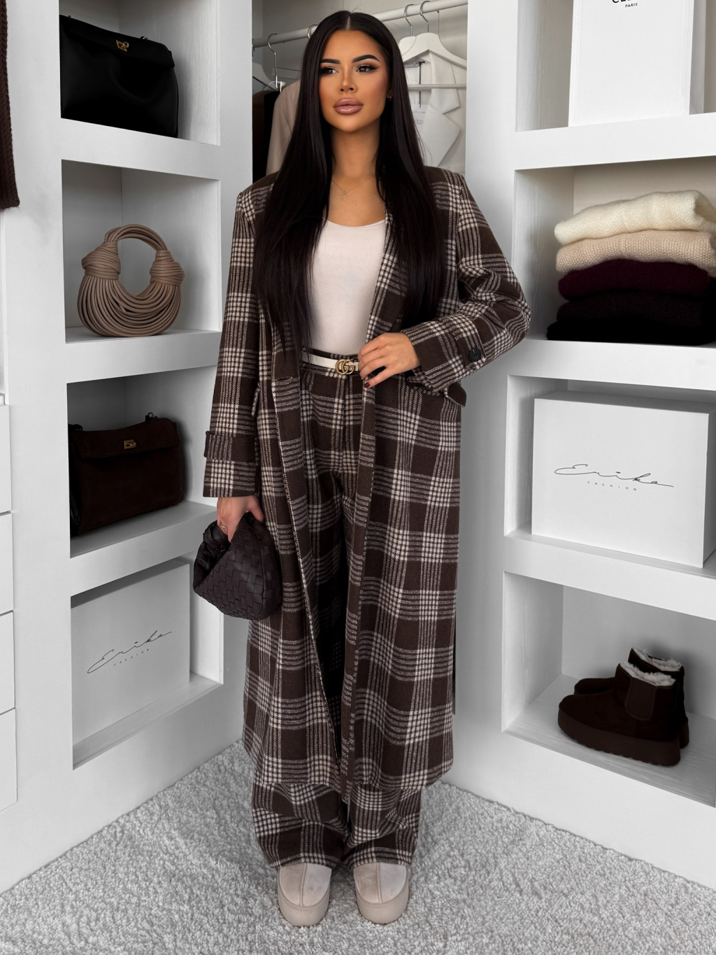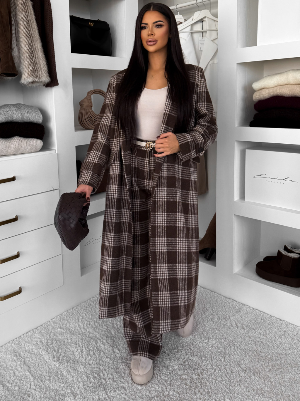 Hnědý kostkovaný károvaný dlouhý kabát OPHELYN