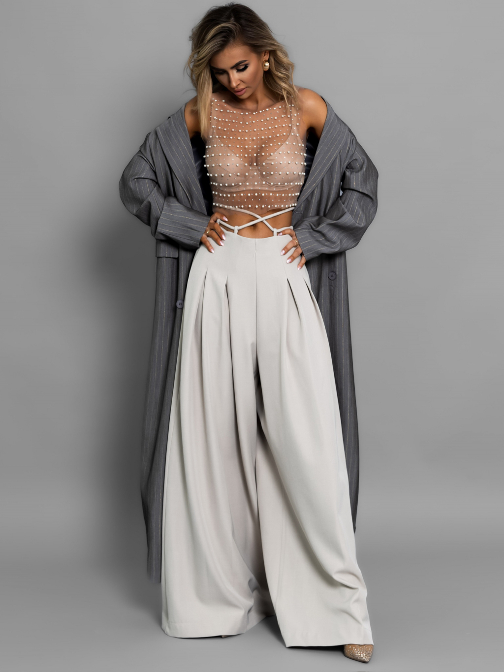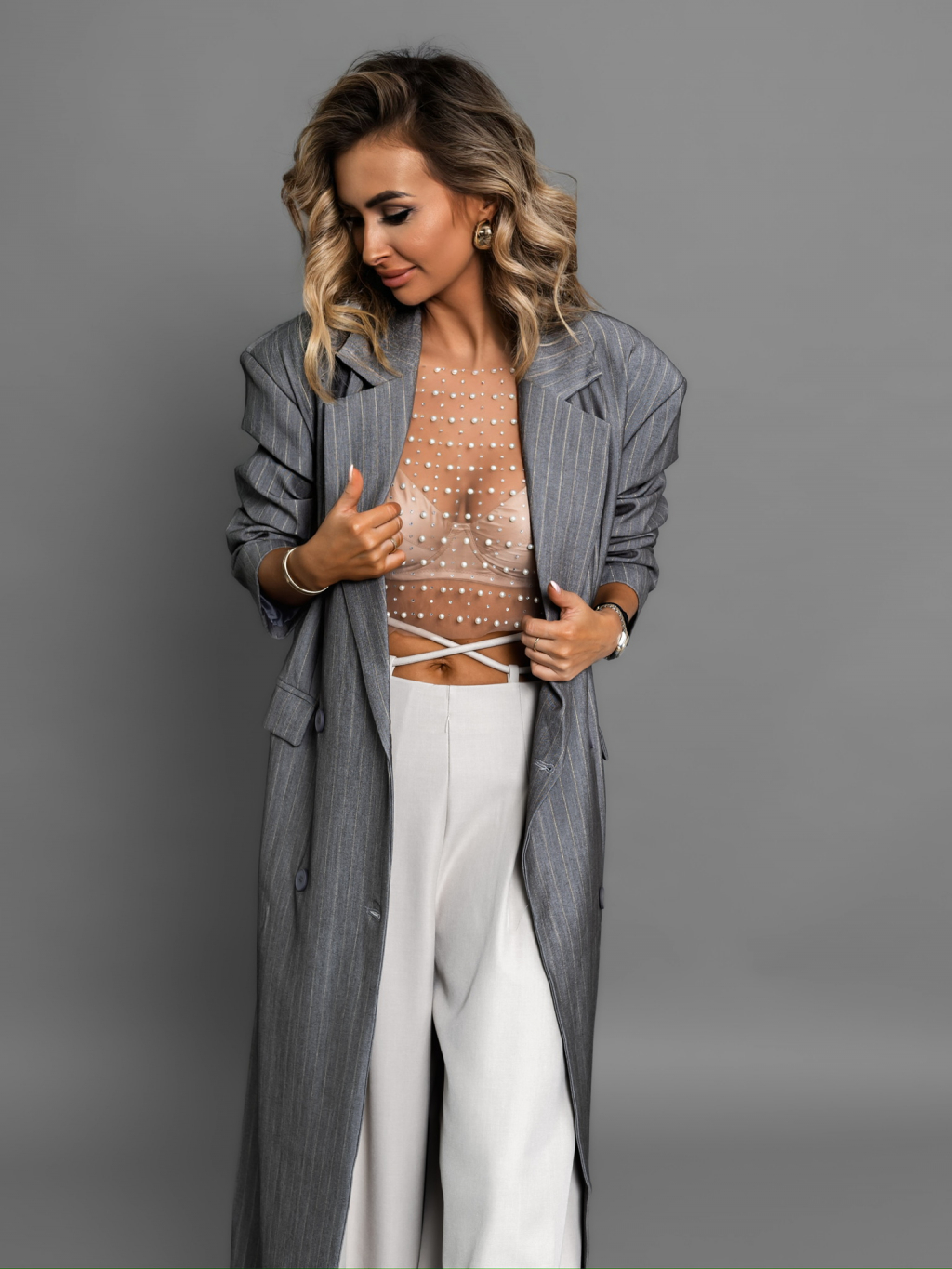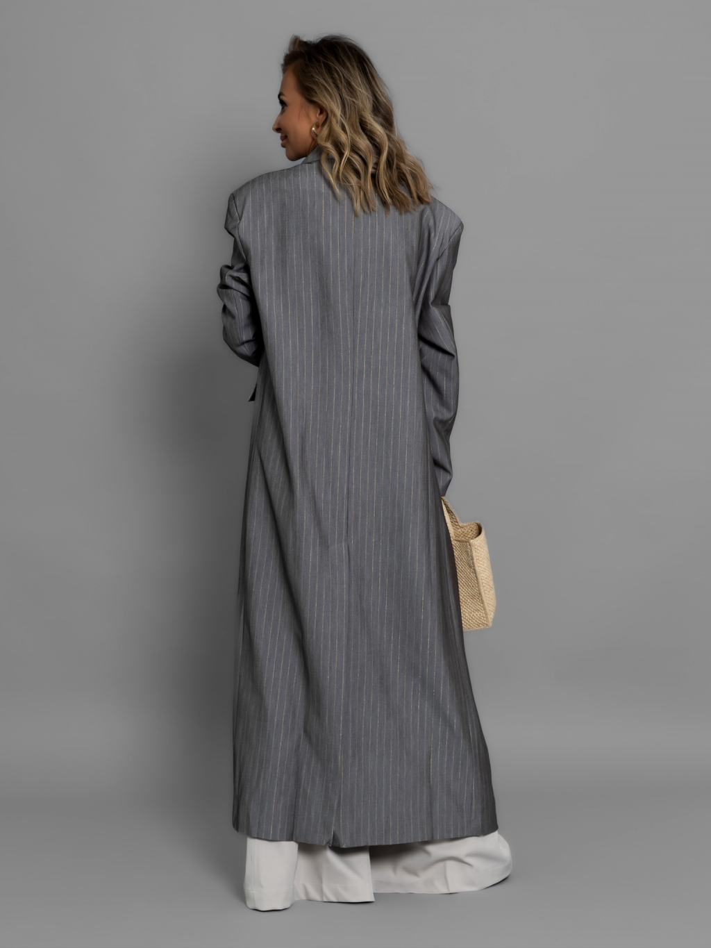 Šedý dlouhý proužkatý oversized kabát TANJIRO