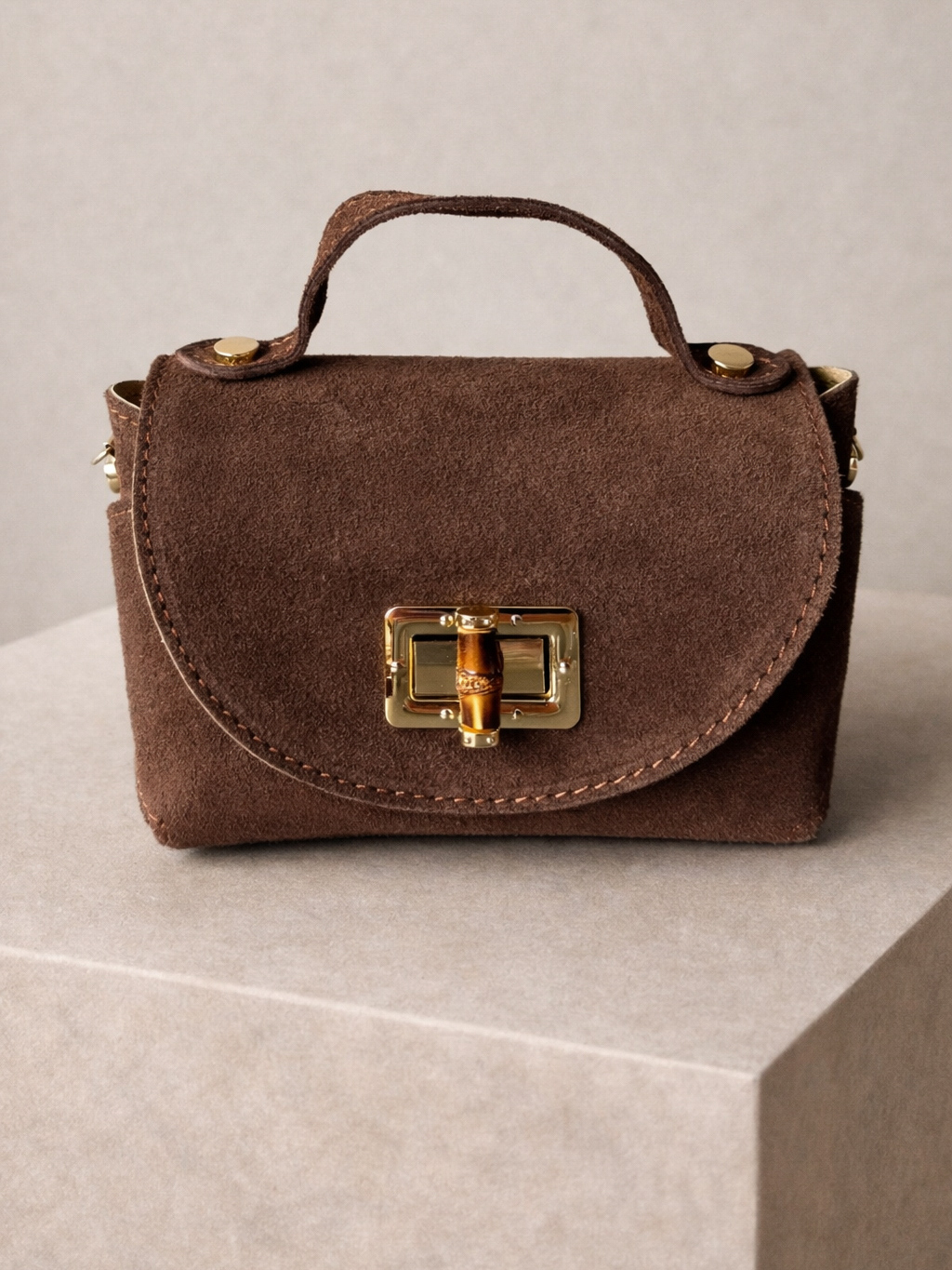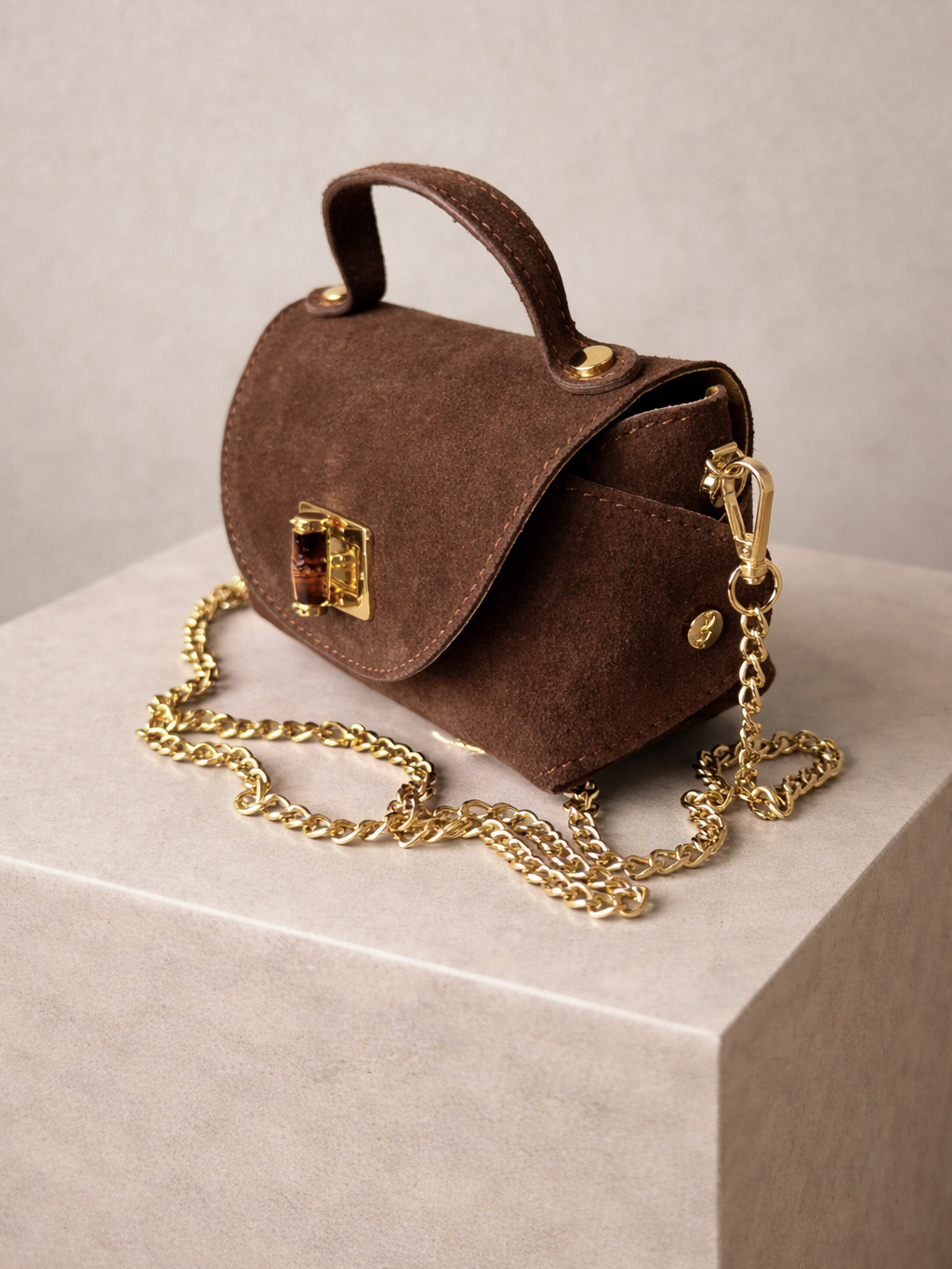 Hnědá kožená semišová mini kabelka VEVAROQ se zlatým řetízkem