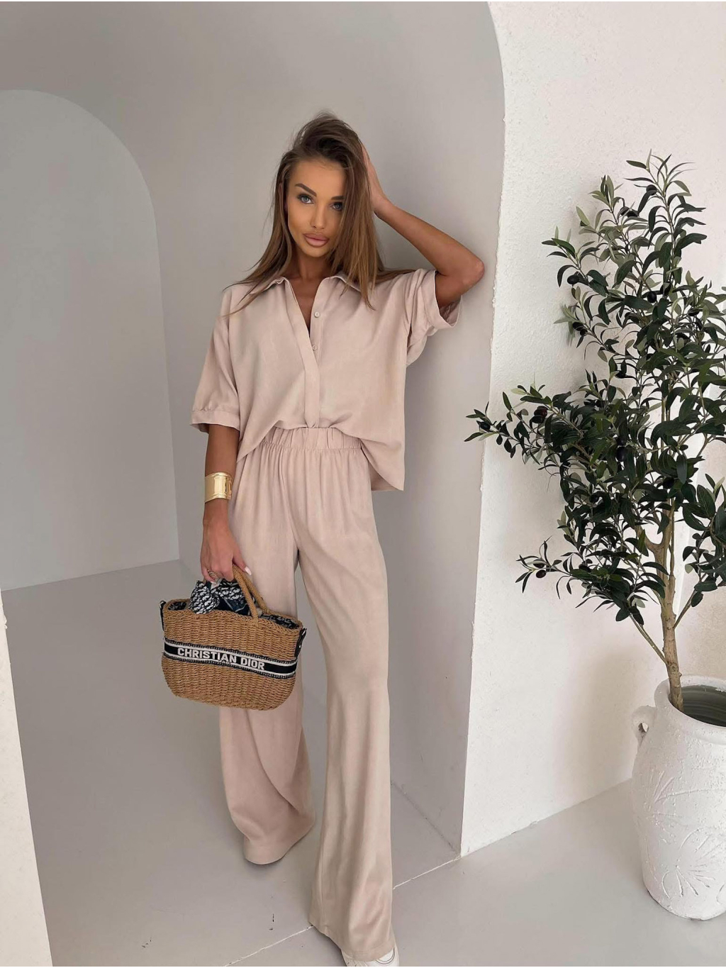 Béžový 100% len kalhotový košilový komplet ORIANA