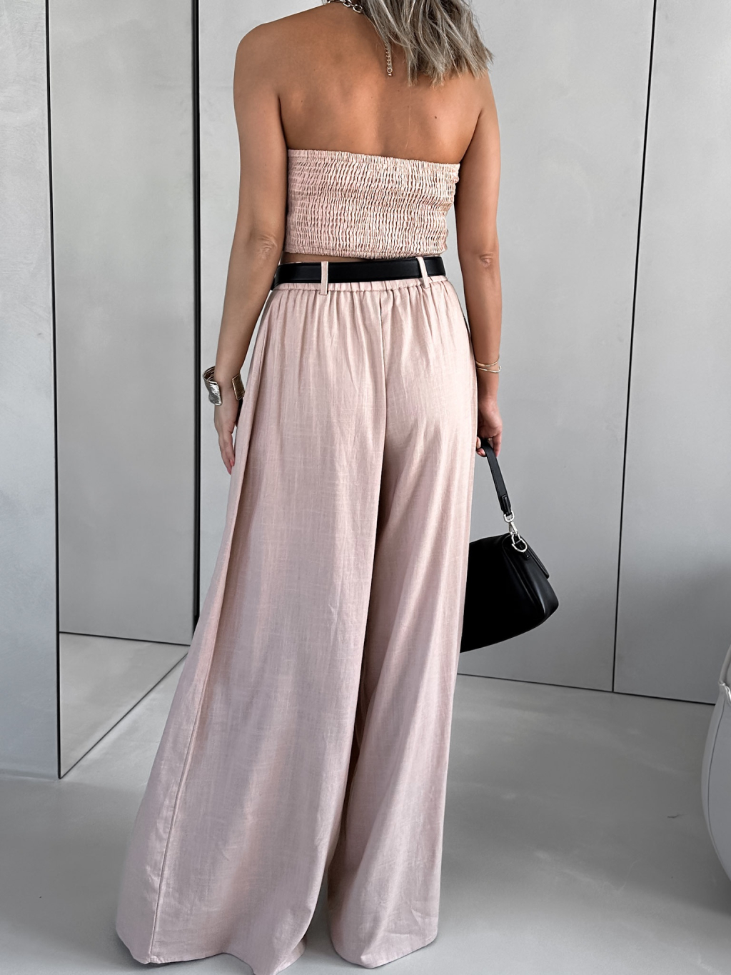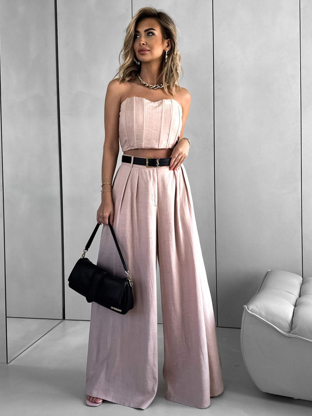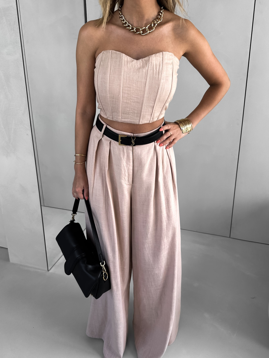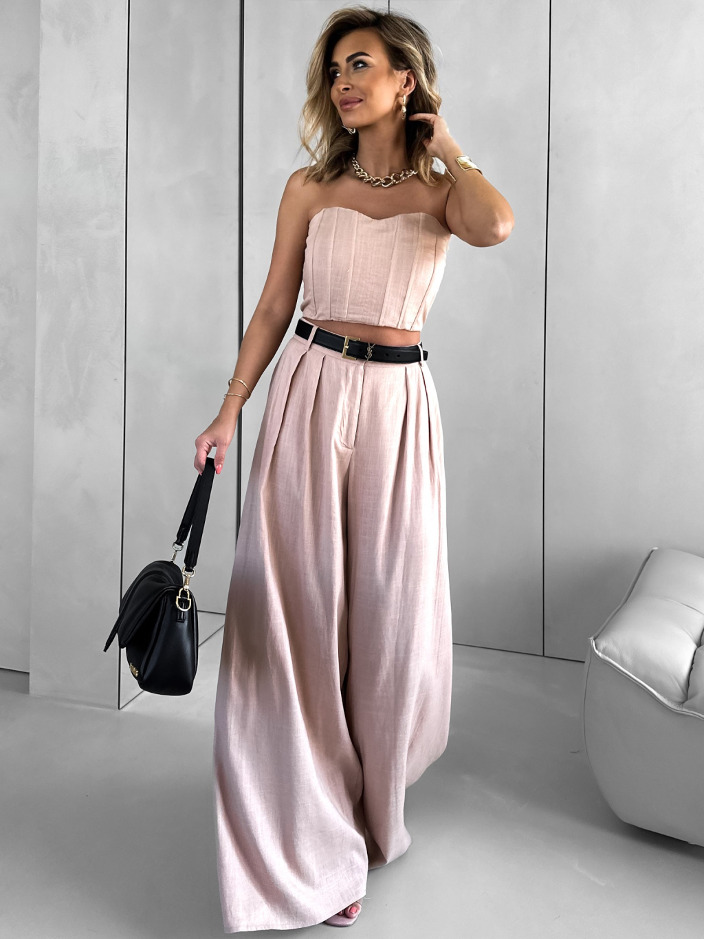 Béžový lněný kalhotový komplet PARTENA s korzetem