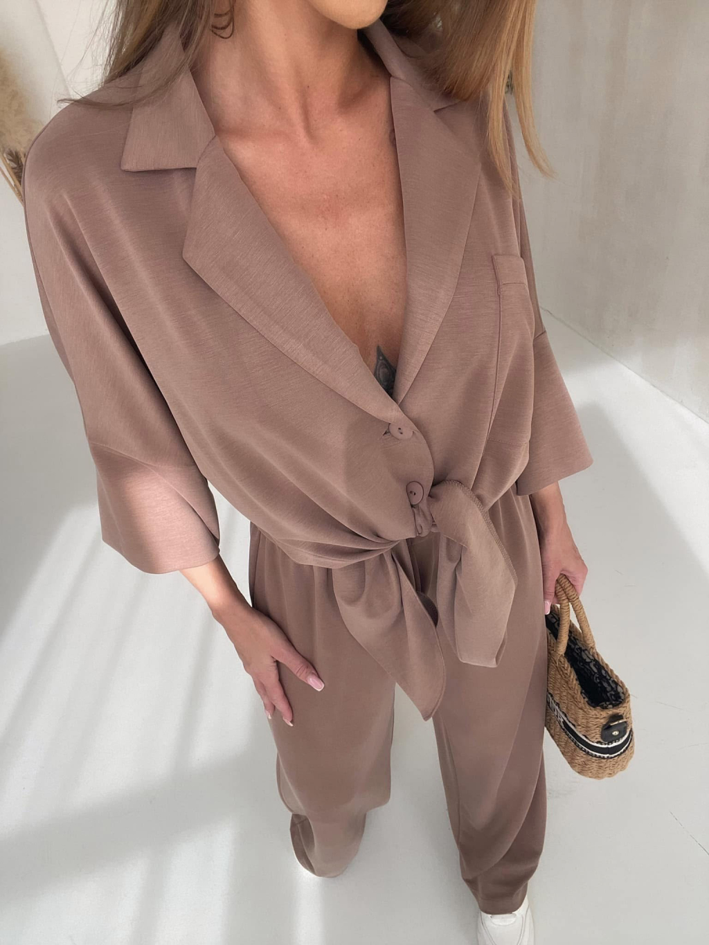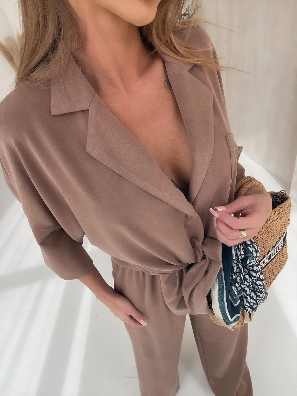 Hnědý kalhotový elegantní komplet TRYVEX s košilí