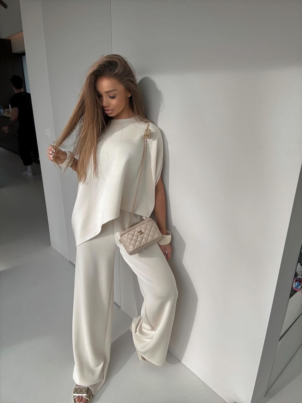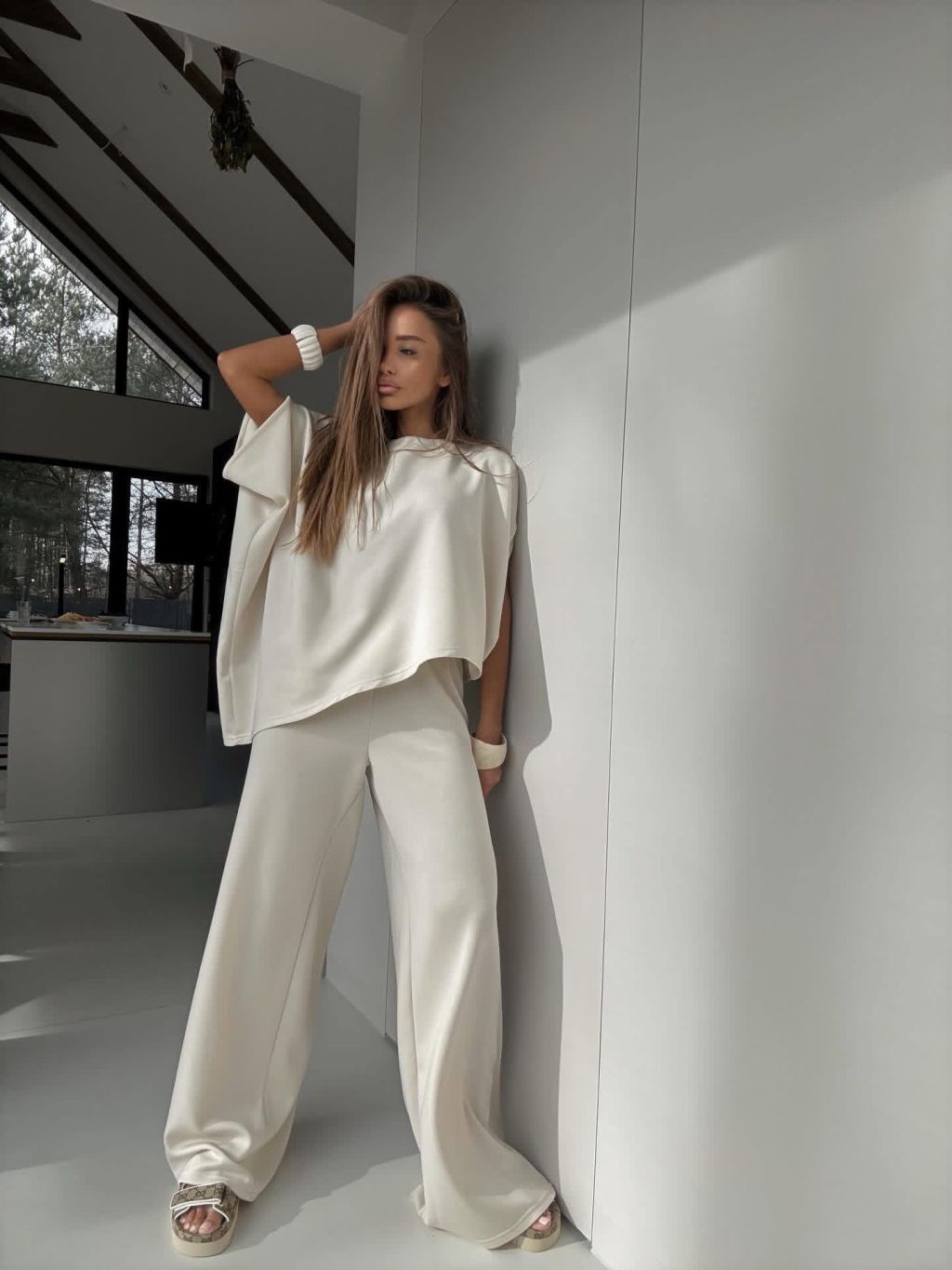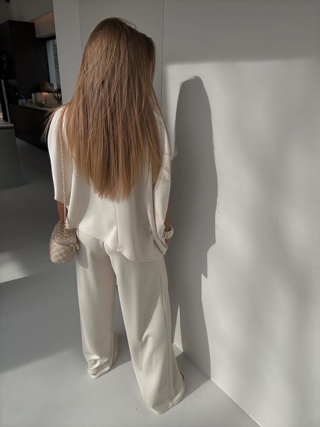 Krémový kalhotový elegantní dlouhý komplet ECRIA