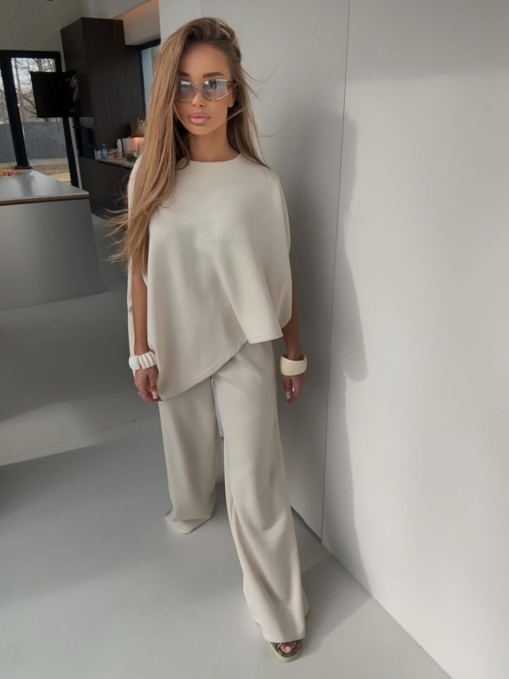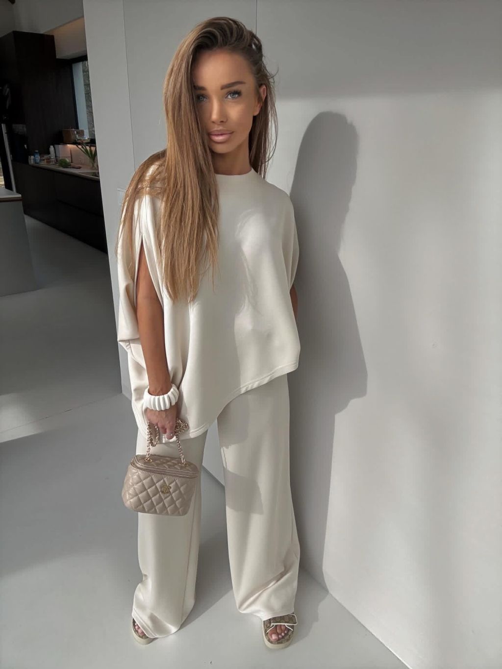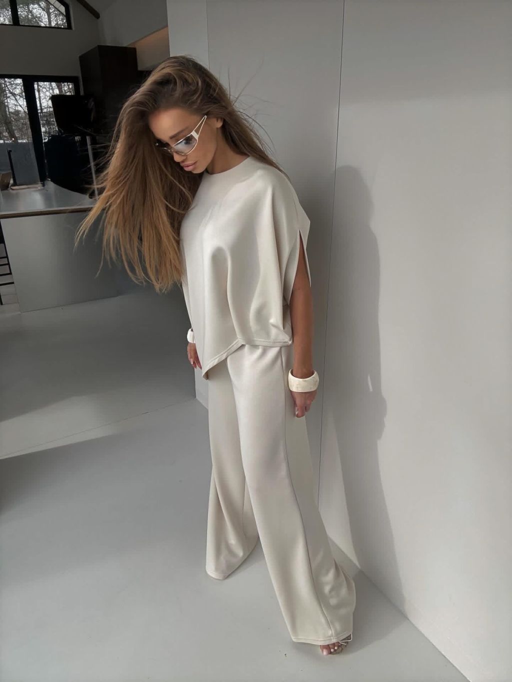Krémový kalhotový elegantní dlouhý komplet ECRIA