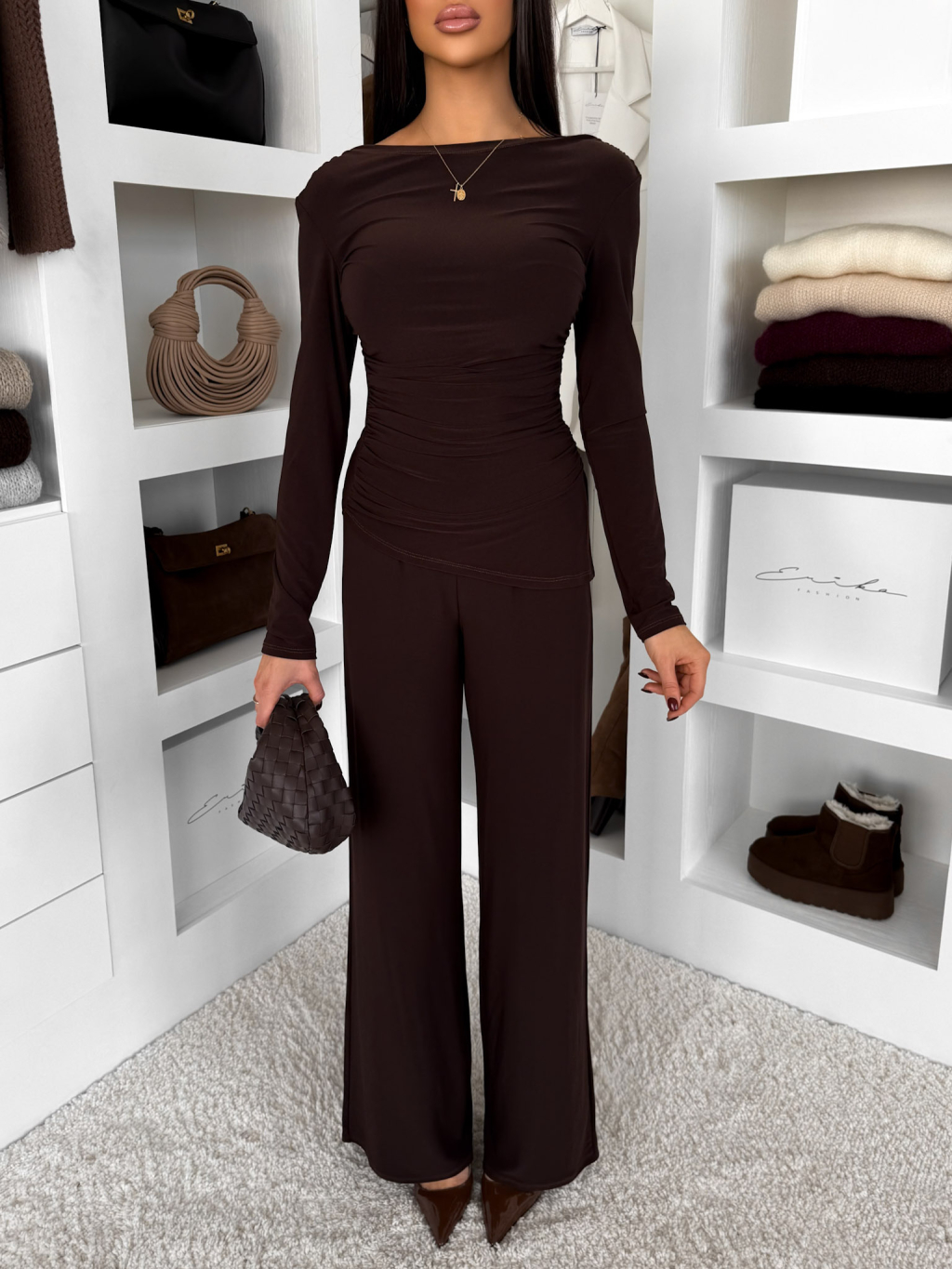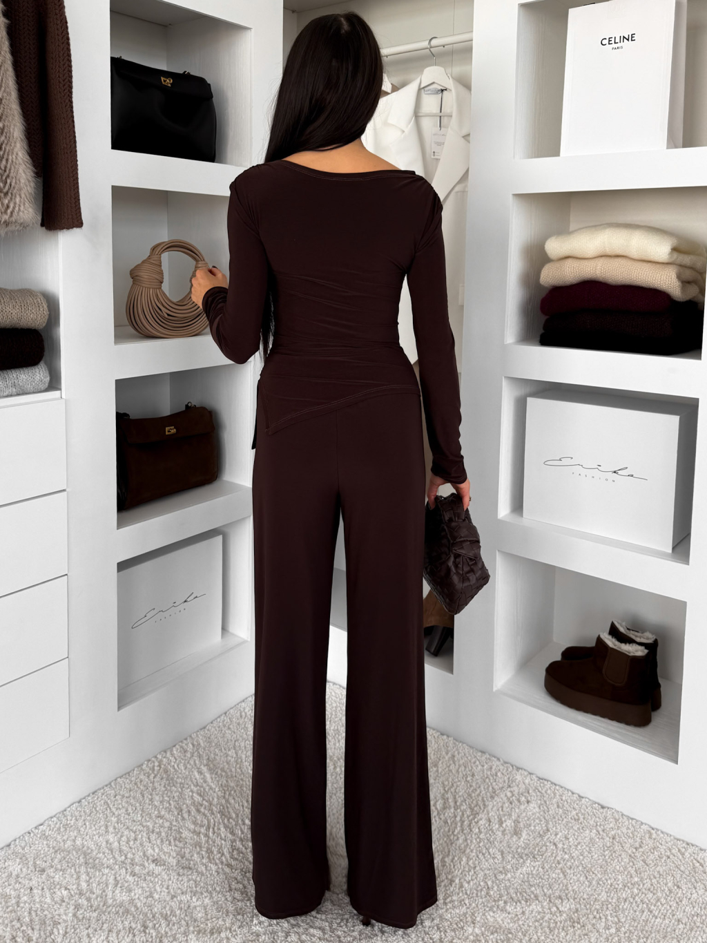 Hnědý elegantní elastický kalhotový komplet FELUREATY