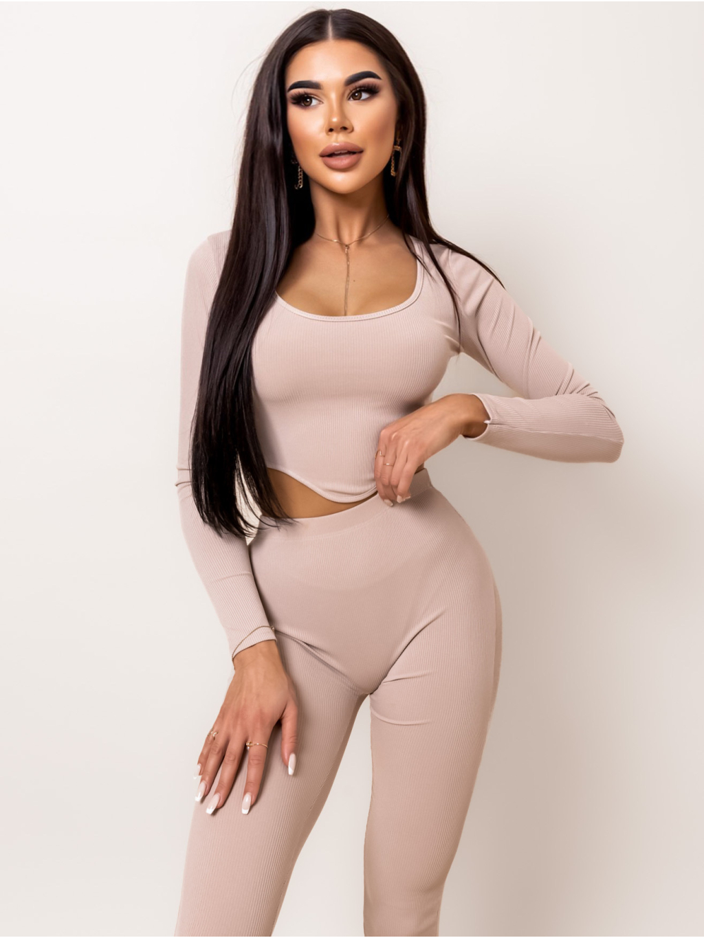 Béžový dvoudílný žebrovaný komplet JANIES s dlouhým rukávem