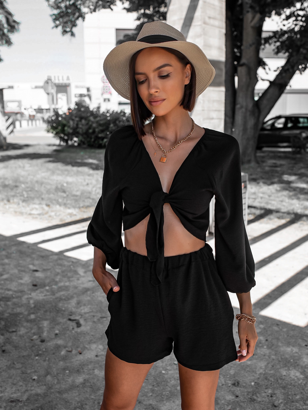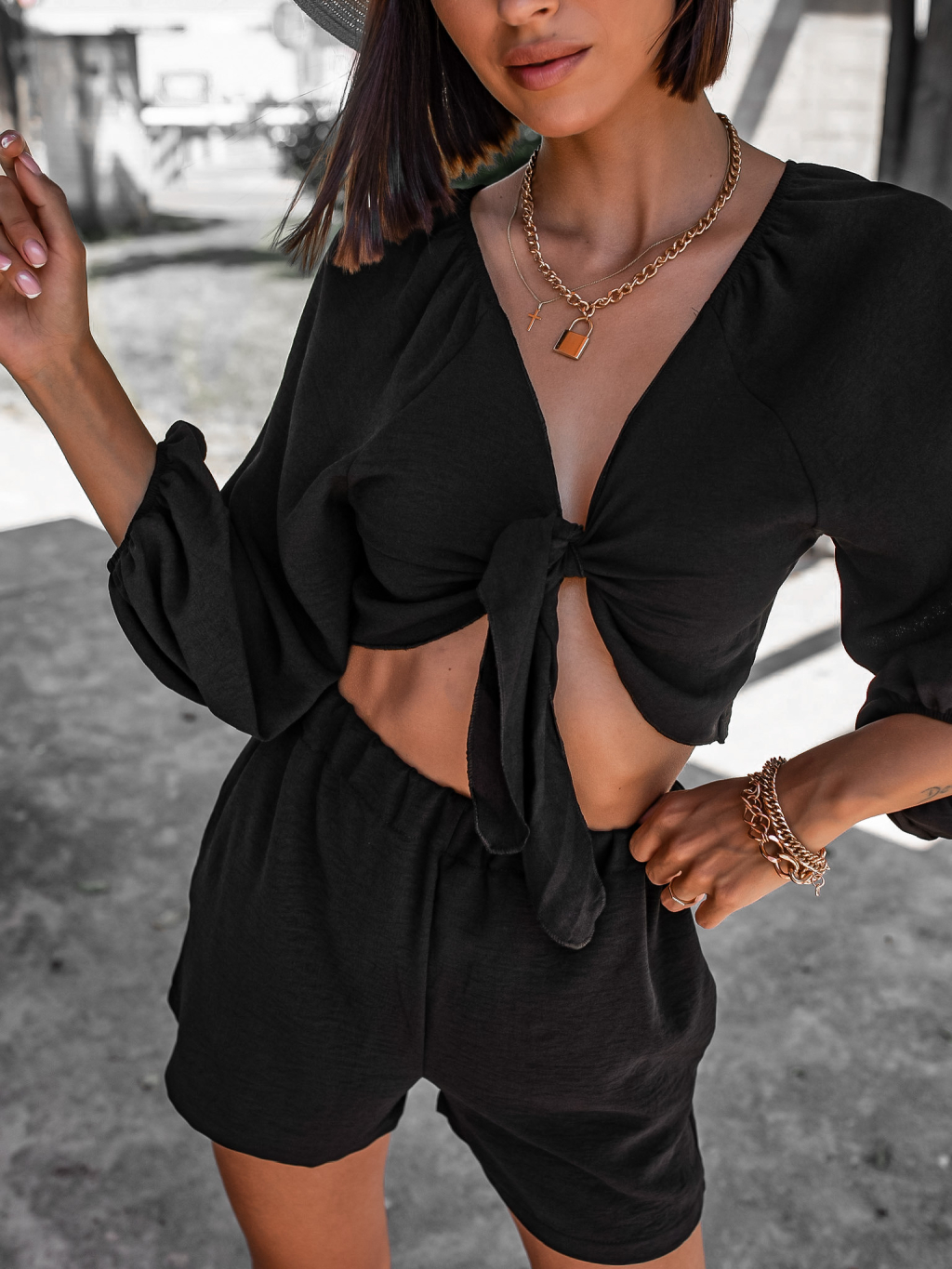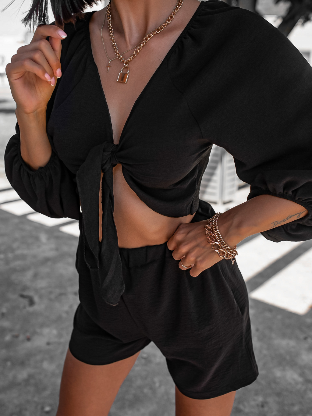 Černý krátký dvoudílný komplet AWAY s vázáním