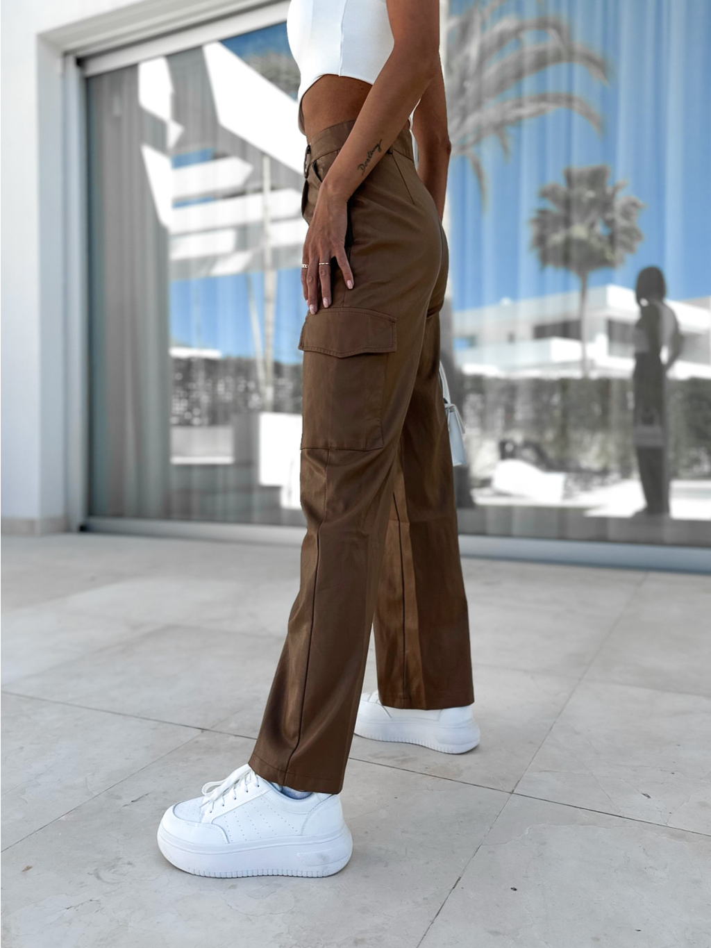 Hnědé koženkové kalhoty SOLEILE s kapsami