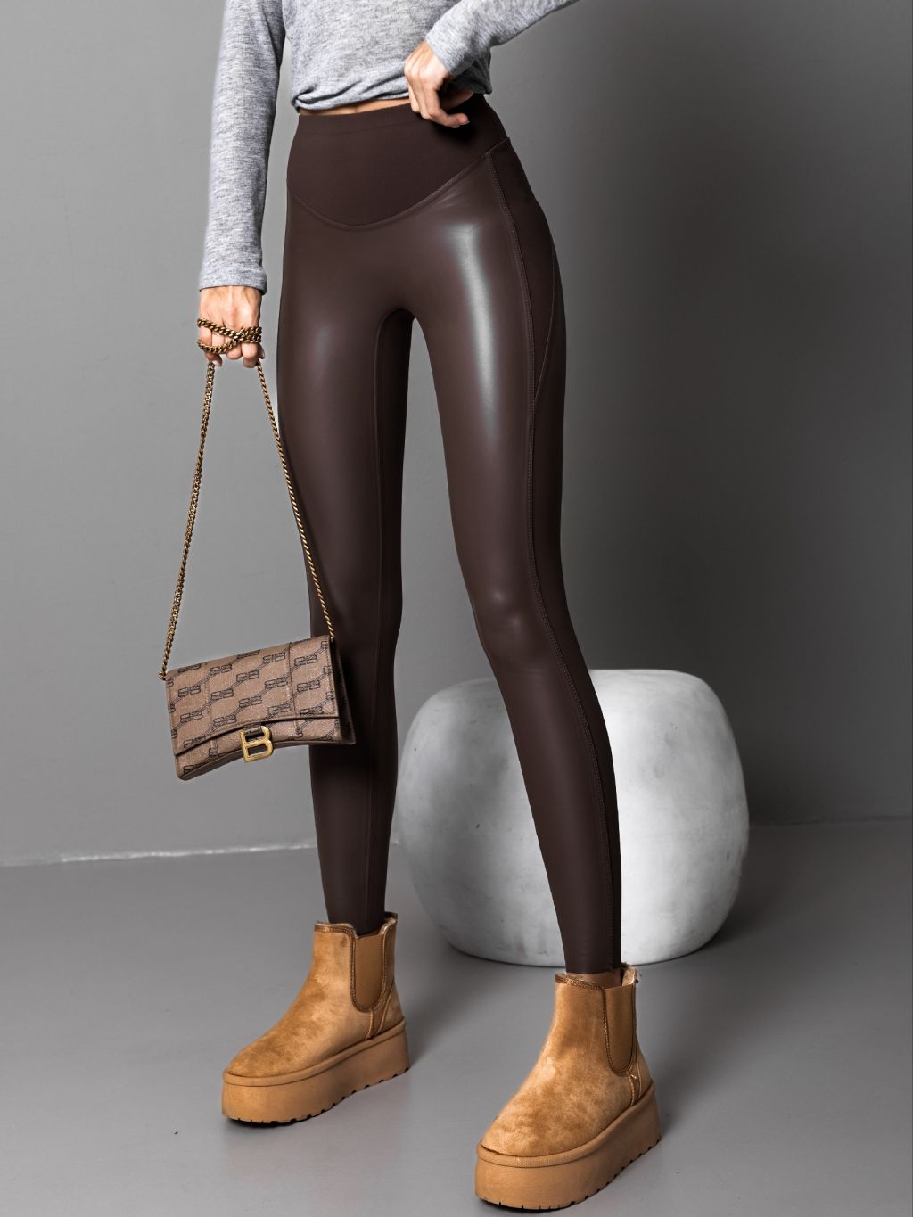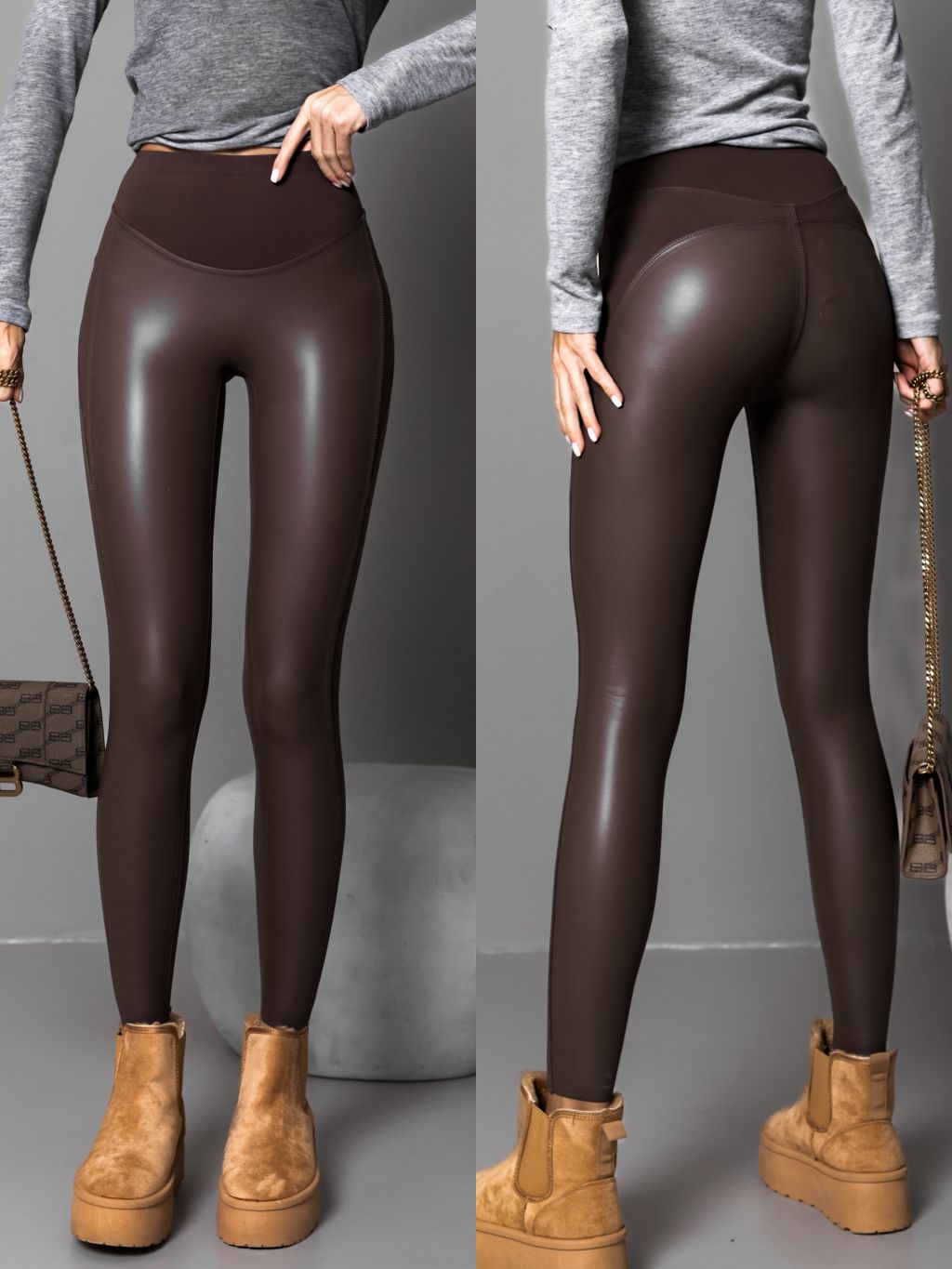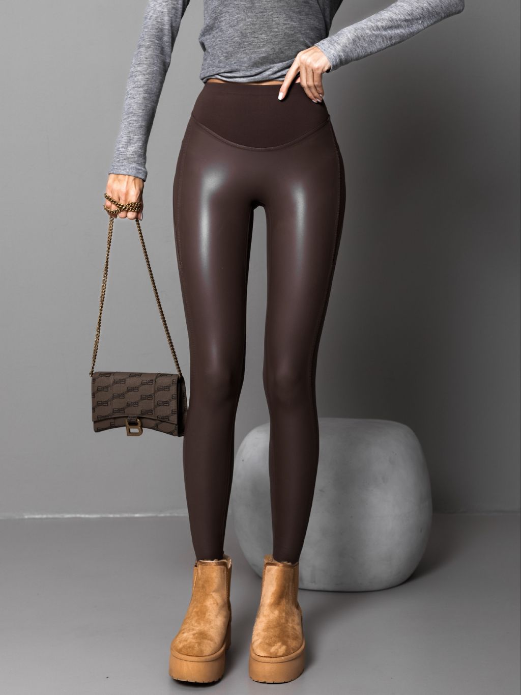 Hnědé koženkové legíny SCAEVOLA s vyšším pasem