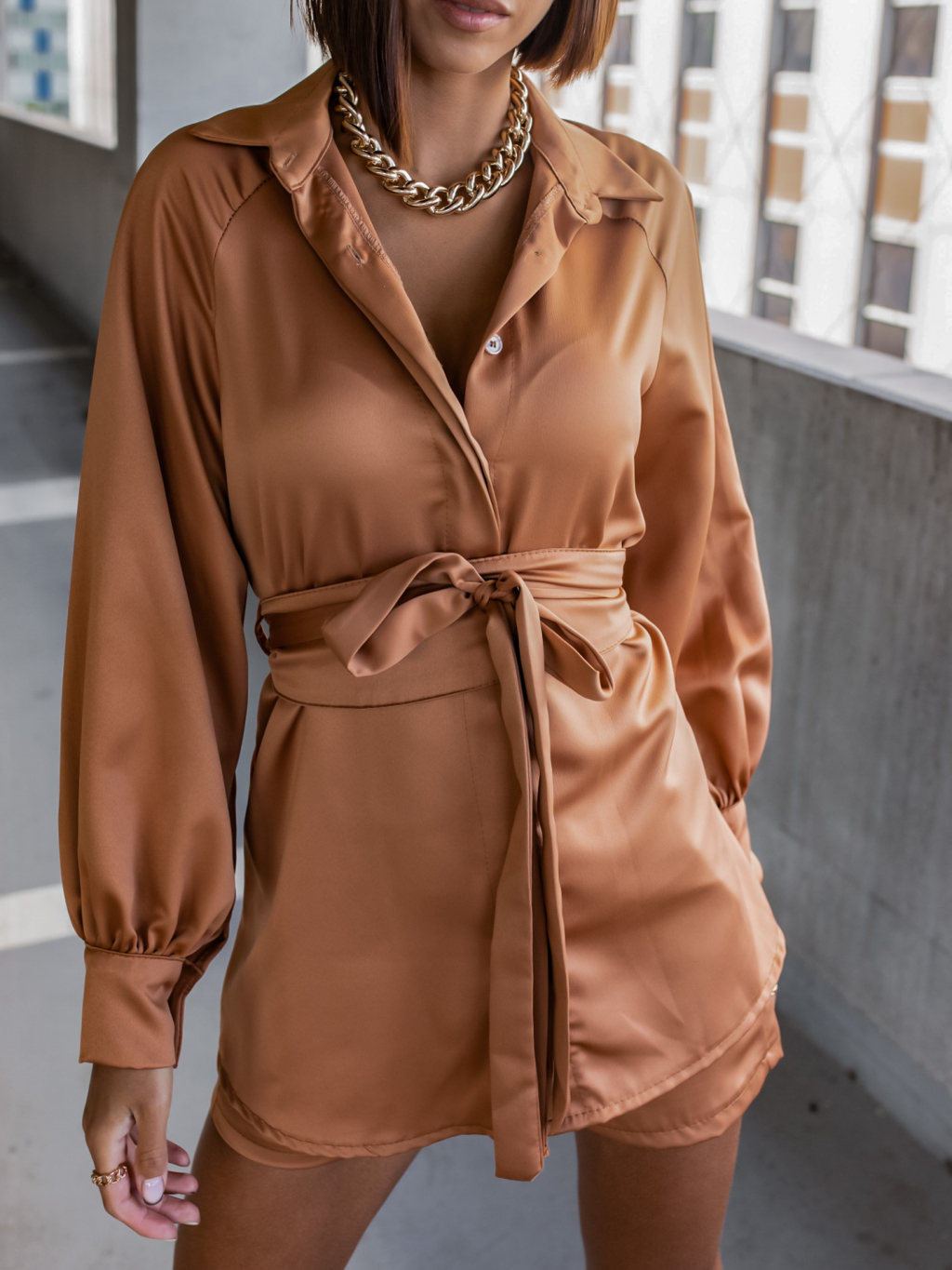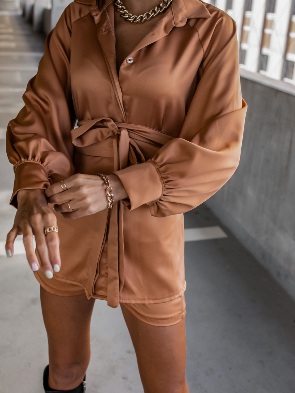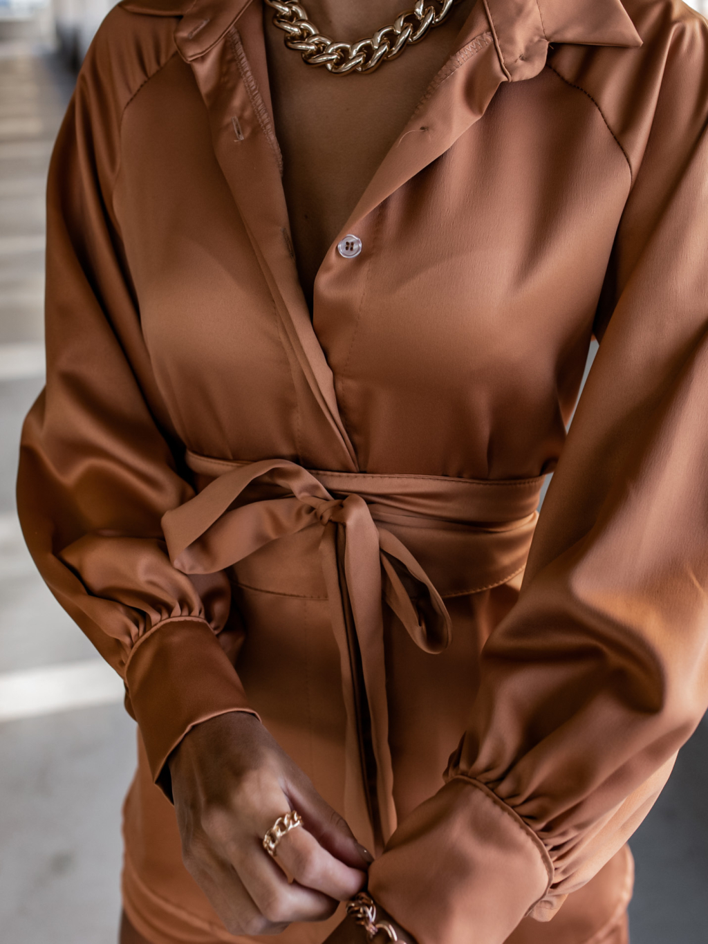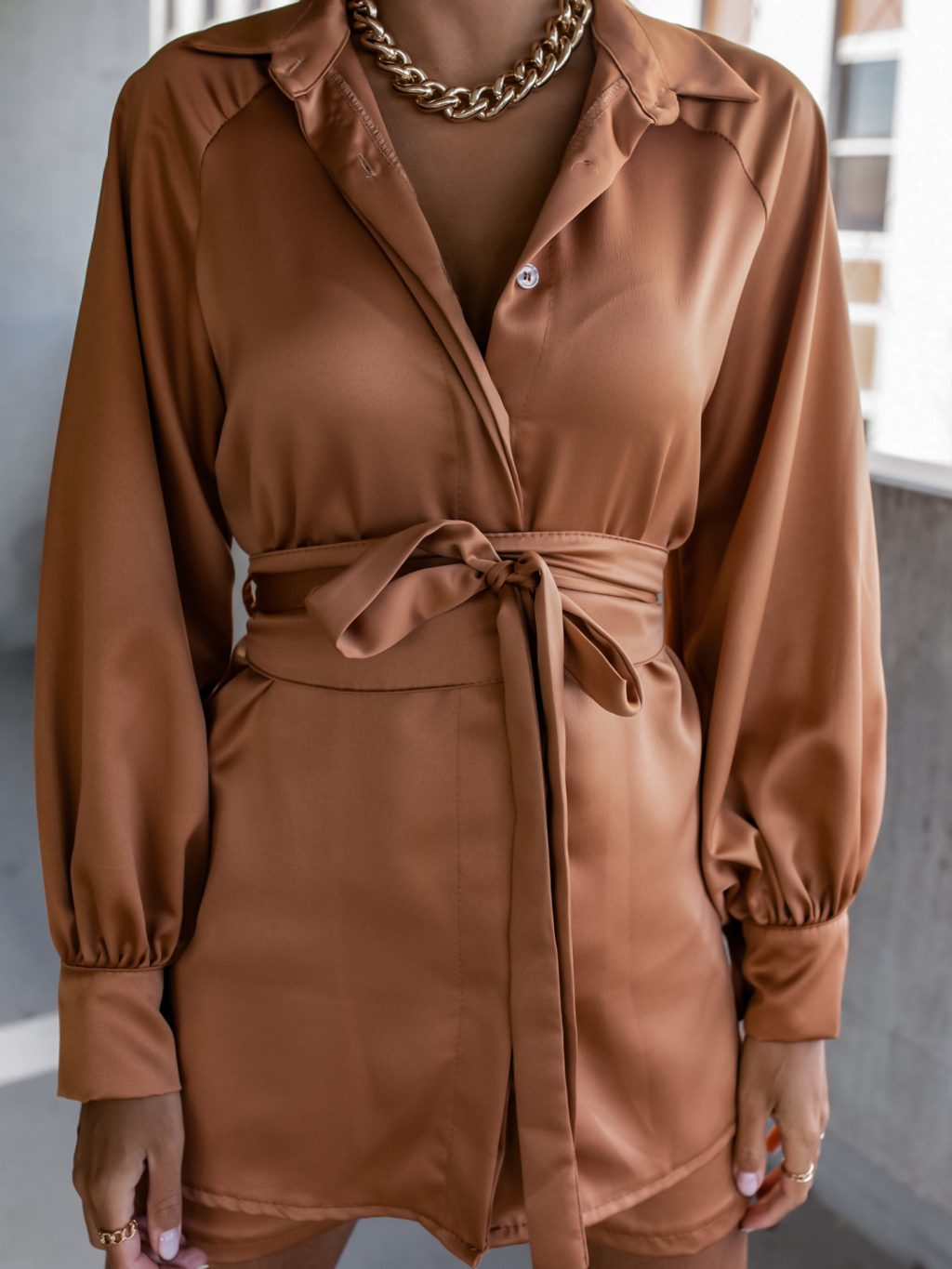 Hnědý komplet OFFER se zavazováním v pase
