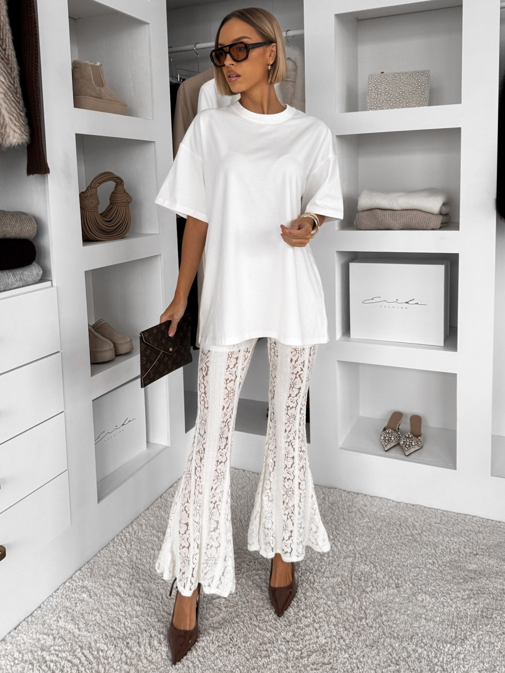 Krémové krajkové transparentní zvonové kalhoty FYNORIA
