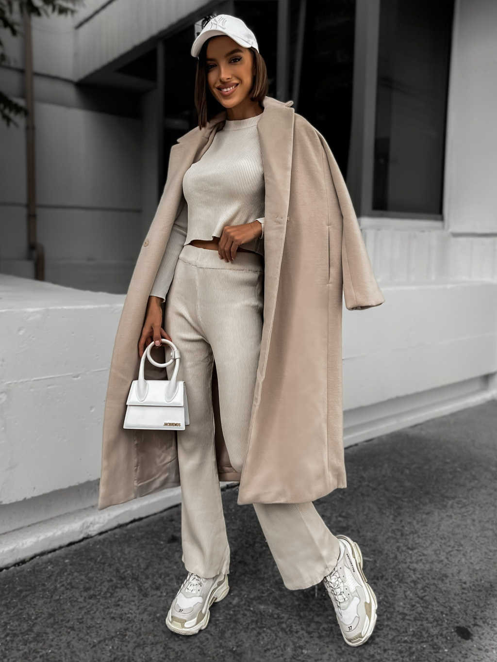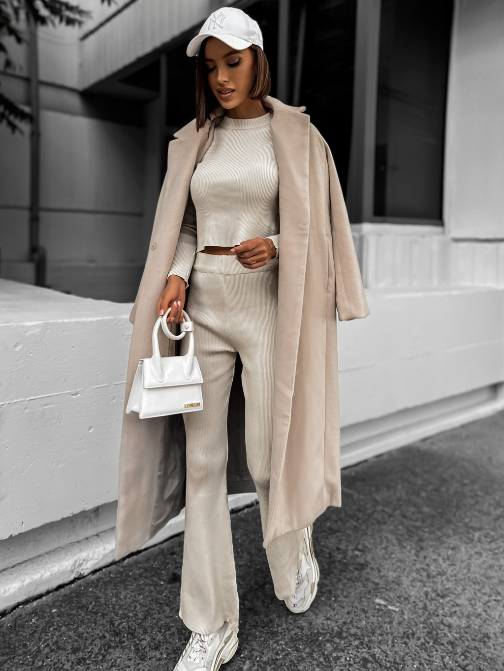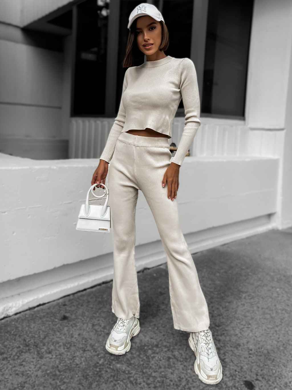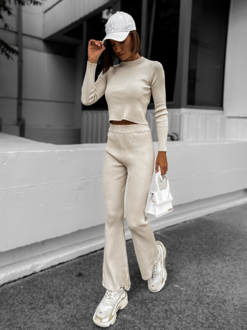 Krémový žebrovaný dvoudílný komplet WAVERLY s rozšířenými nohavicemi