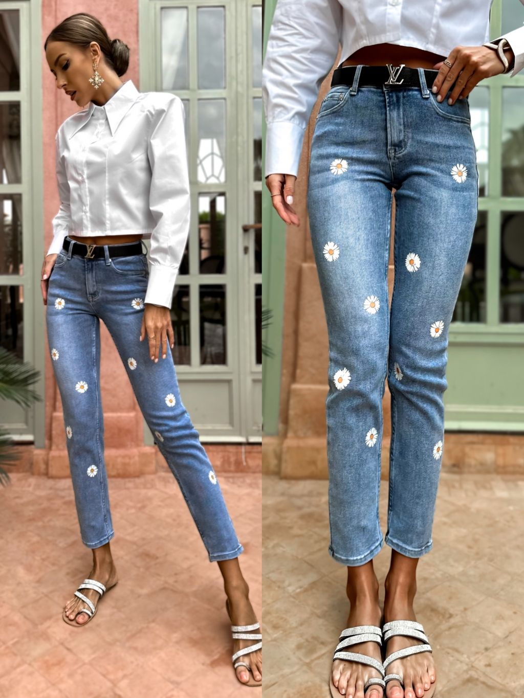 Modré slim elastické džíny BALANEN s kytičkami