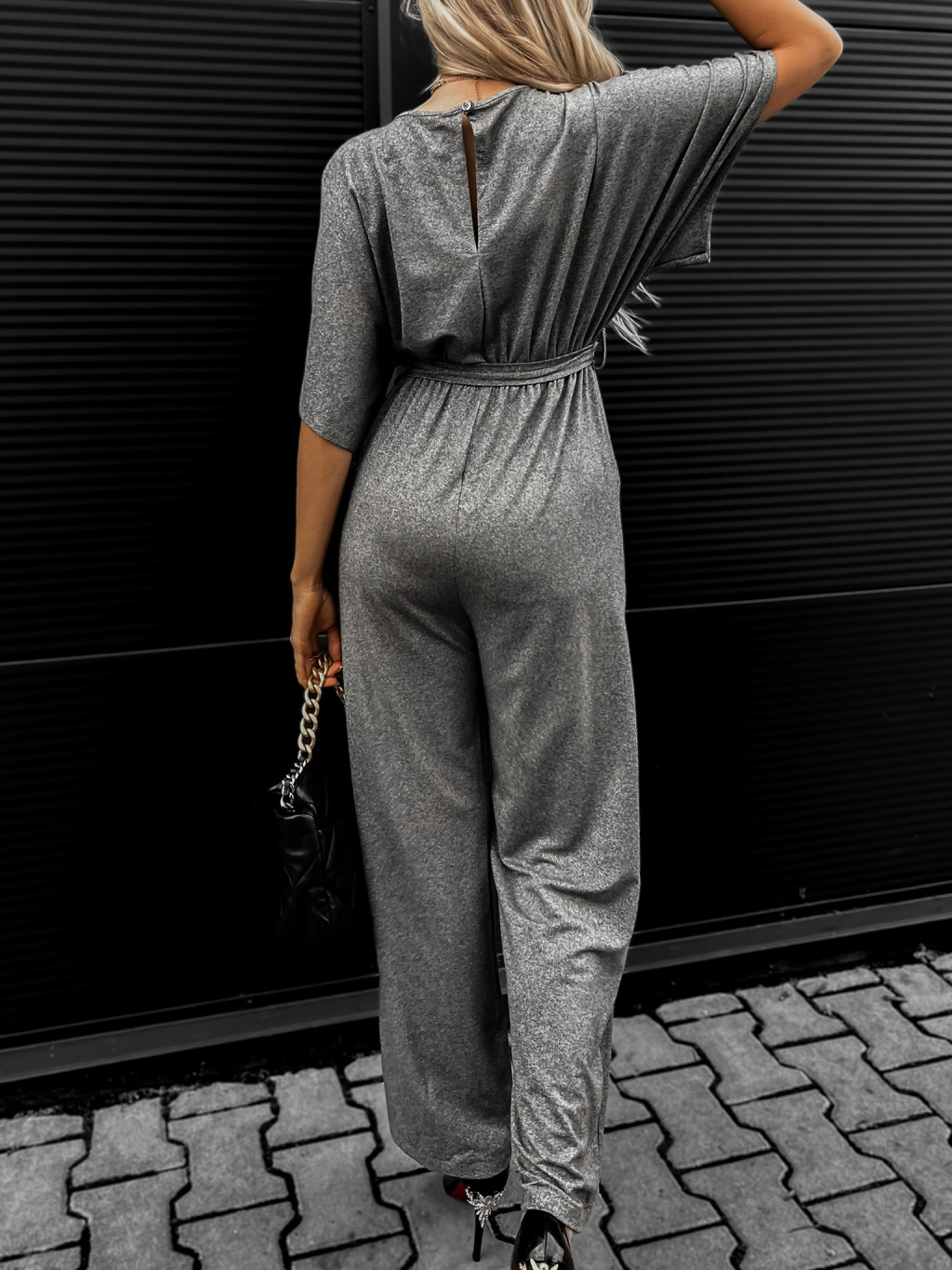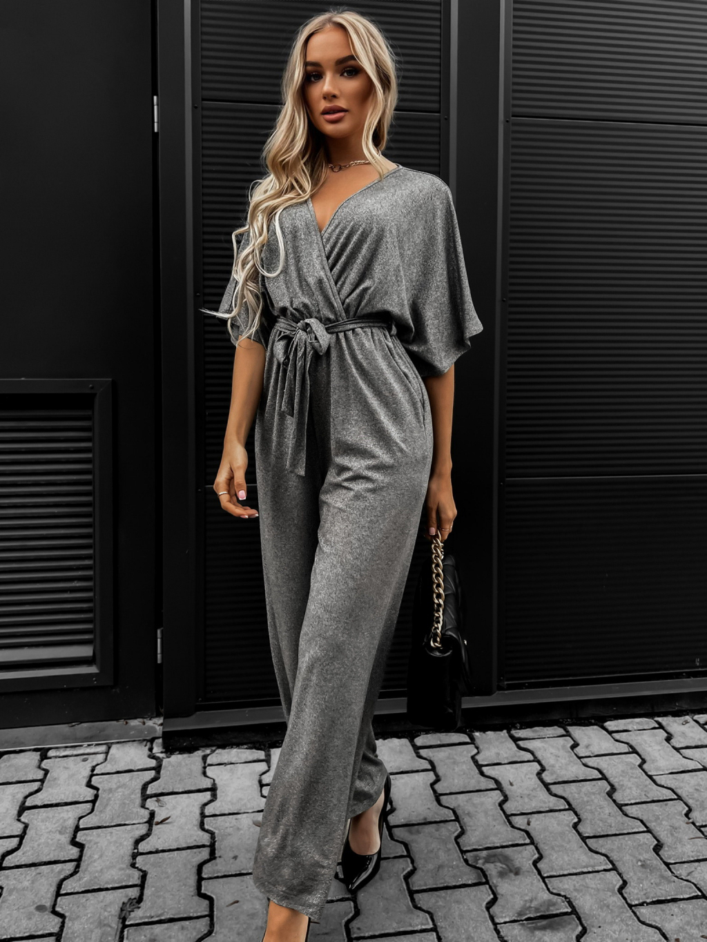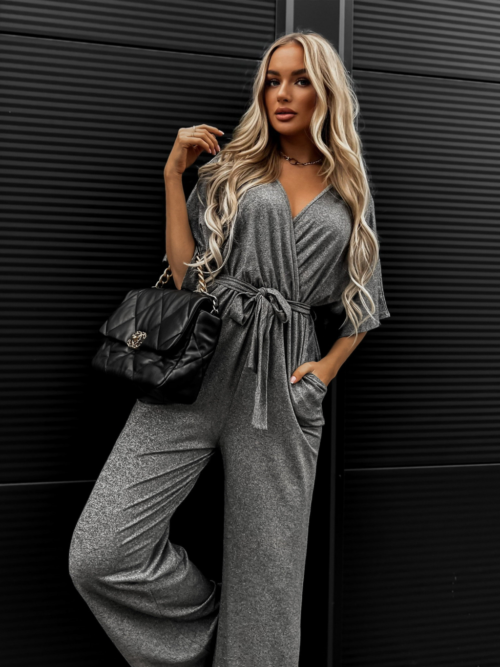 Stříbrný třpytivý elegantní overal KAIAM s vázáním v pase