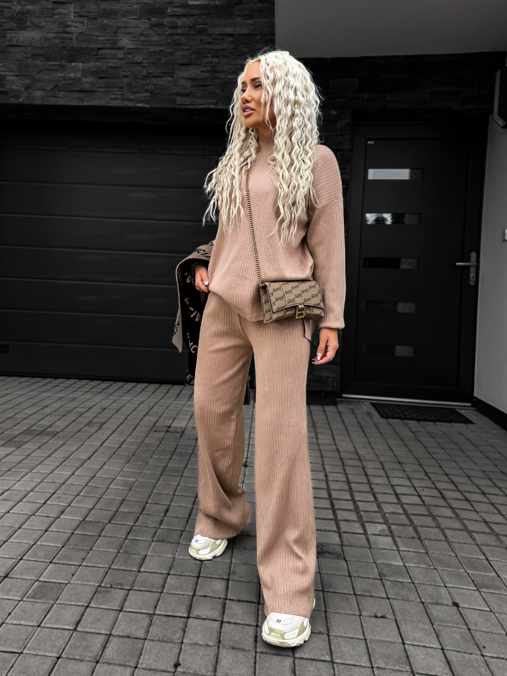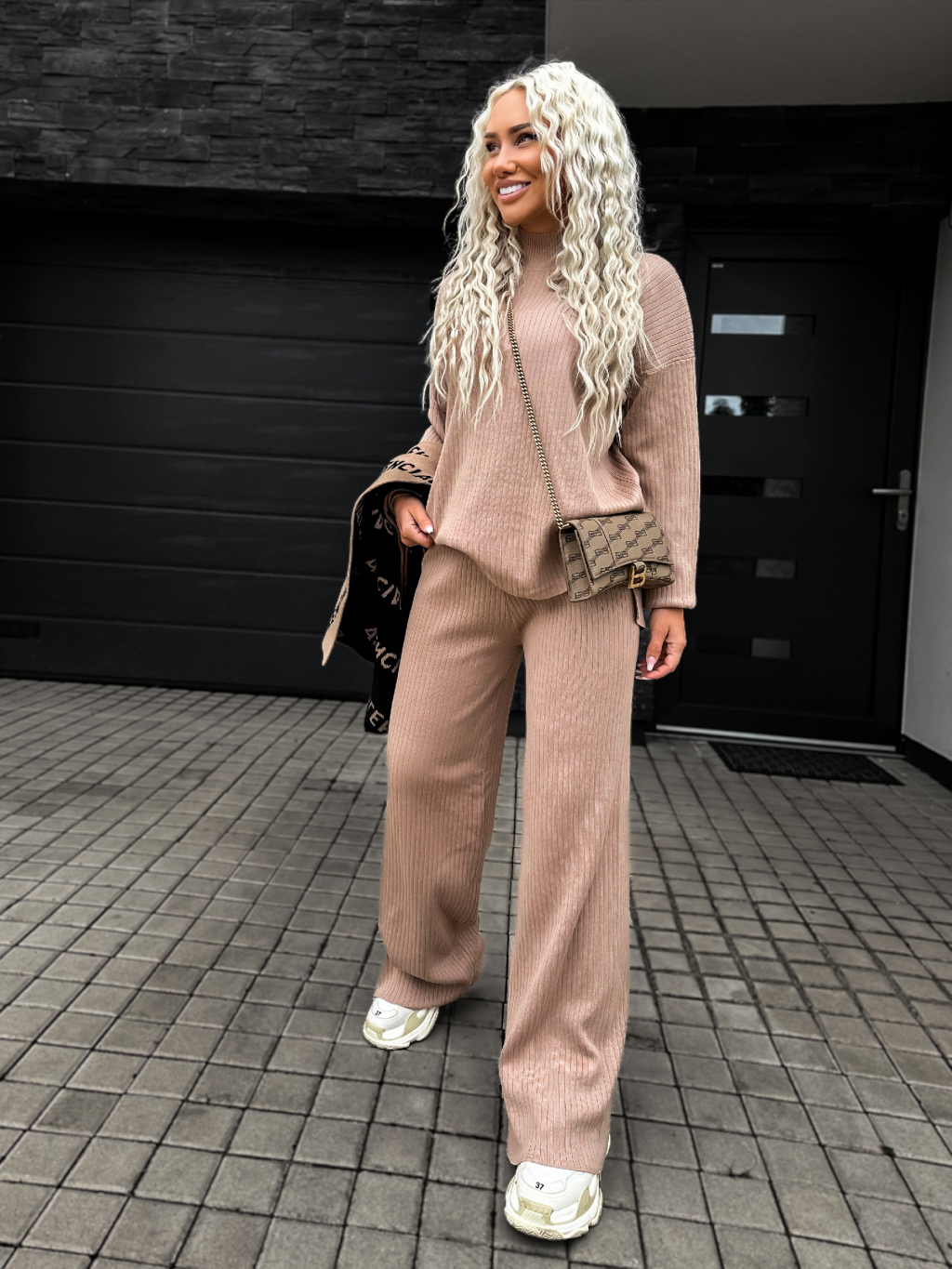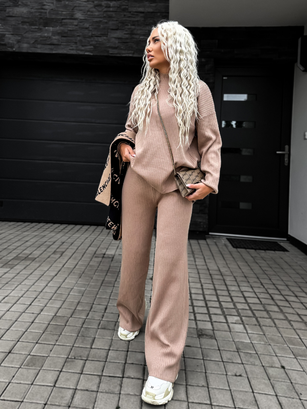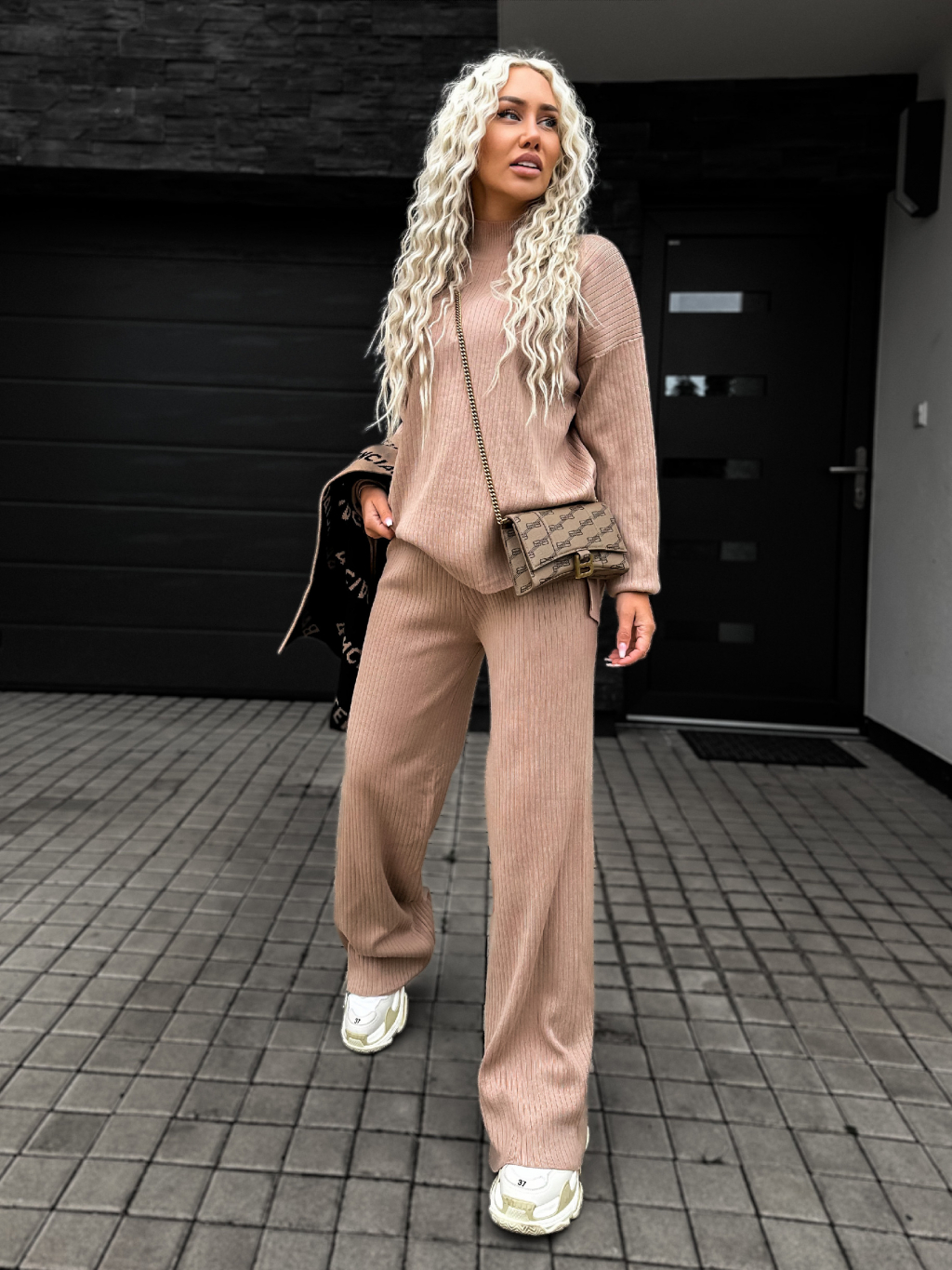 Světle hnědý žebrovaný dvoudílný komplet LELIEN s dlouhým rukávem