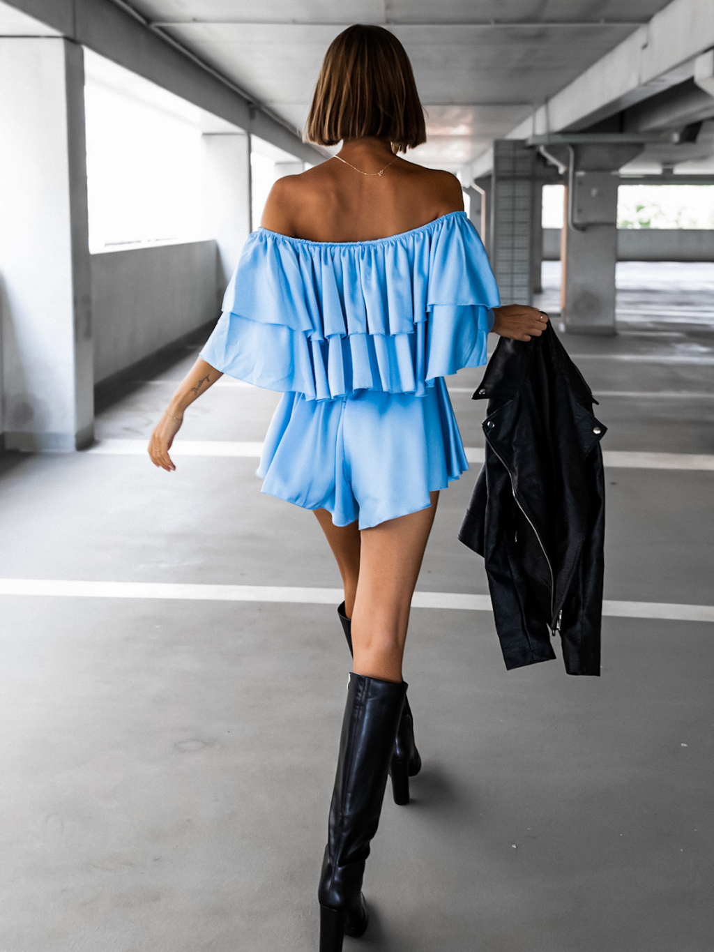 Světle modrý elegantní overal HESTIA s volánky