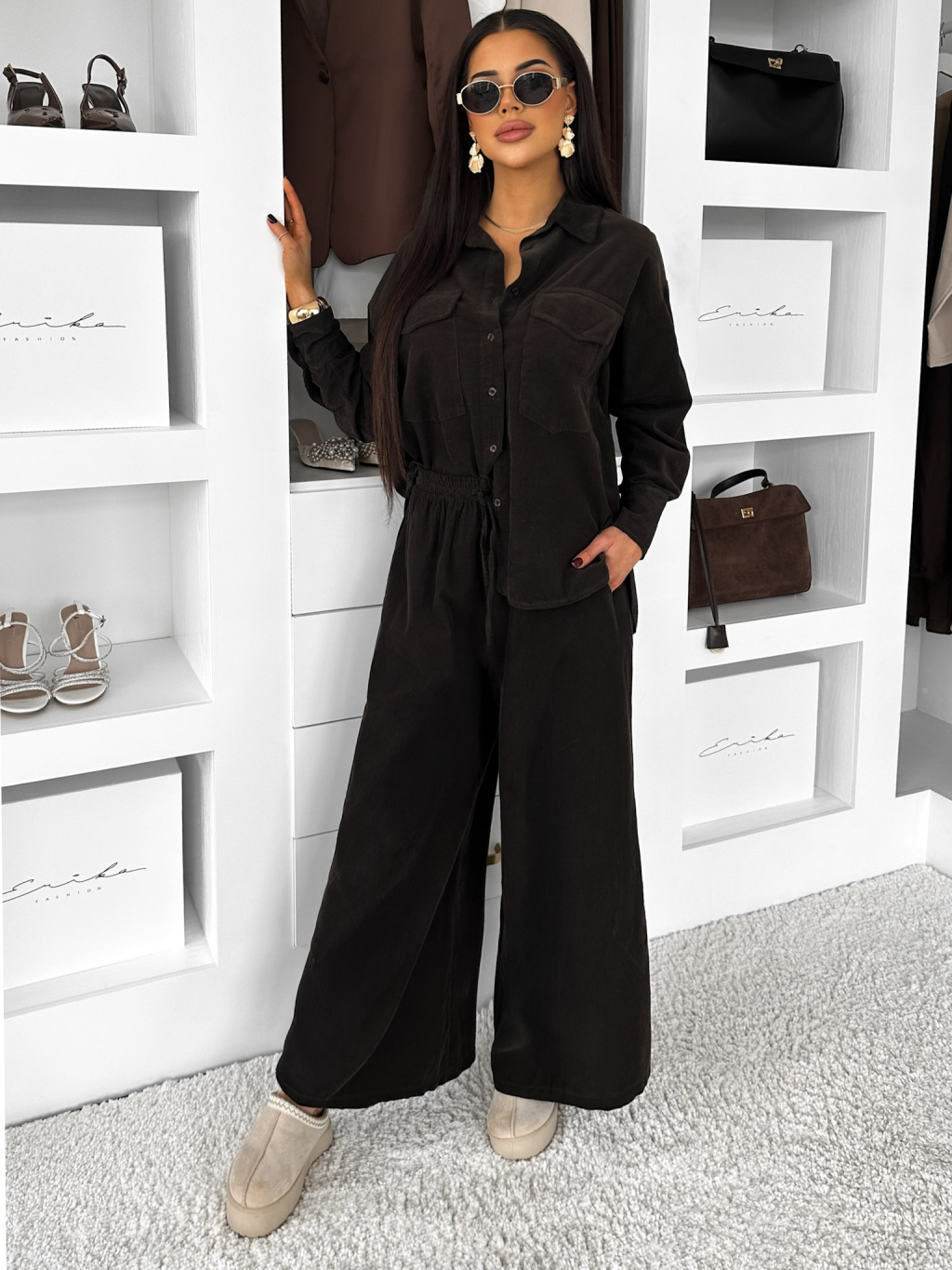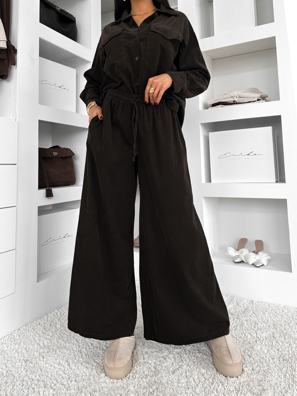 Tmavě hnědé manžestrové široké kalhoty VORELLE