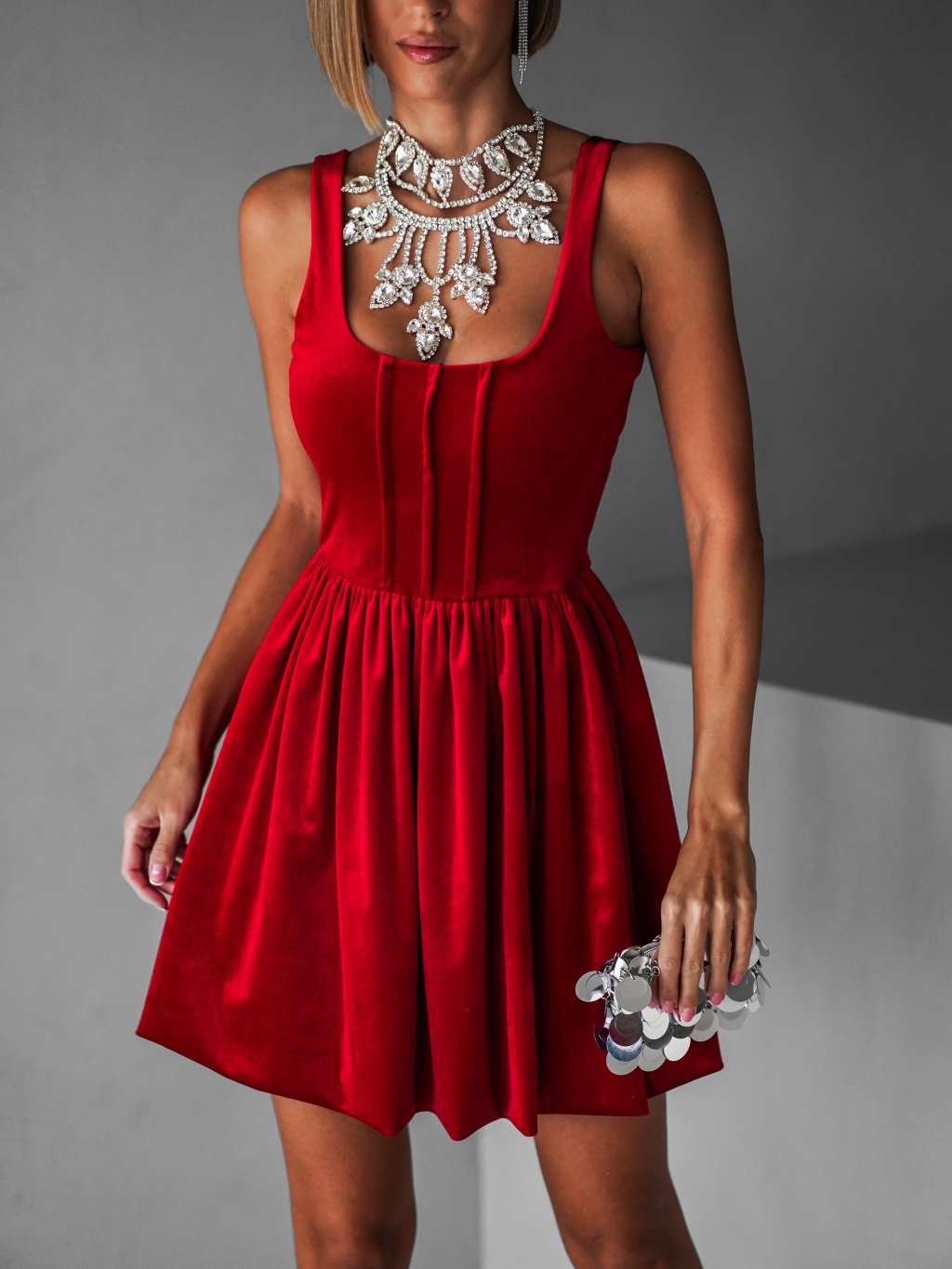 Červené krátké sametové vypasované šaty KALLIAS