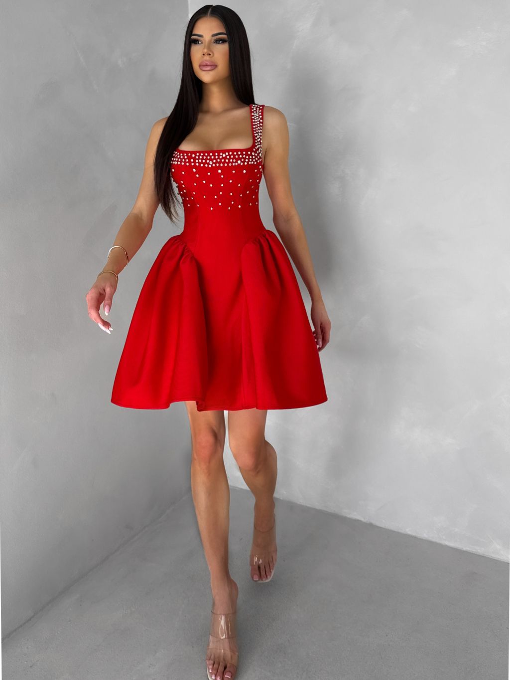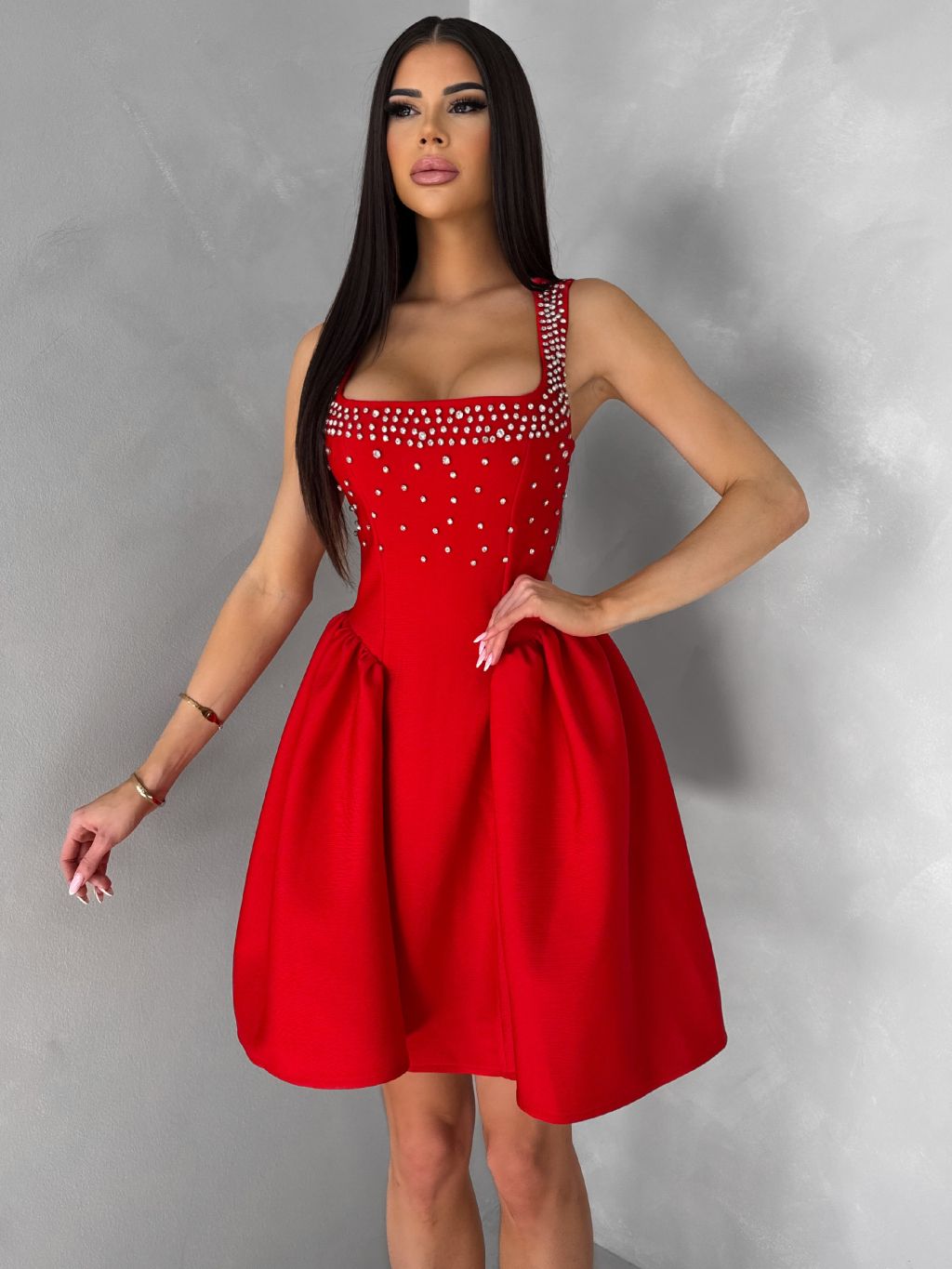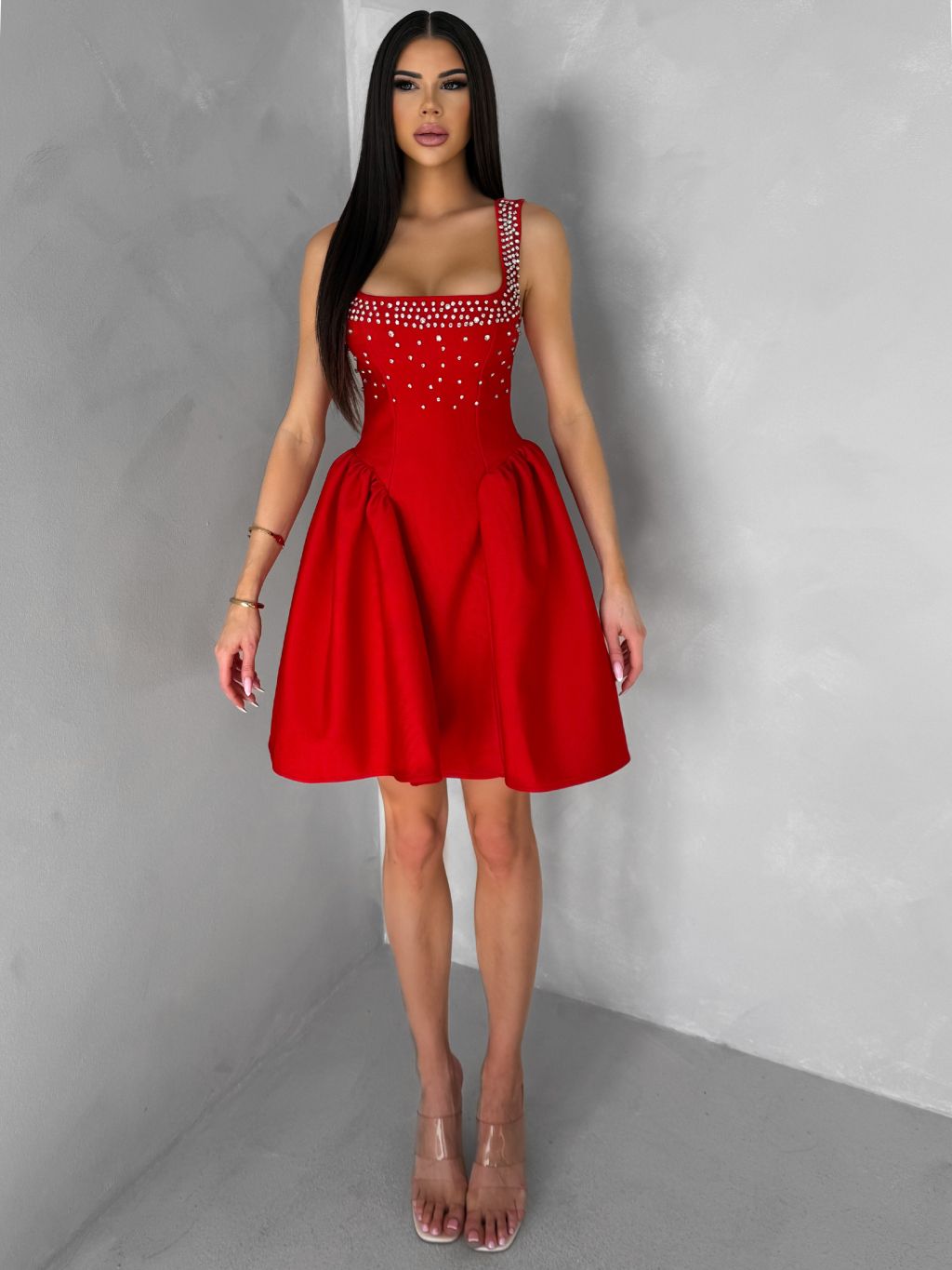 Červené krátké vypasované áčkové šaty MIRELYS s kamínky