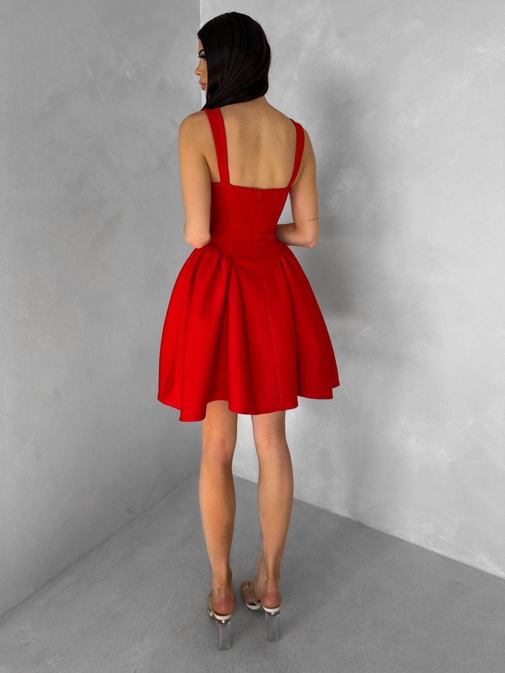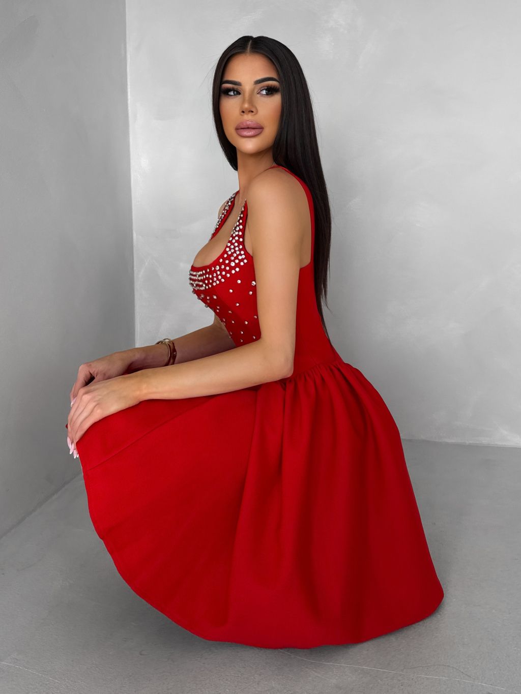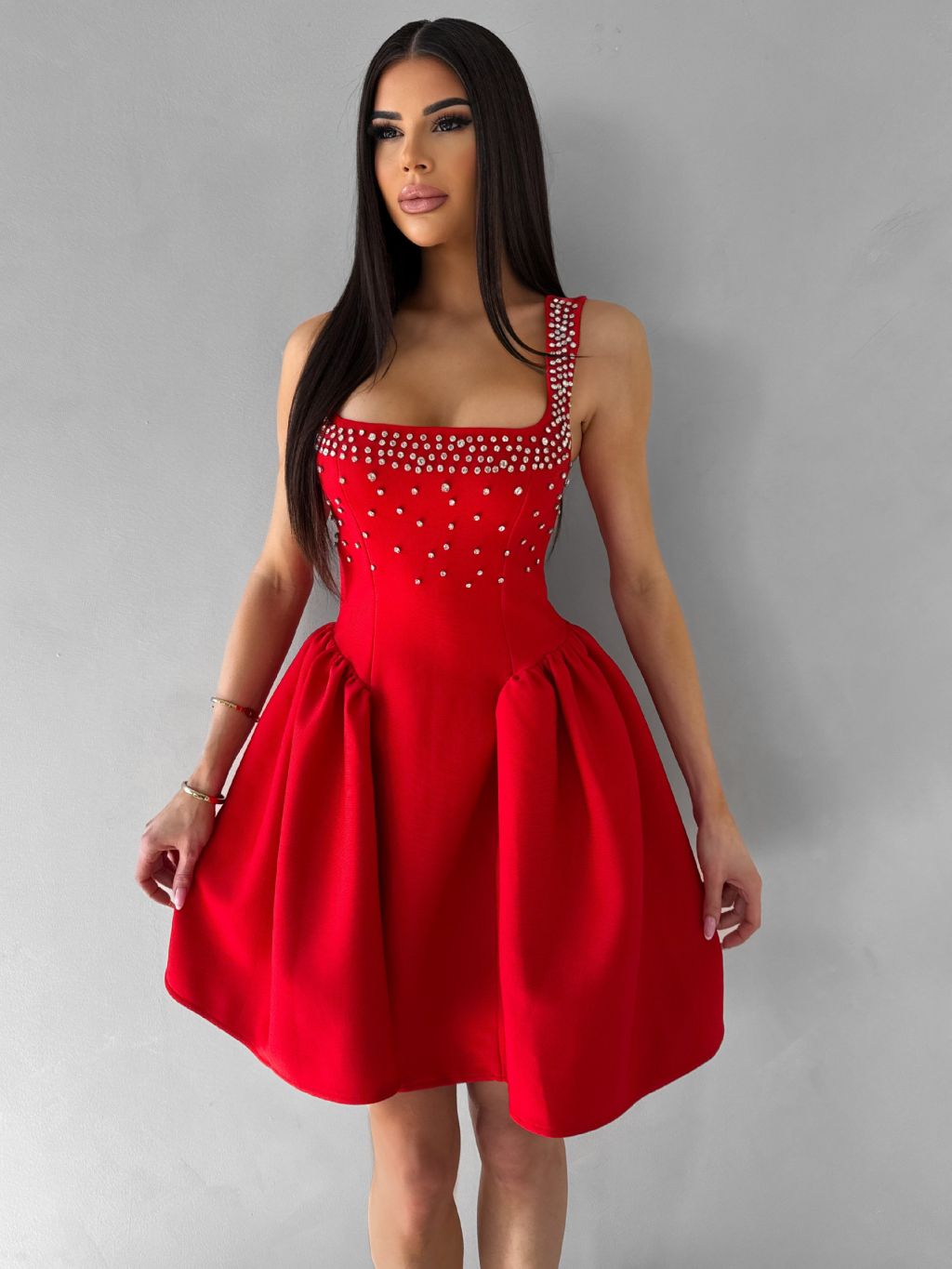 Červené krátké vypasované áčkové šaty MIRELYS s kamínky