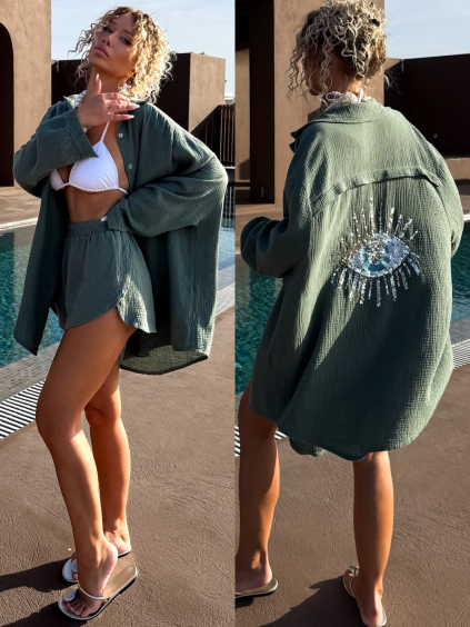 Khaki mušelínová oversize košile BOGUSY s flitry
