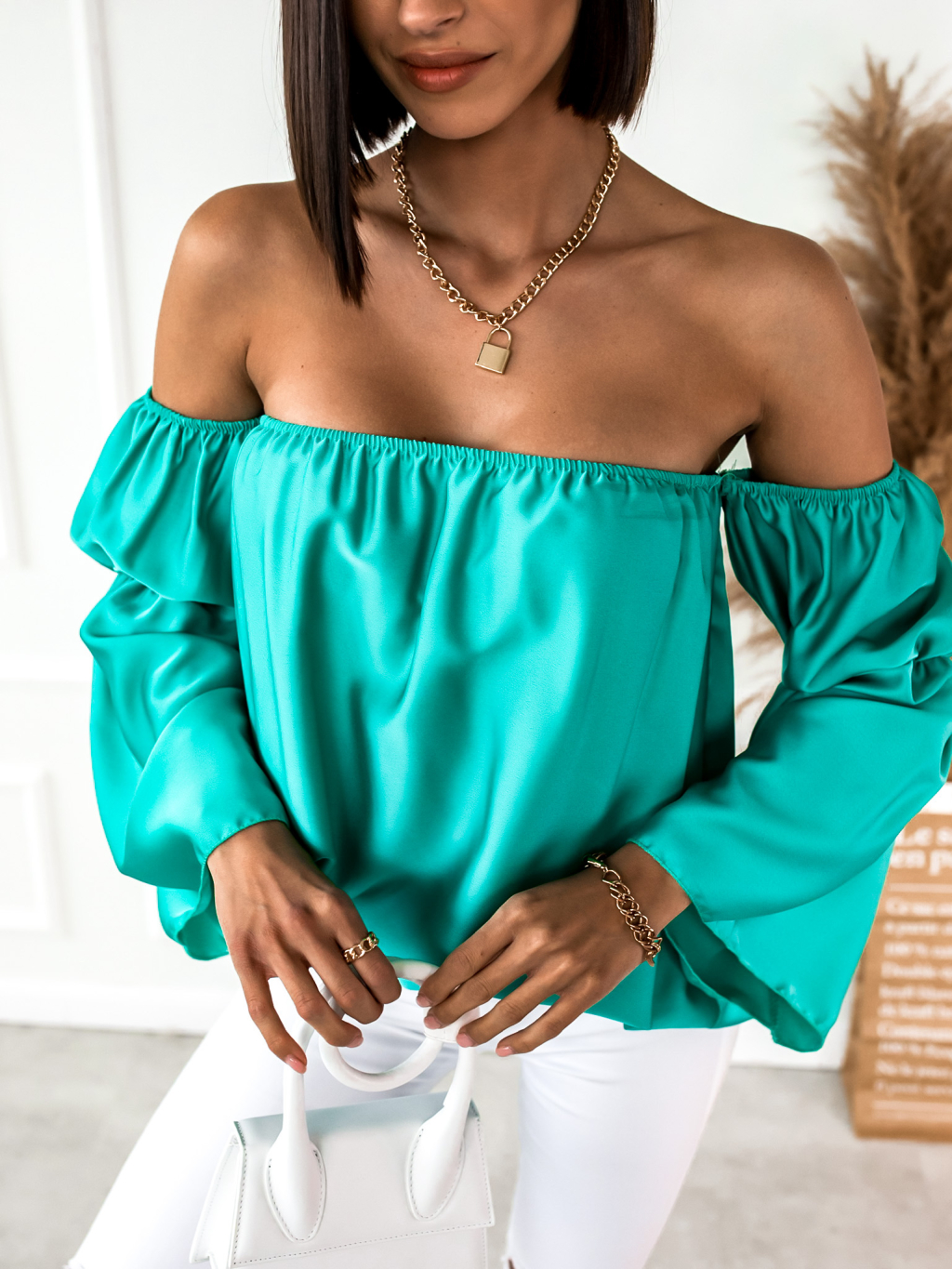 Tyrkysová lesklá halenka MELISSA s odhalenými rameny