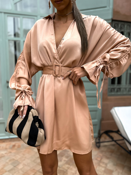 Pro minimalistický look kombinuj lesklé šaty s jemnými šperky a jednoduchými sandálky na podpatku, přidej kabelku v podobných tónech. Milujeme detaily v podobě vyhrnutých rukávů a pásku v pase. Ty dotvoří dokonalý styling.