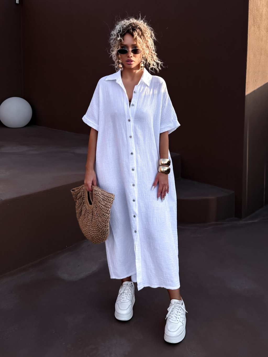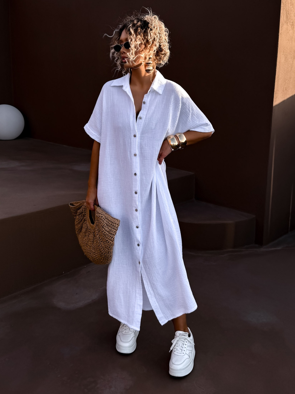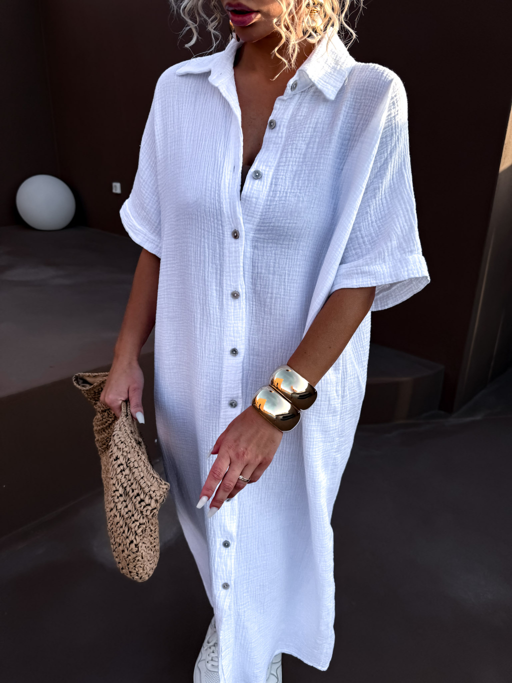 Bílé dlouhé mušelínové košilové šaty NUKET s krátkým rukávem