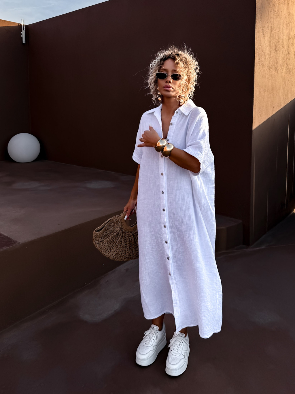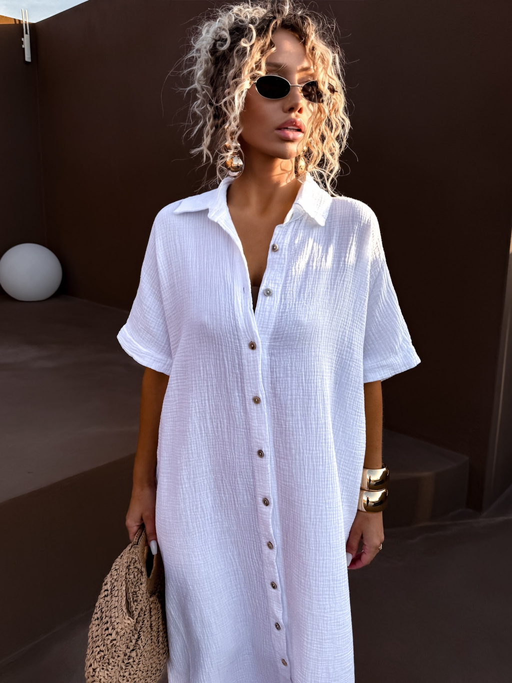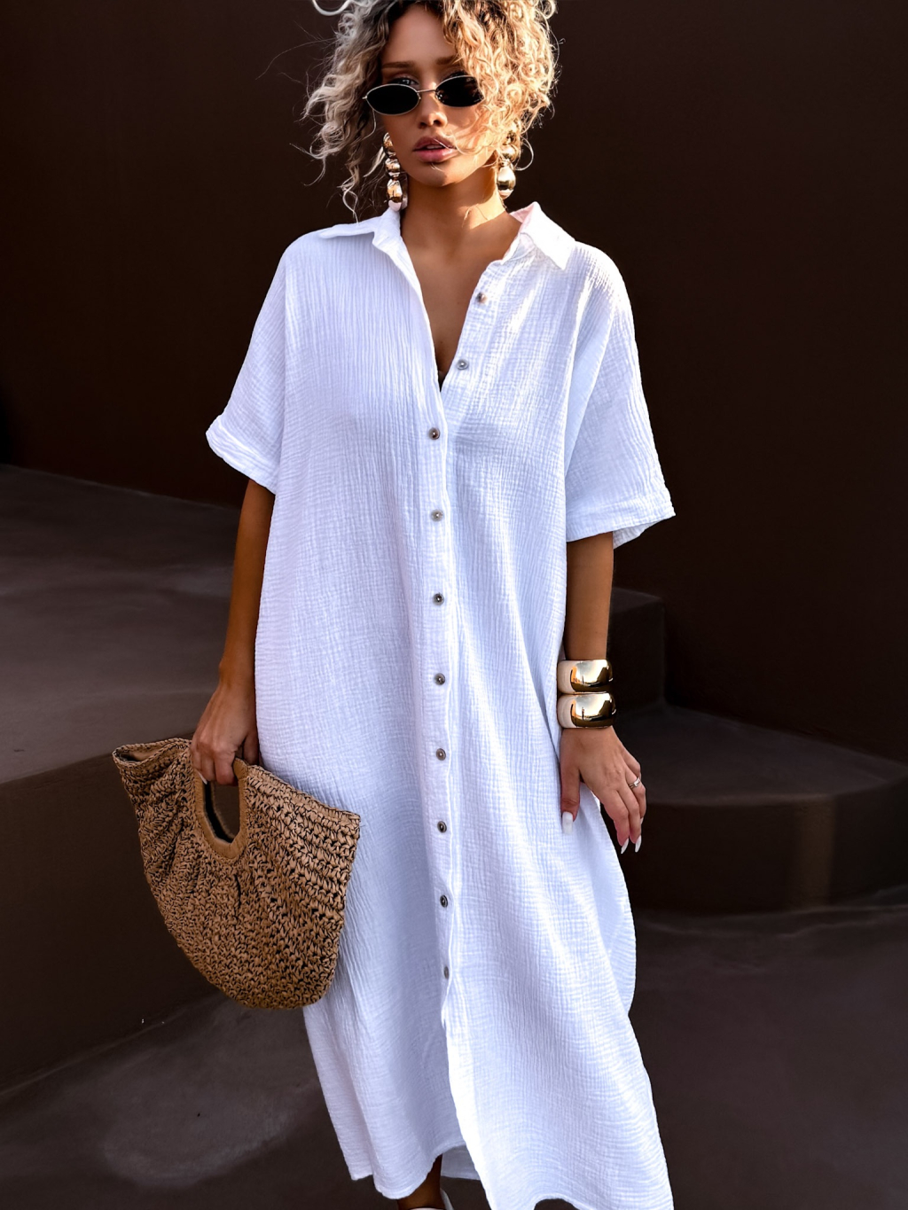 Bílé dlouhé mušelínové košilové šaty NUKET s krátkým rukávem