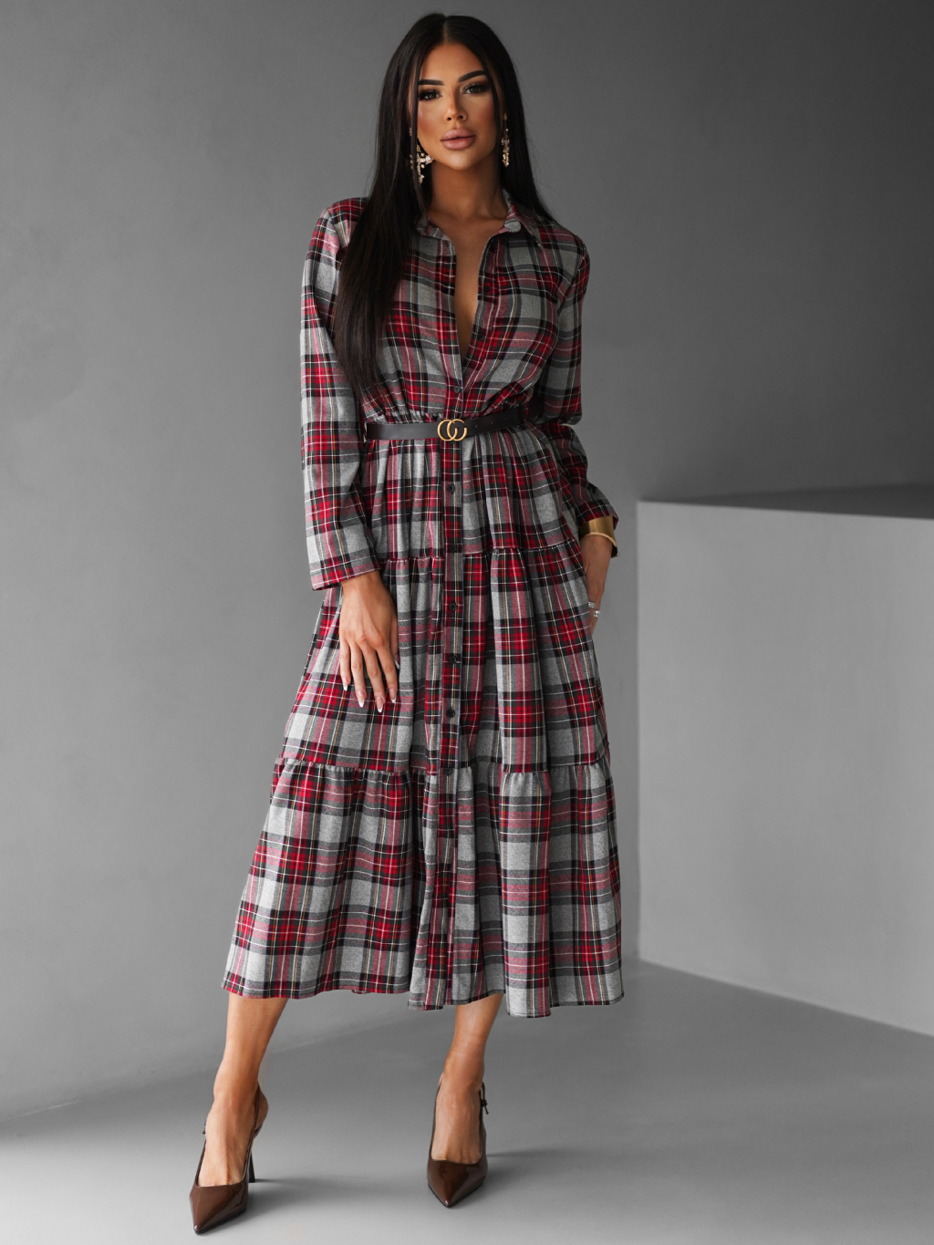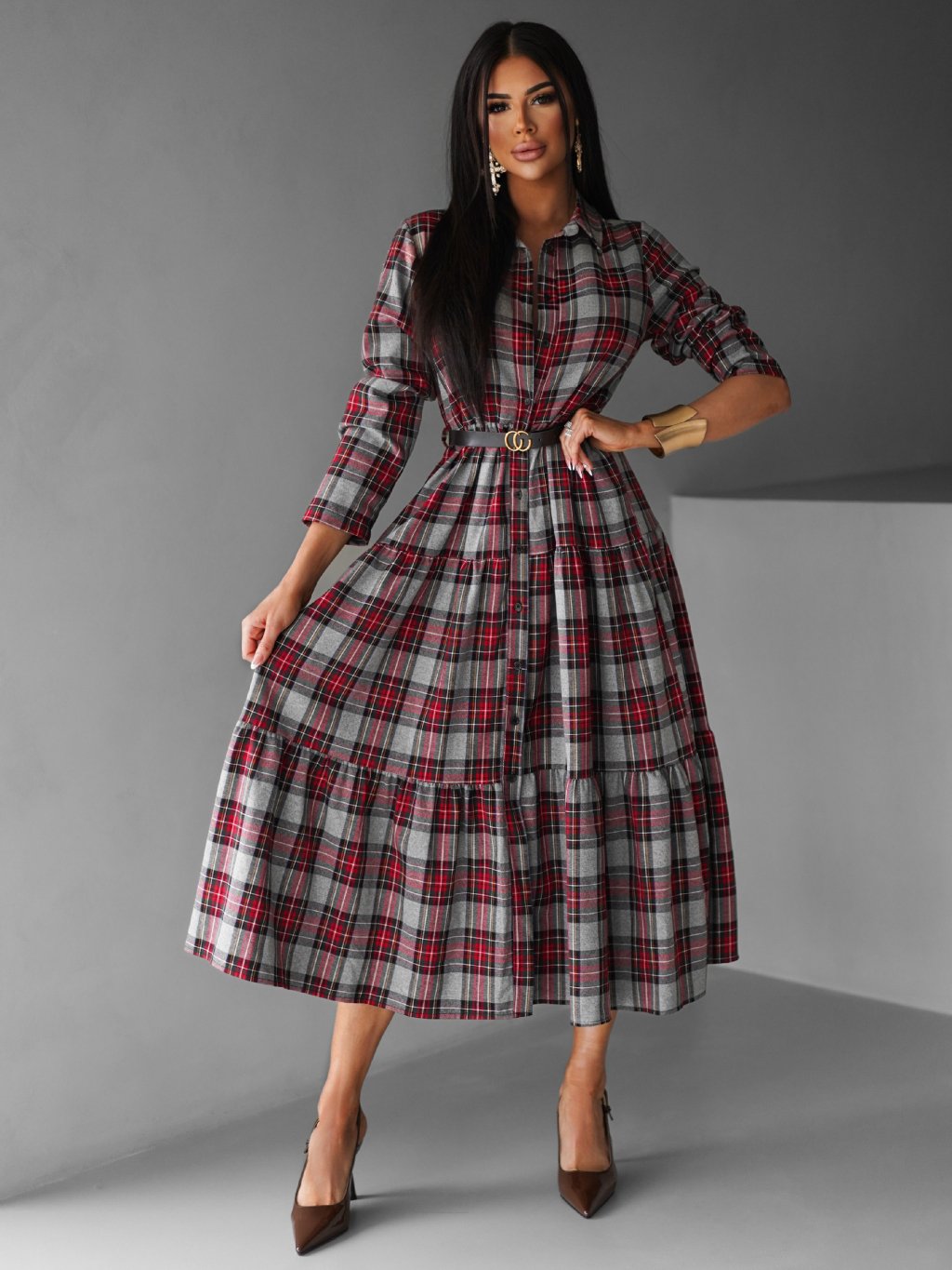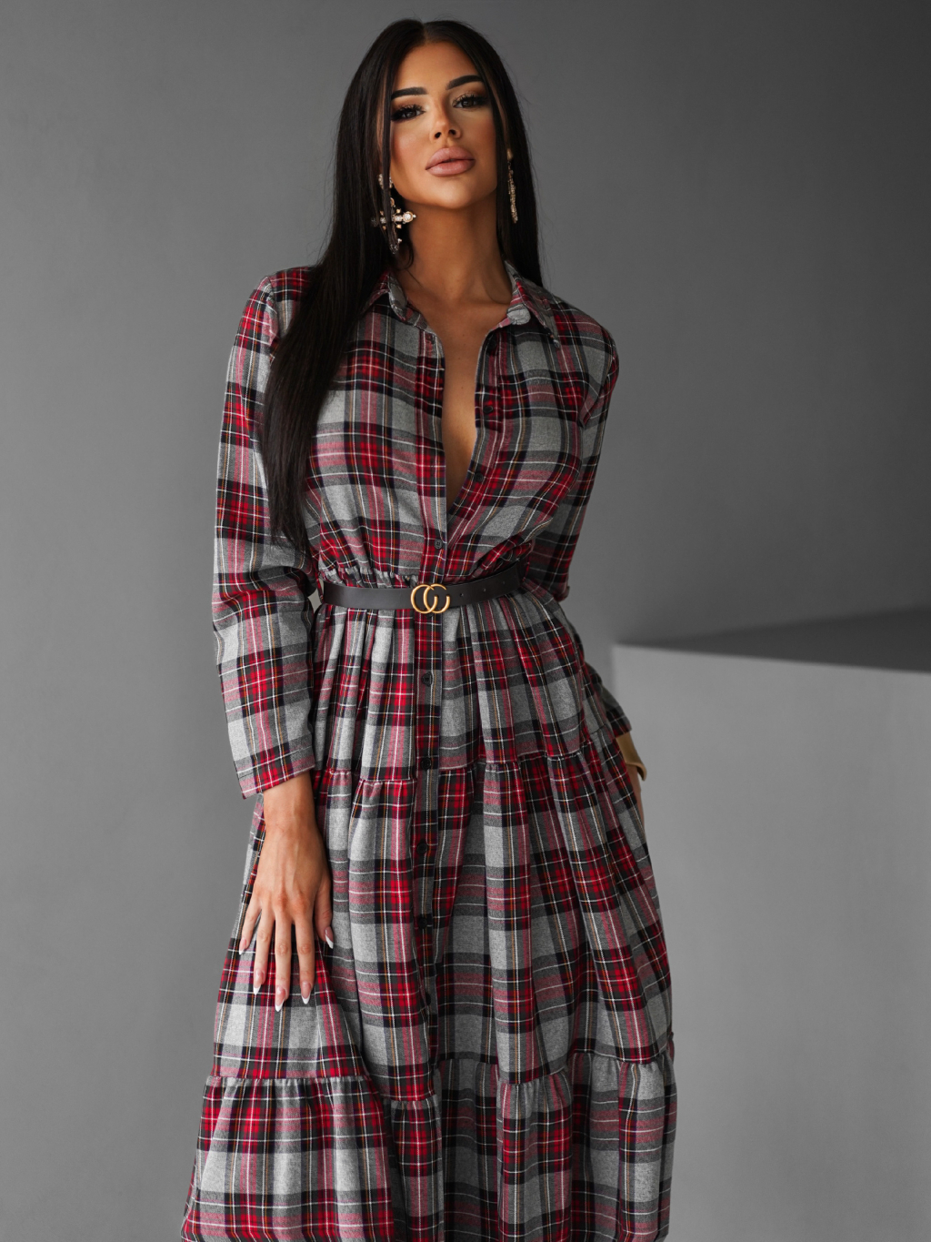 Šedočervené bavlněné košilové šaty BARRYS s páskem
