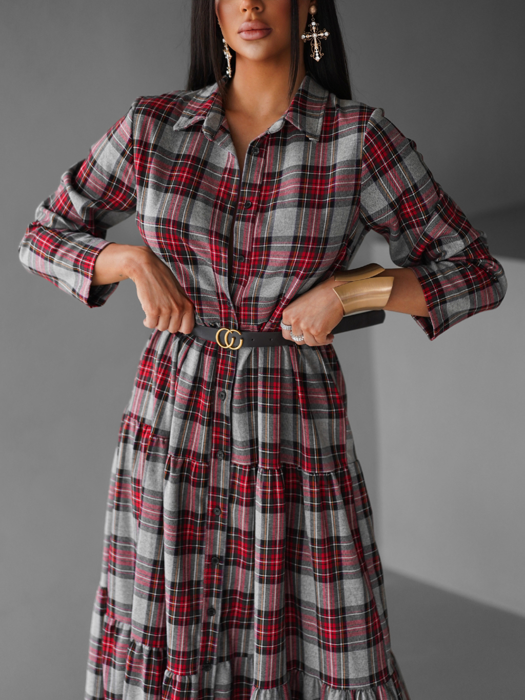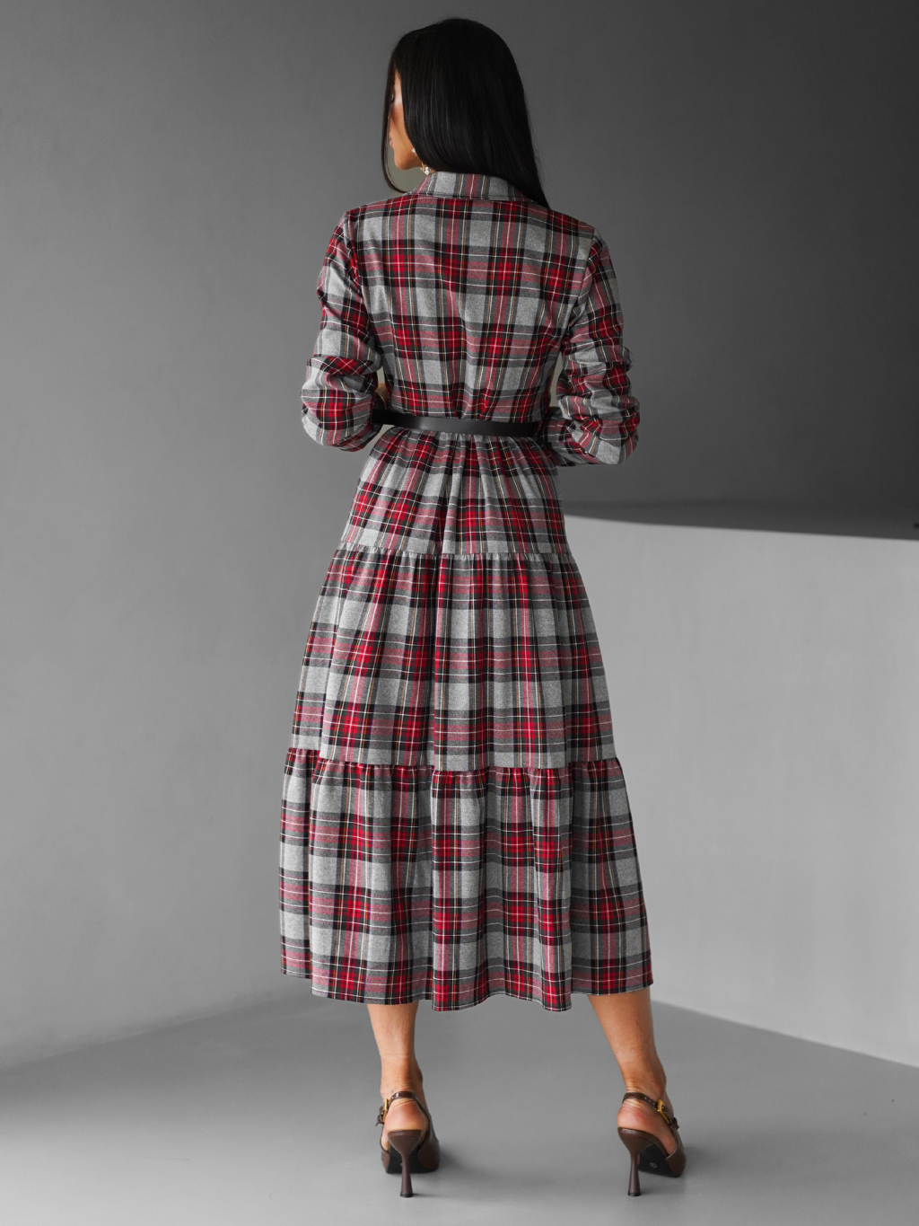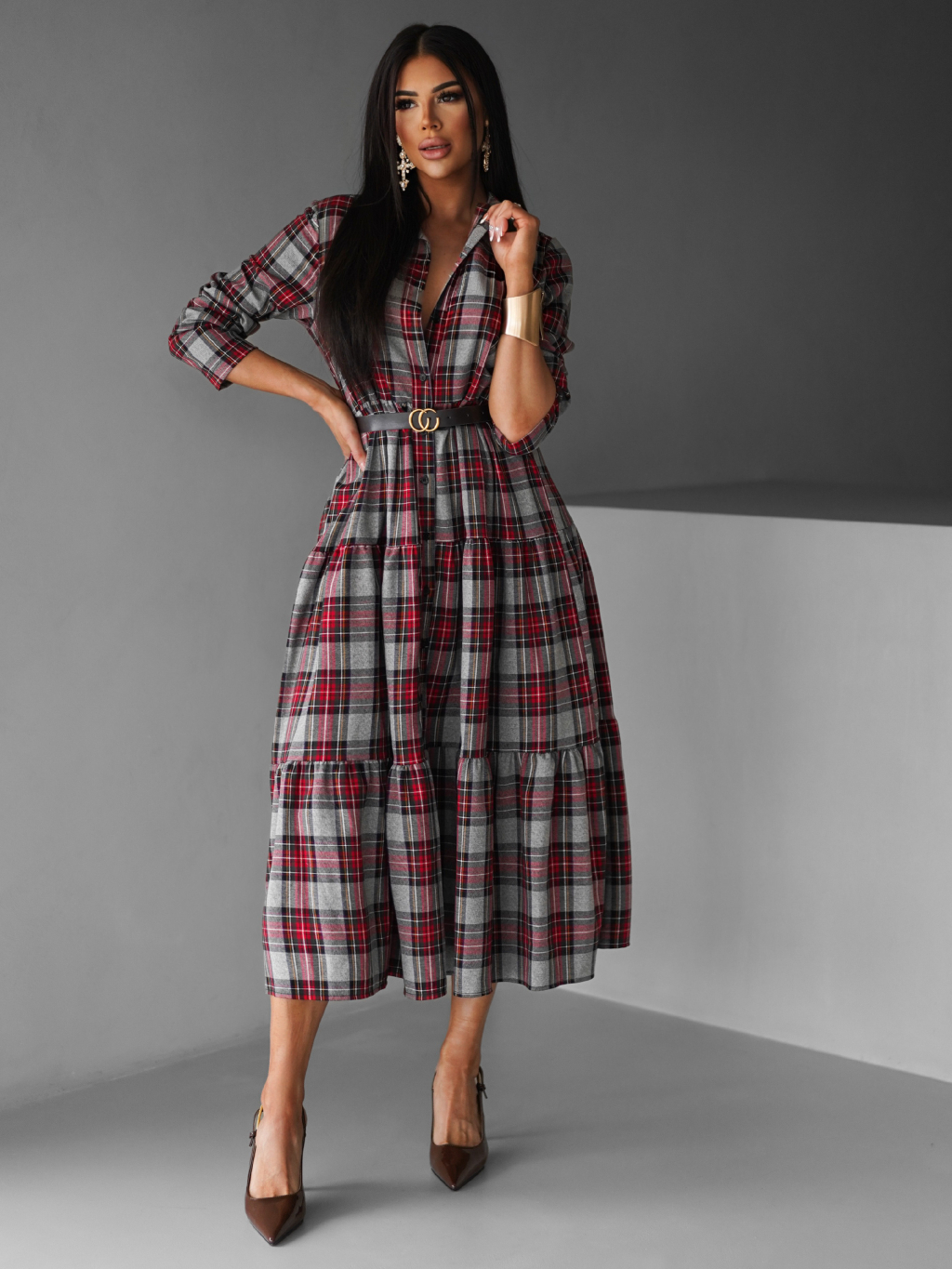 Šedočervené bavlněné košilové šaty BARRYS s páskem