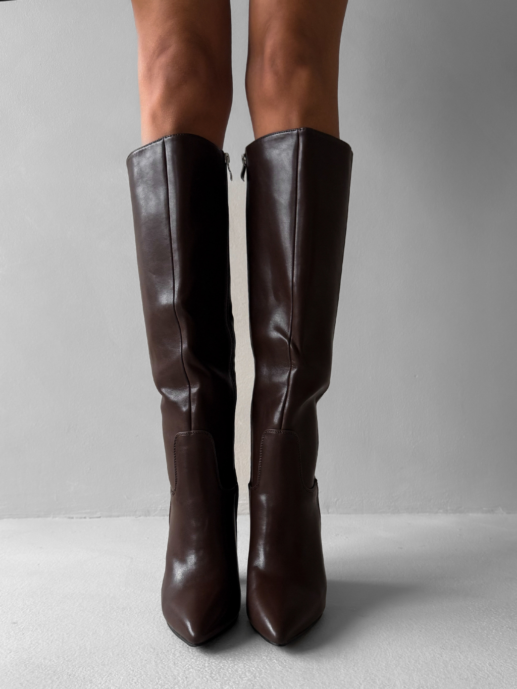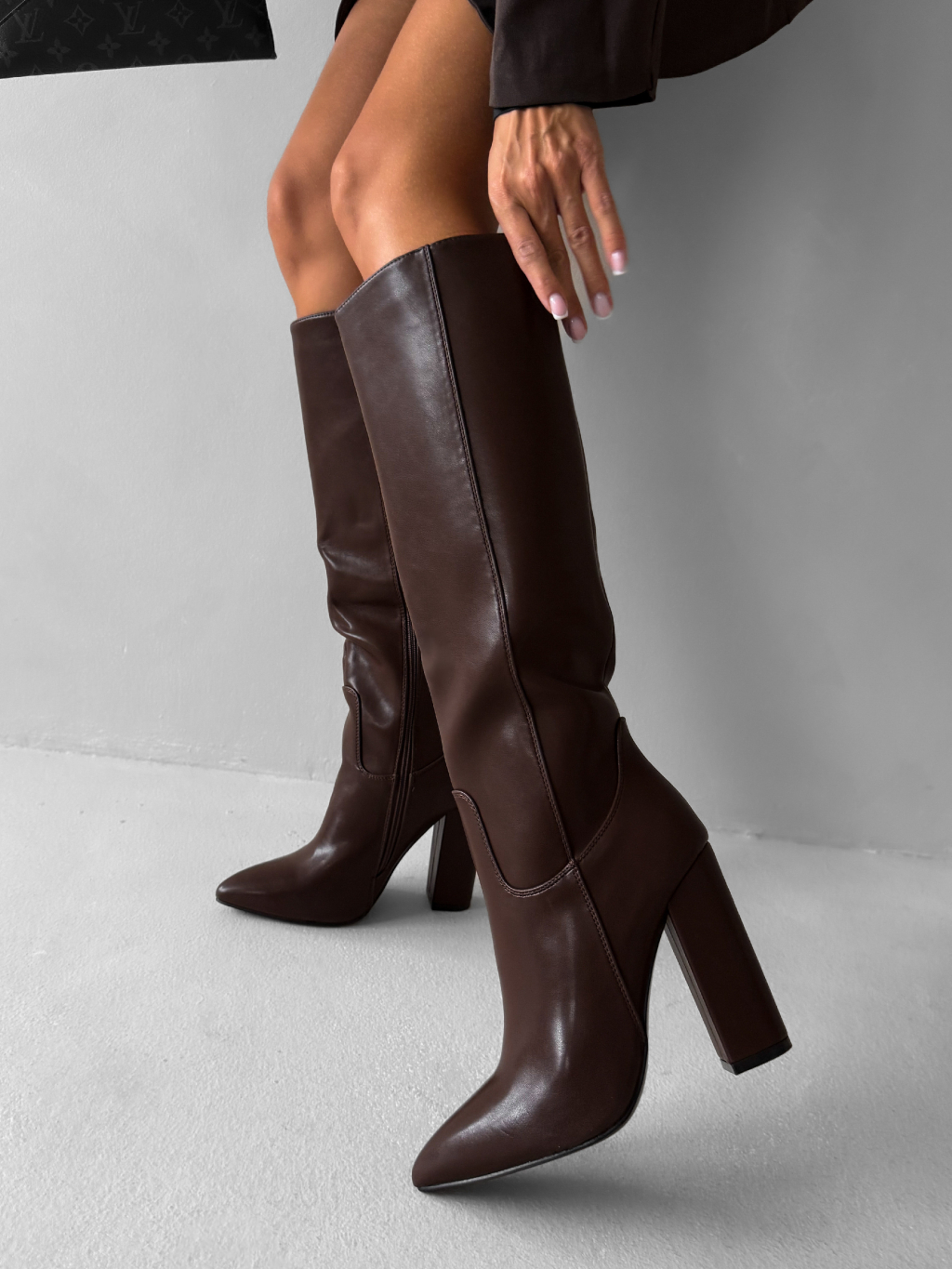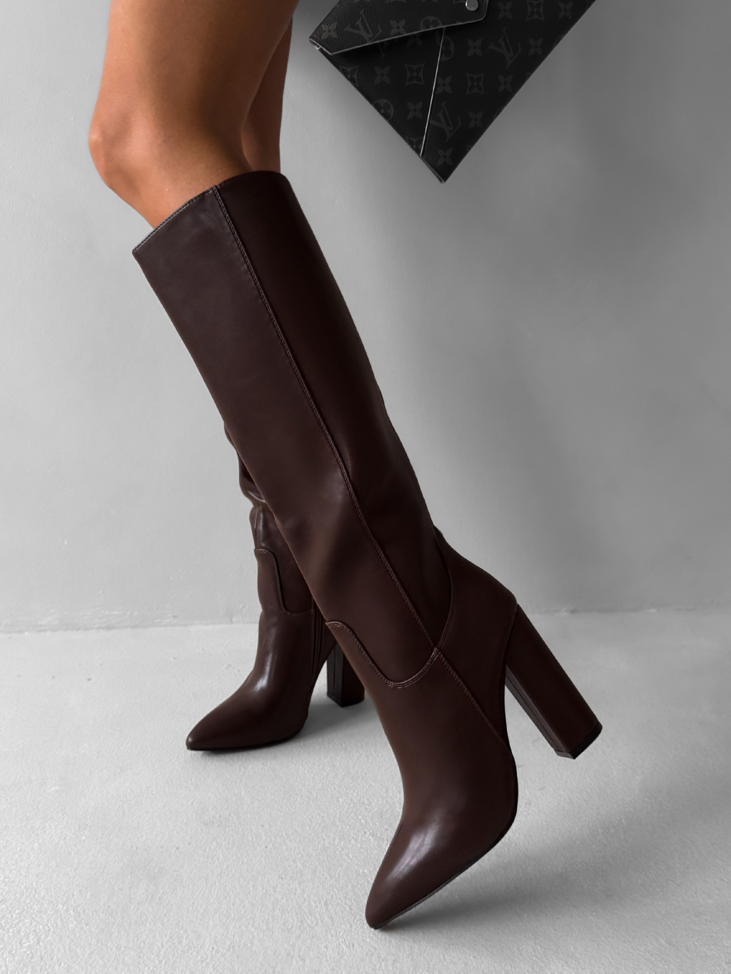 Hnědé koženkové vysoké kozačky ZYNTRA na podpatku