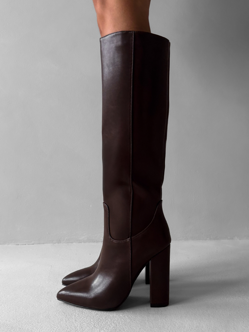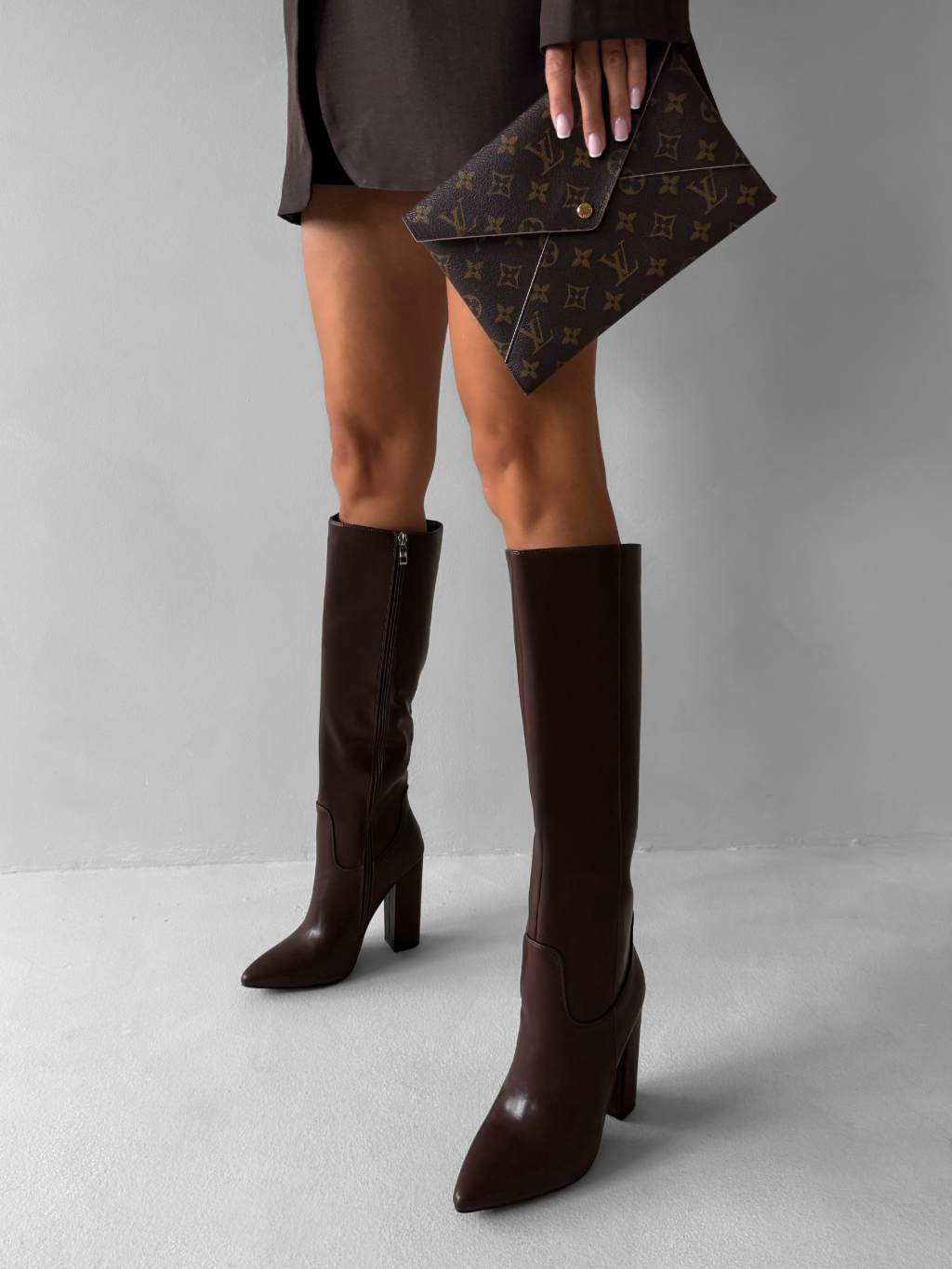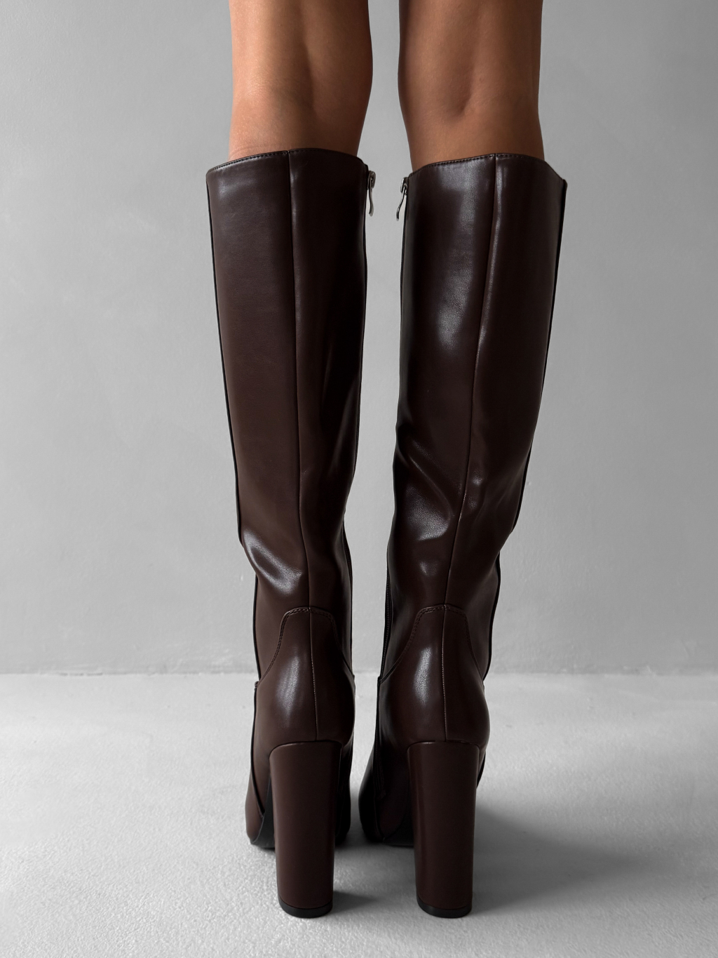 Hnědé koženkové vysoké kozačky ZYNTRA na podpatku