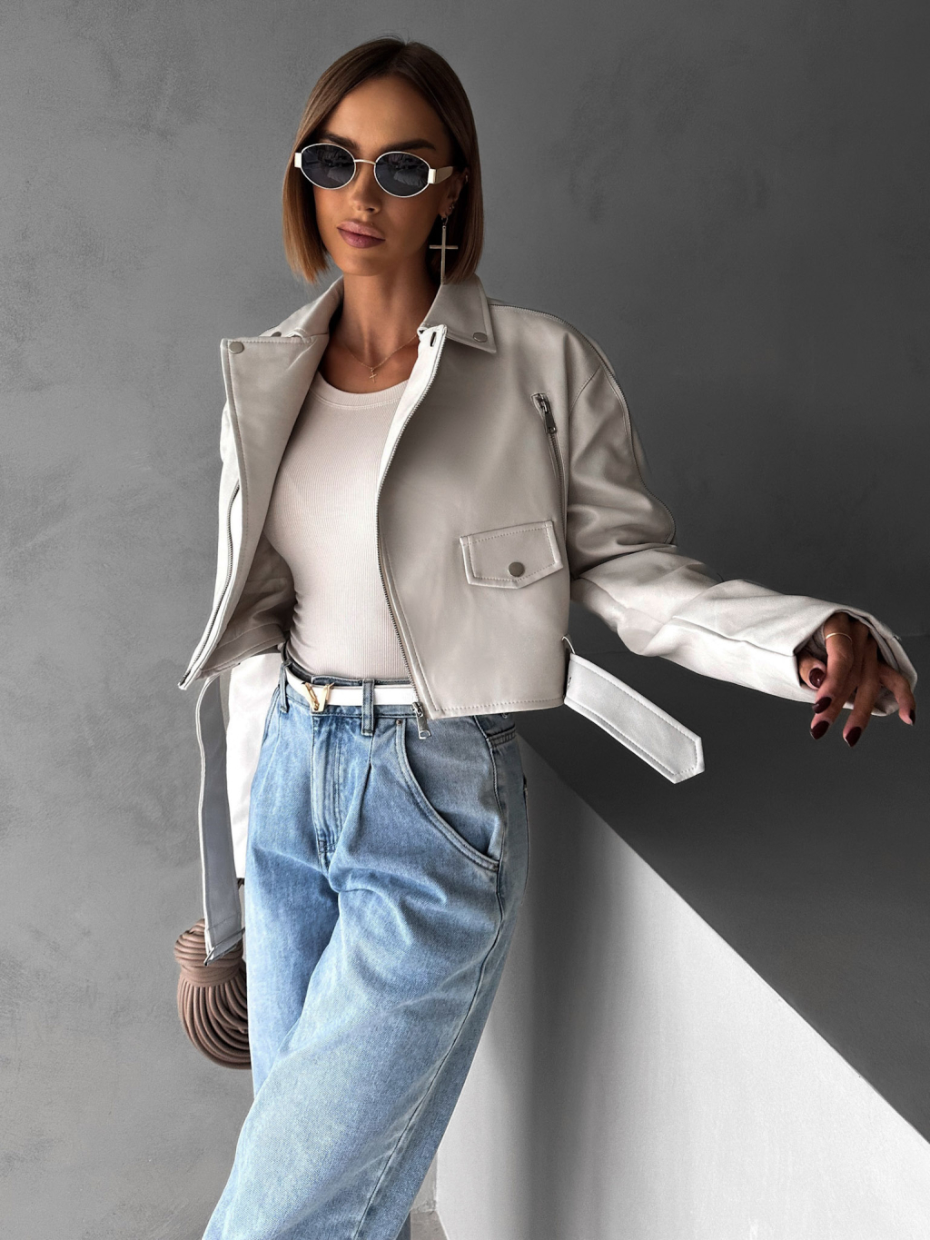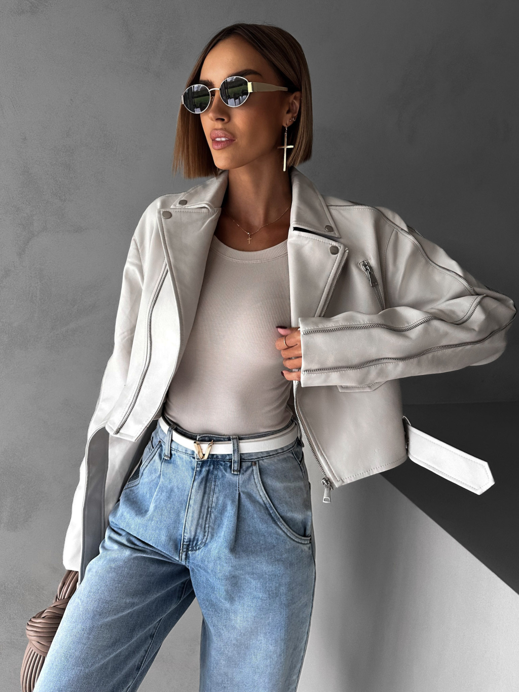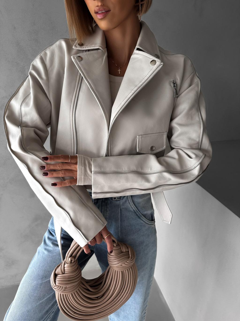 Krémová krátká biker koženková bunda BENEDIKTA