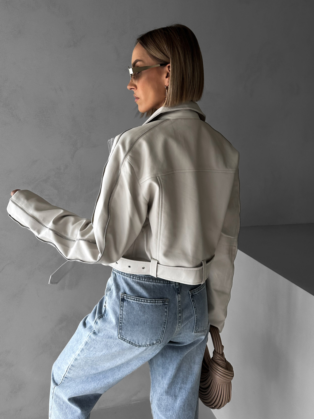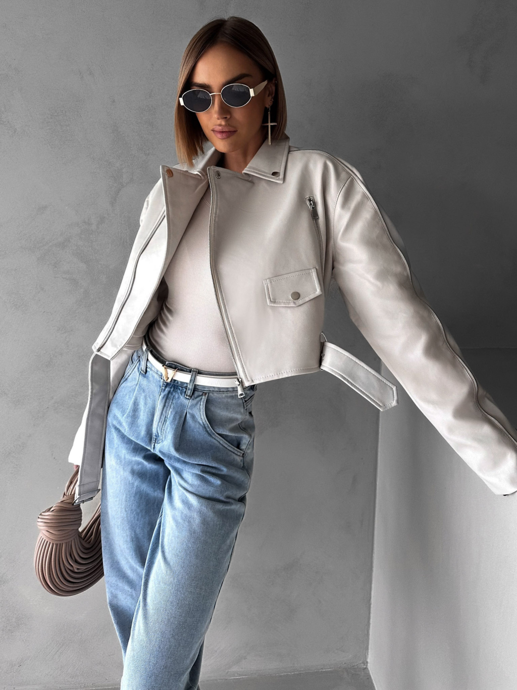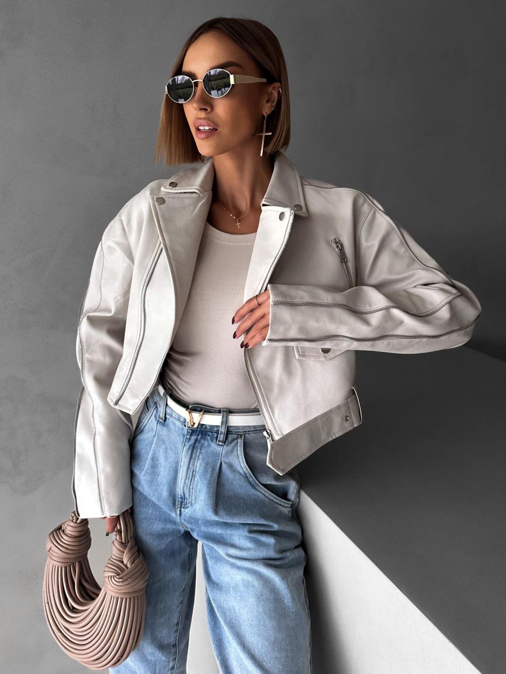 Krémová krátká biker koženková bunda BENEDIKTA